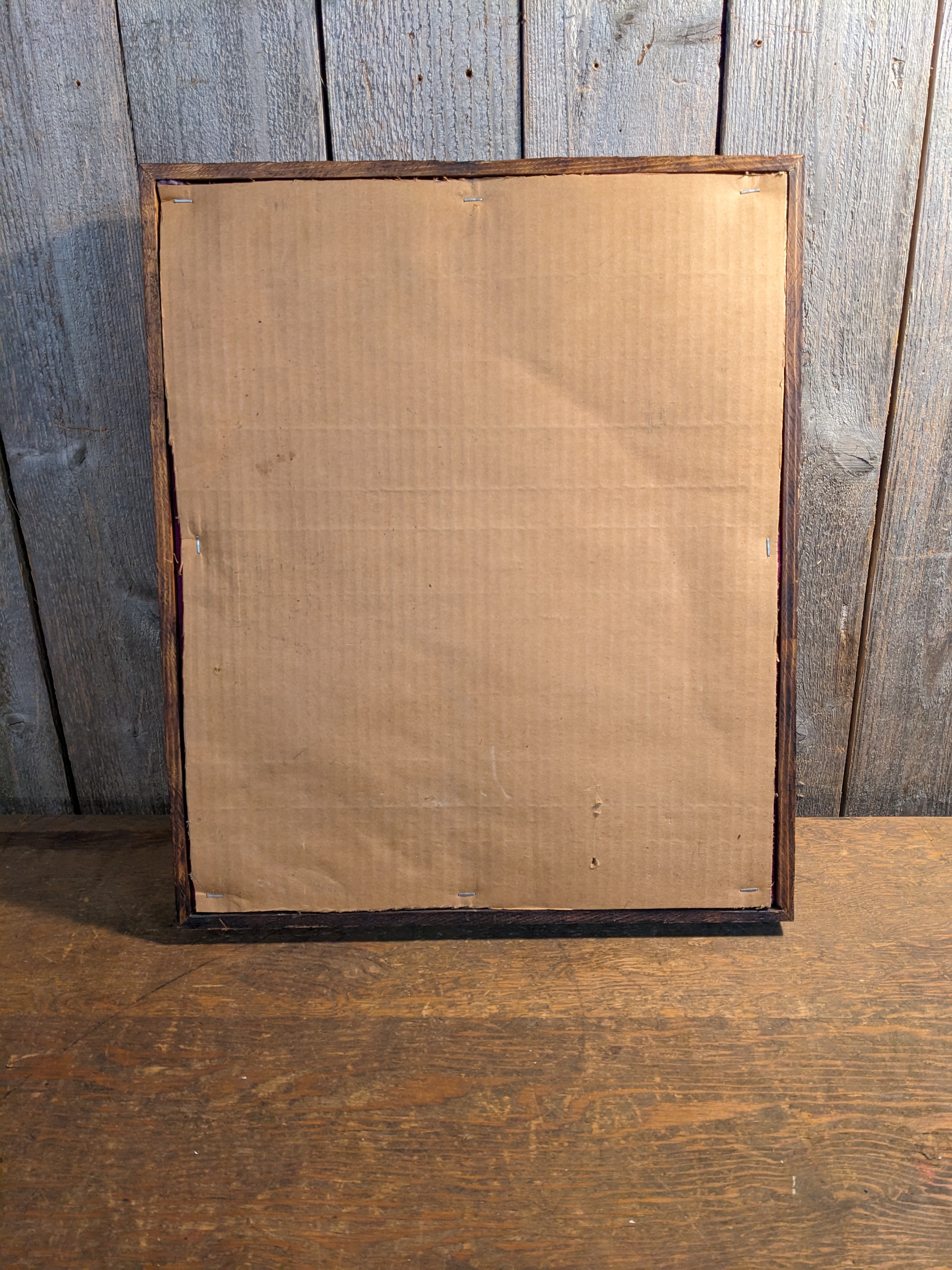 A vibrant string art sailboat with a plush purple velvet background. This piece is in great condition, with just a few scratches on the rustic wood frame. It measures 16 x 19 x 1.625 inches.