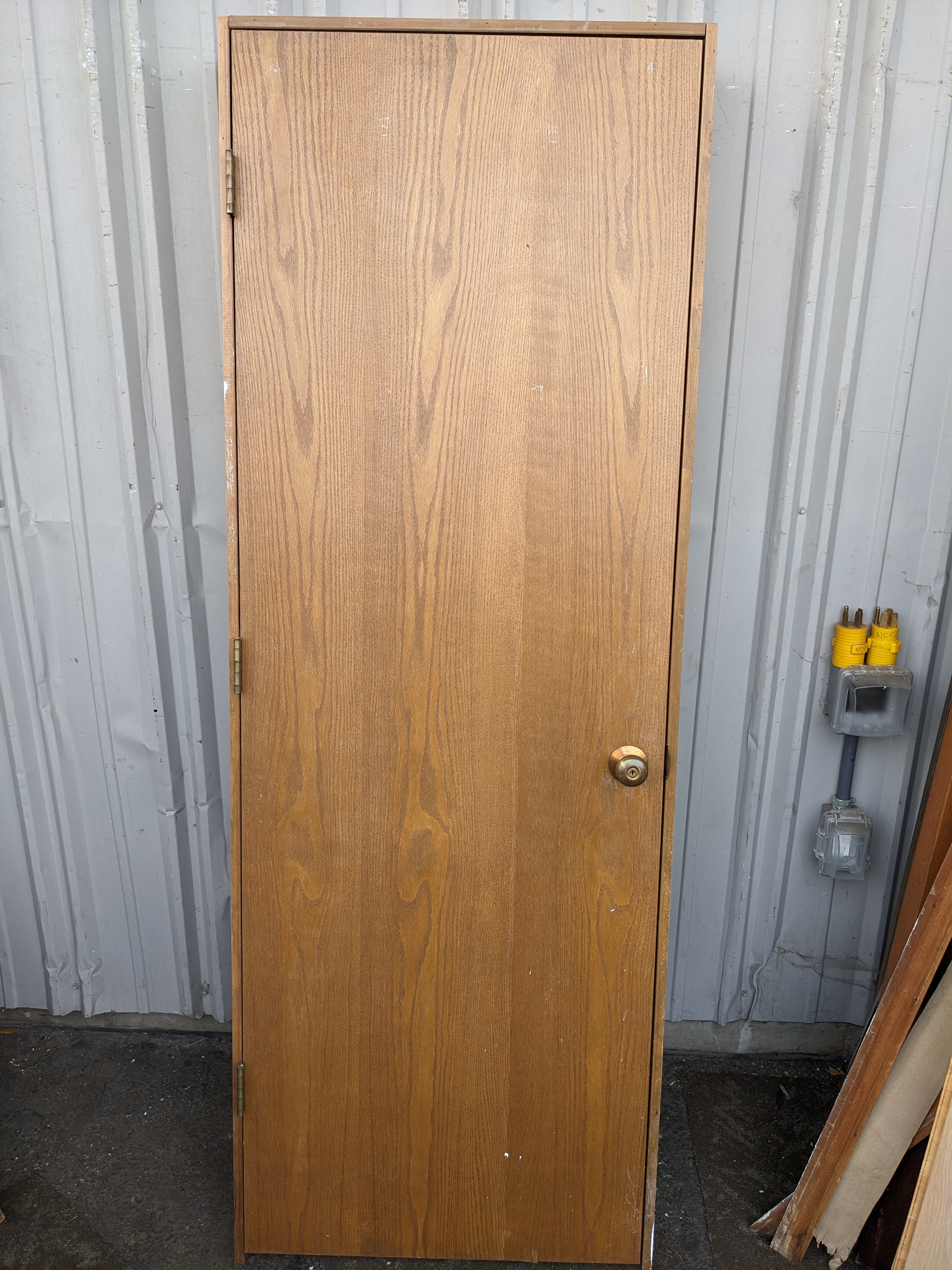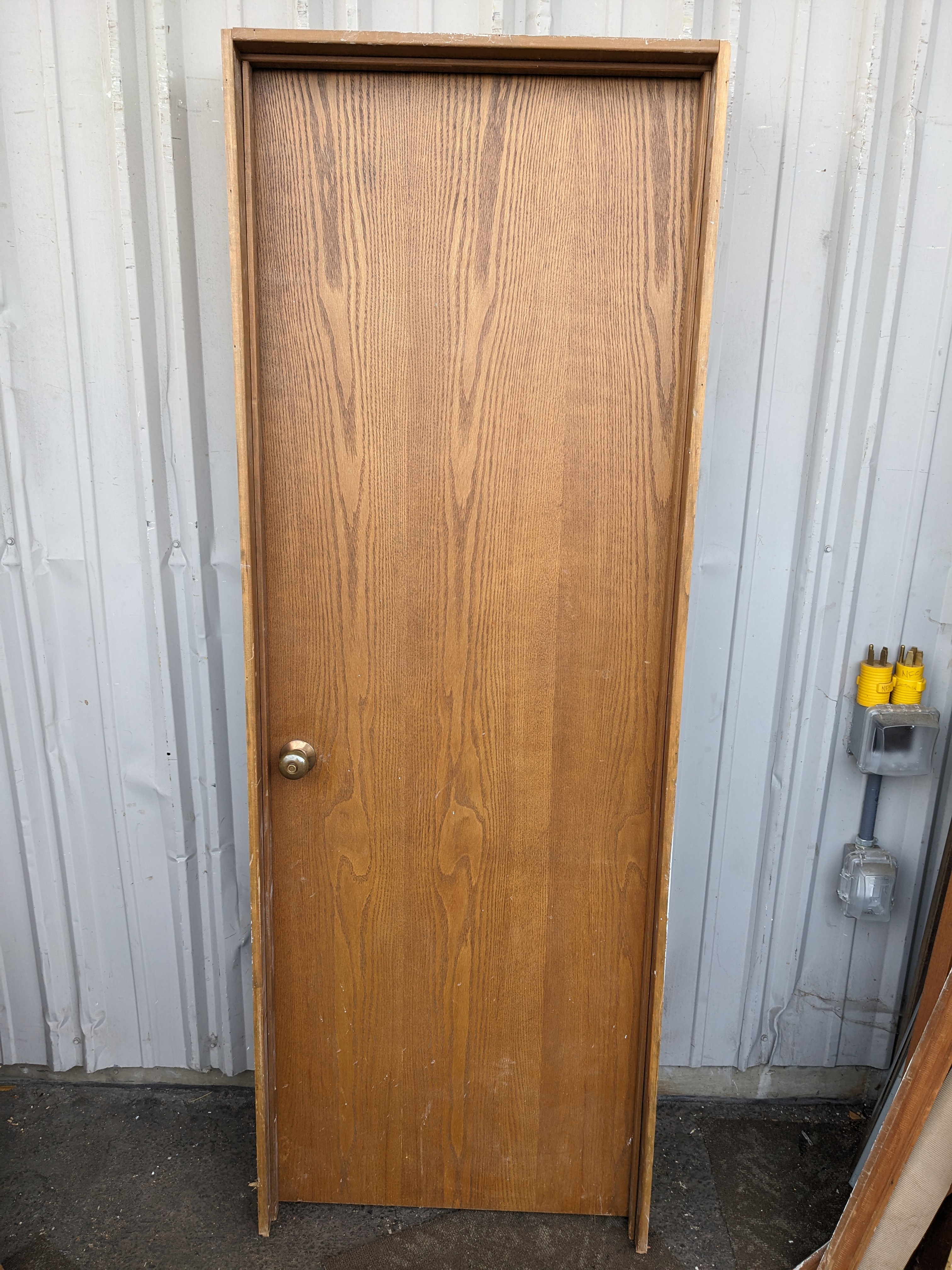This single panel Oak door is in decent shape, no major dings or scratches. It also features a push button locking knob. It is right swing. Photos are representational. Rough in measurement is 29 x 81 x 4.5. The door itself measures 27 x 80.