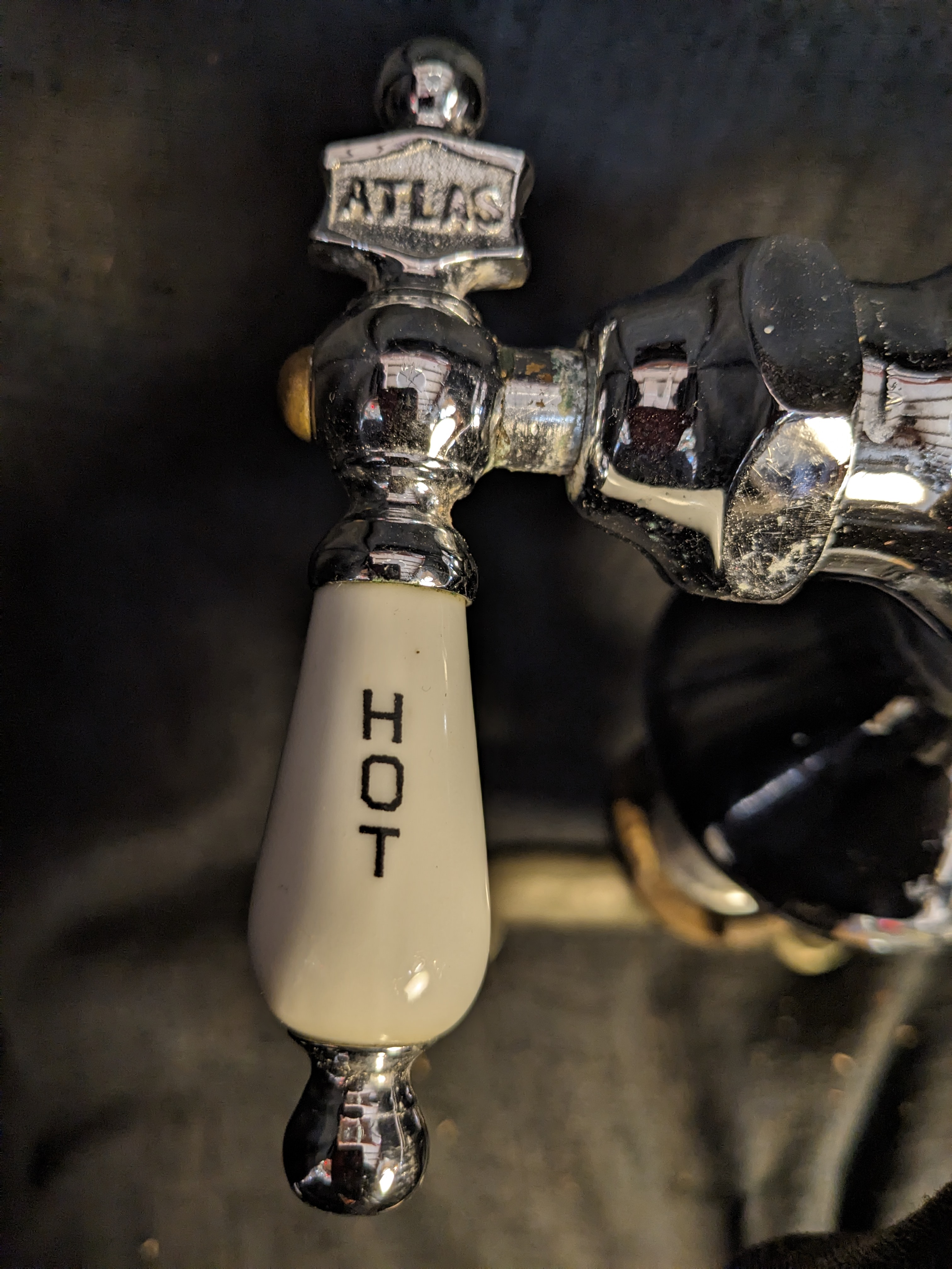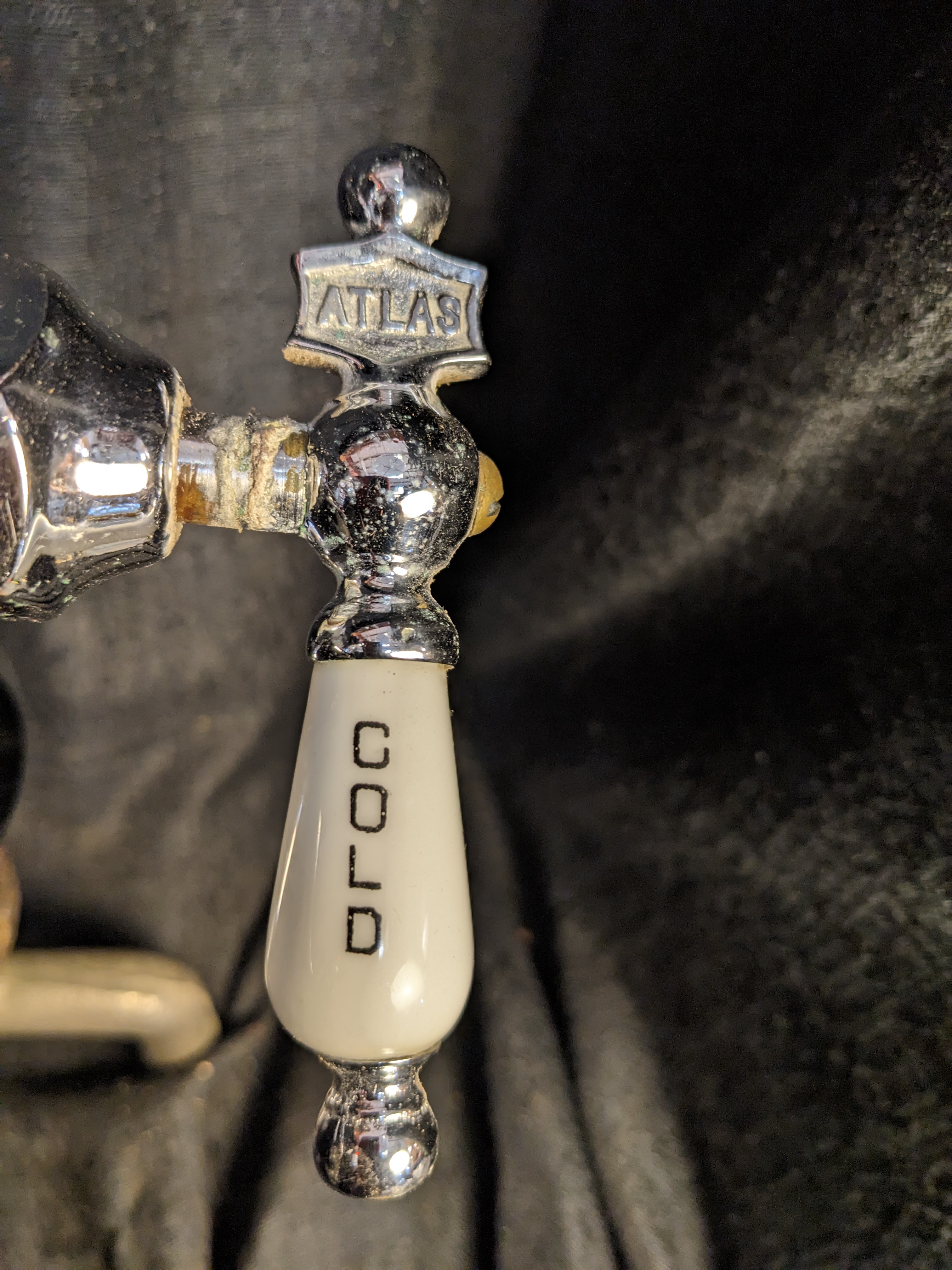In very good condition, we have an antique Atlas mixer faucet in a chrome finish. This faucet is built like a tank. Comes with the mixer piece, very important! This one has the porcelain hot\cold handles with the name Atlas on them.