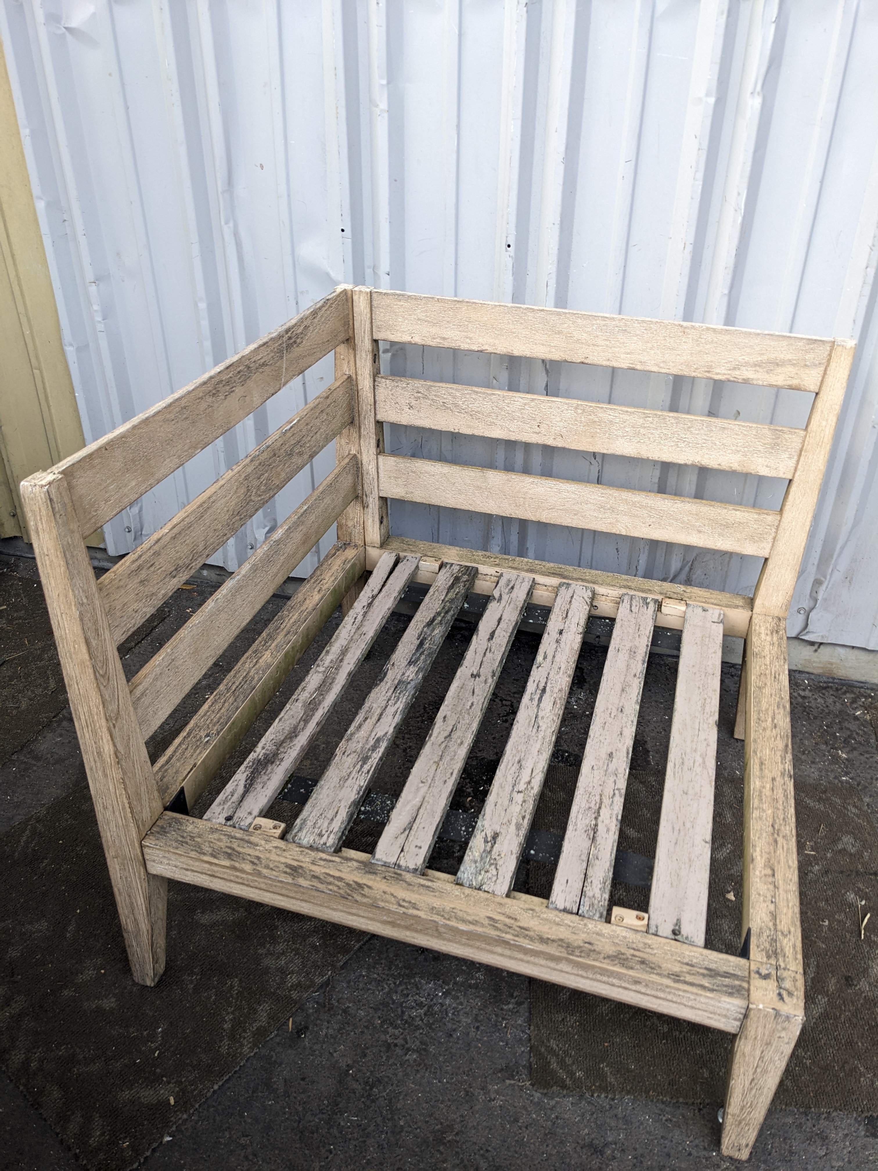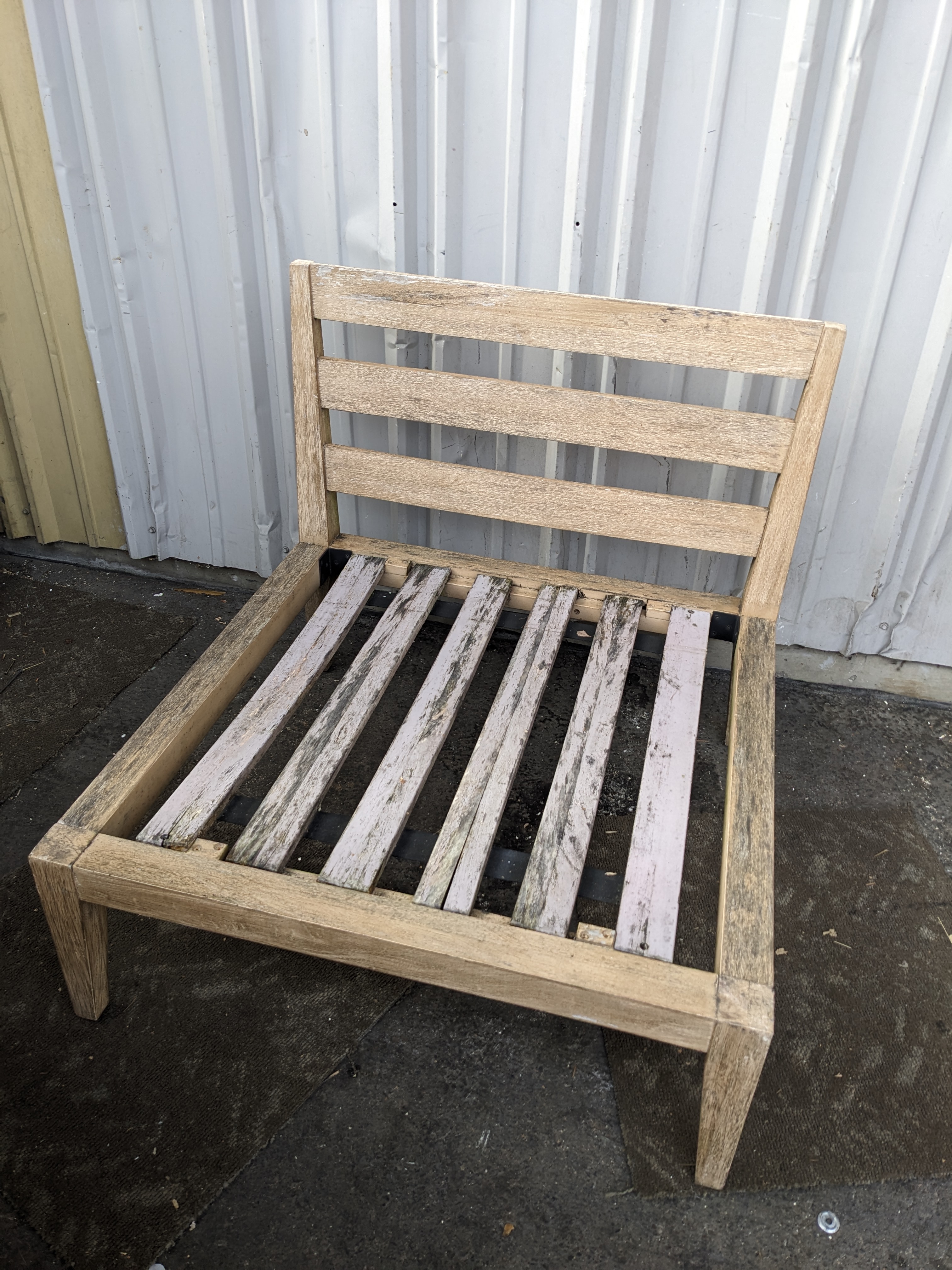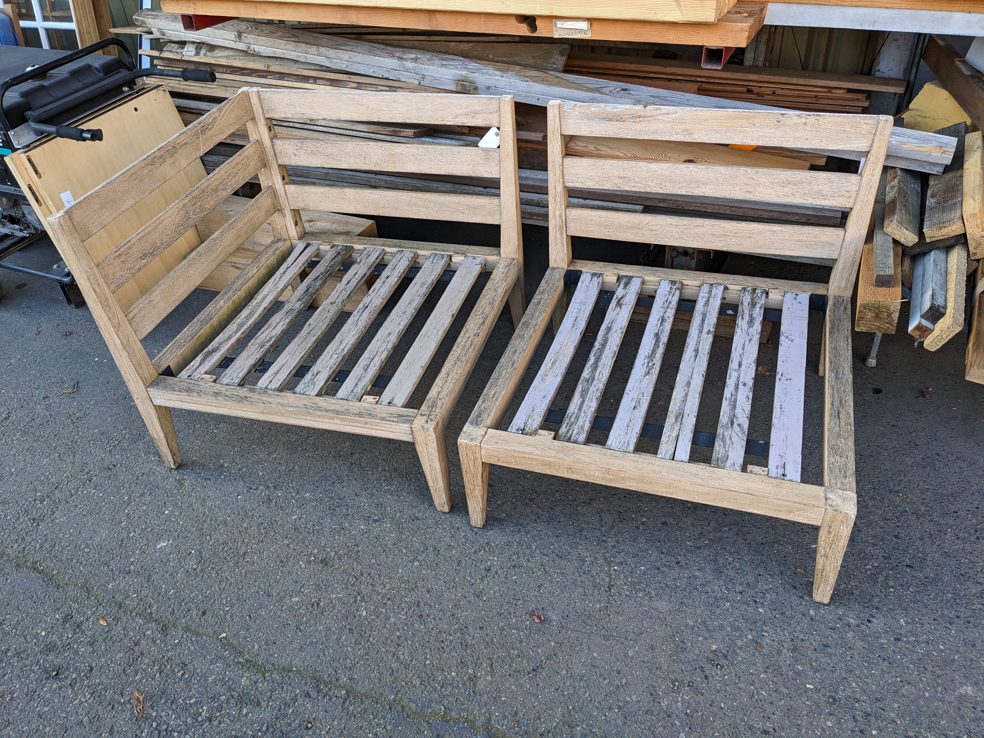These wooden patio chairs are great for a covered porch area. With a bit of cleaning and a set of new cushions these chairs would be ready for a new home. The construction is most likely teak or another hardwood that would hold up well to the elements.