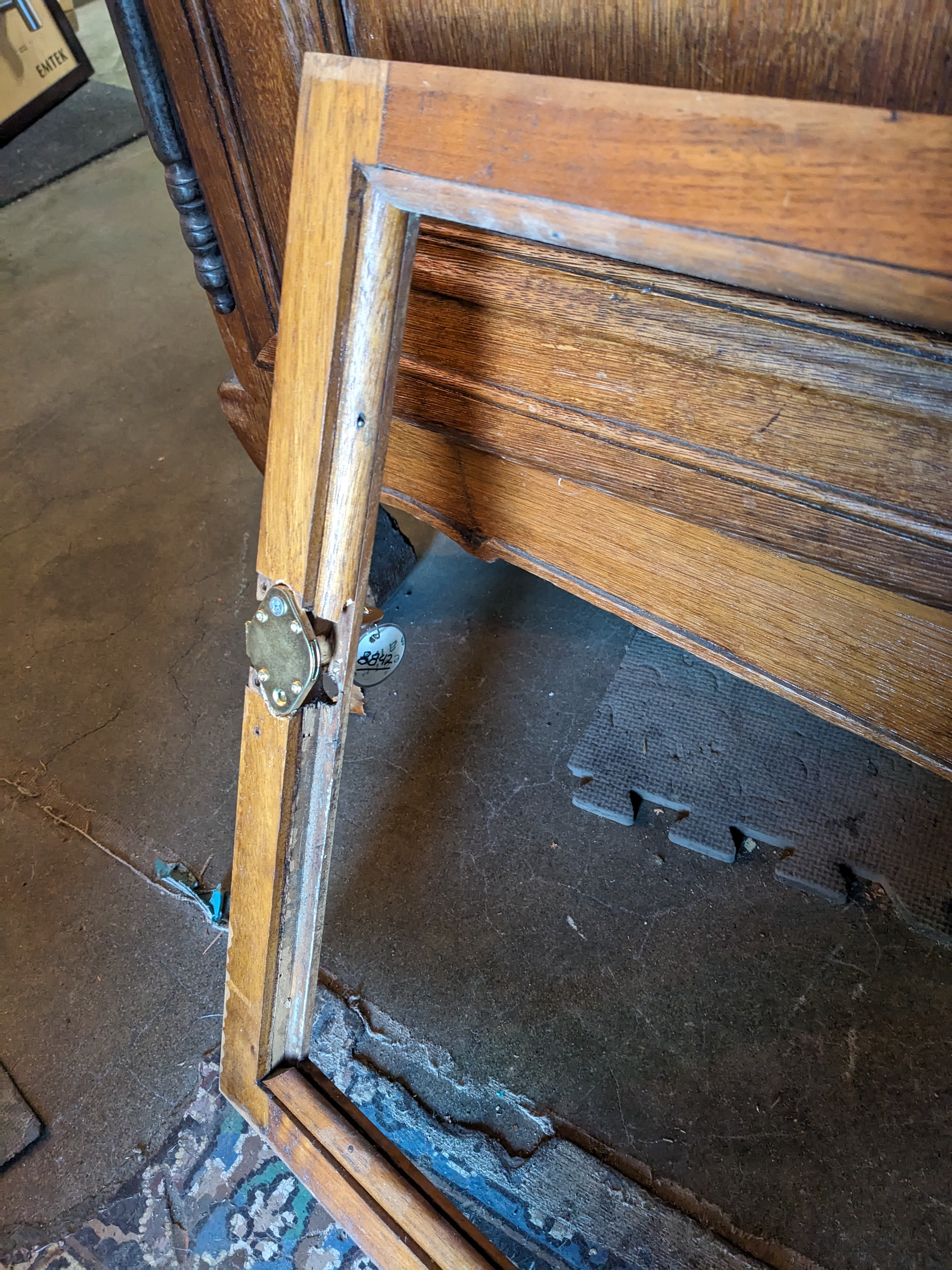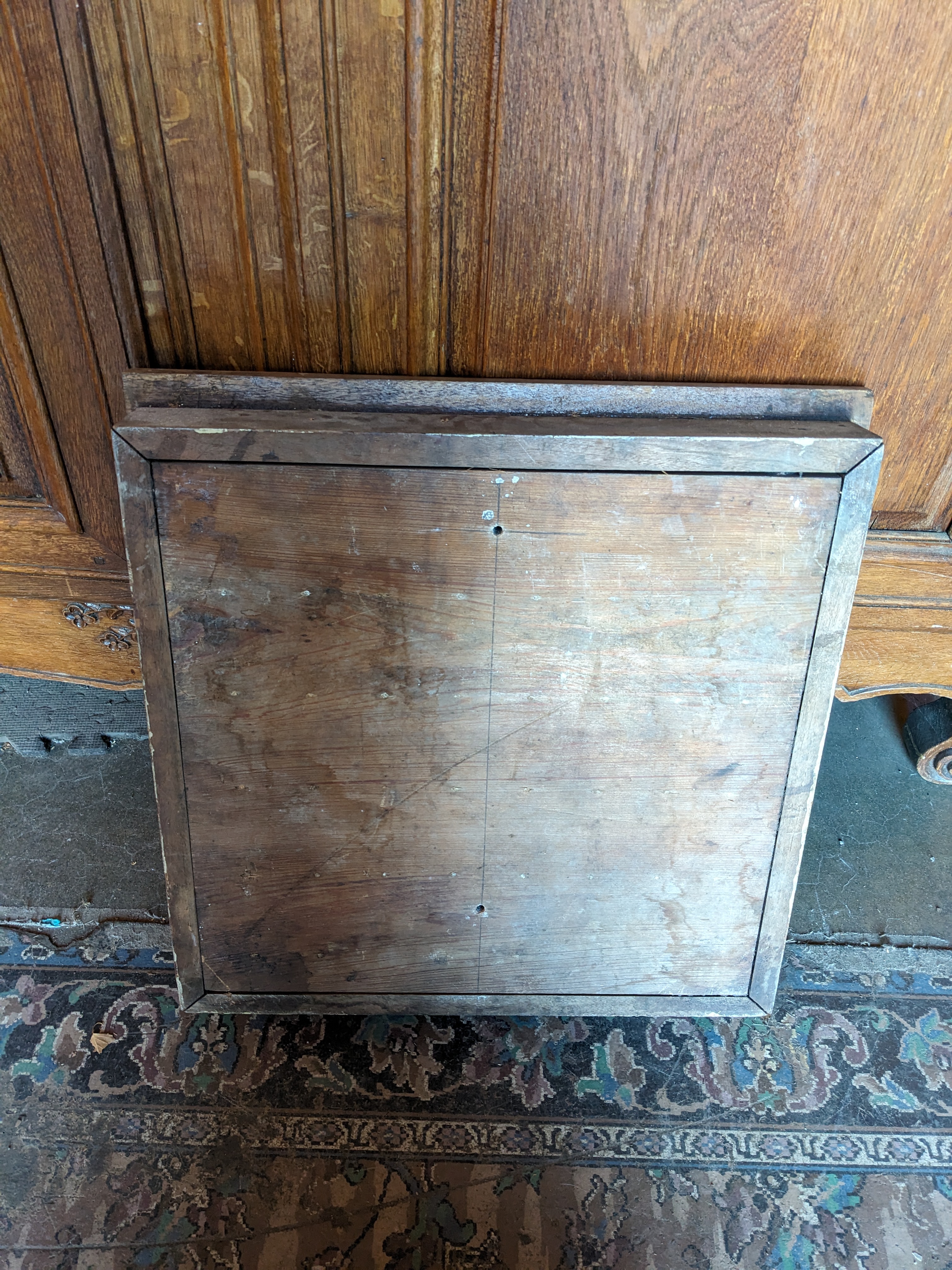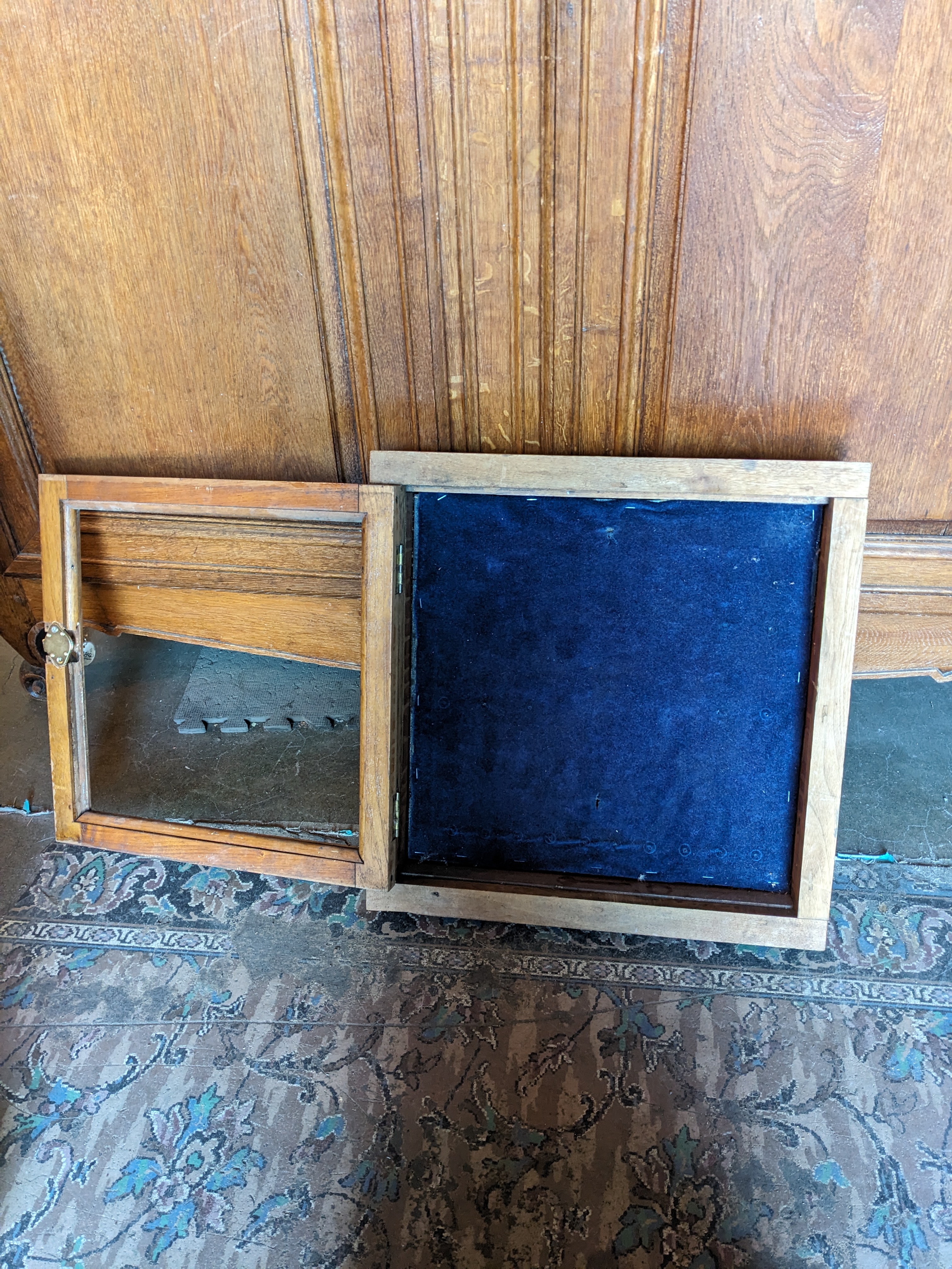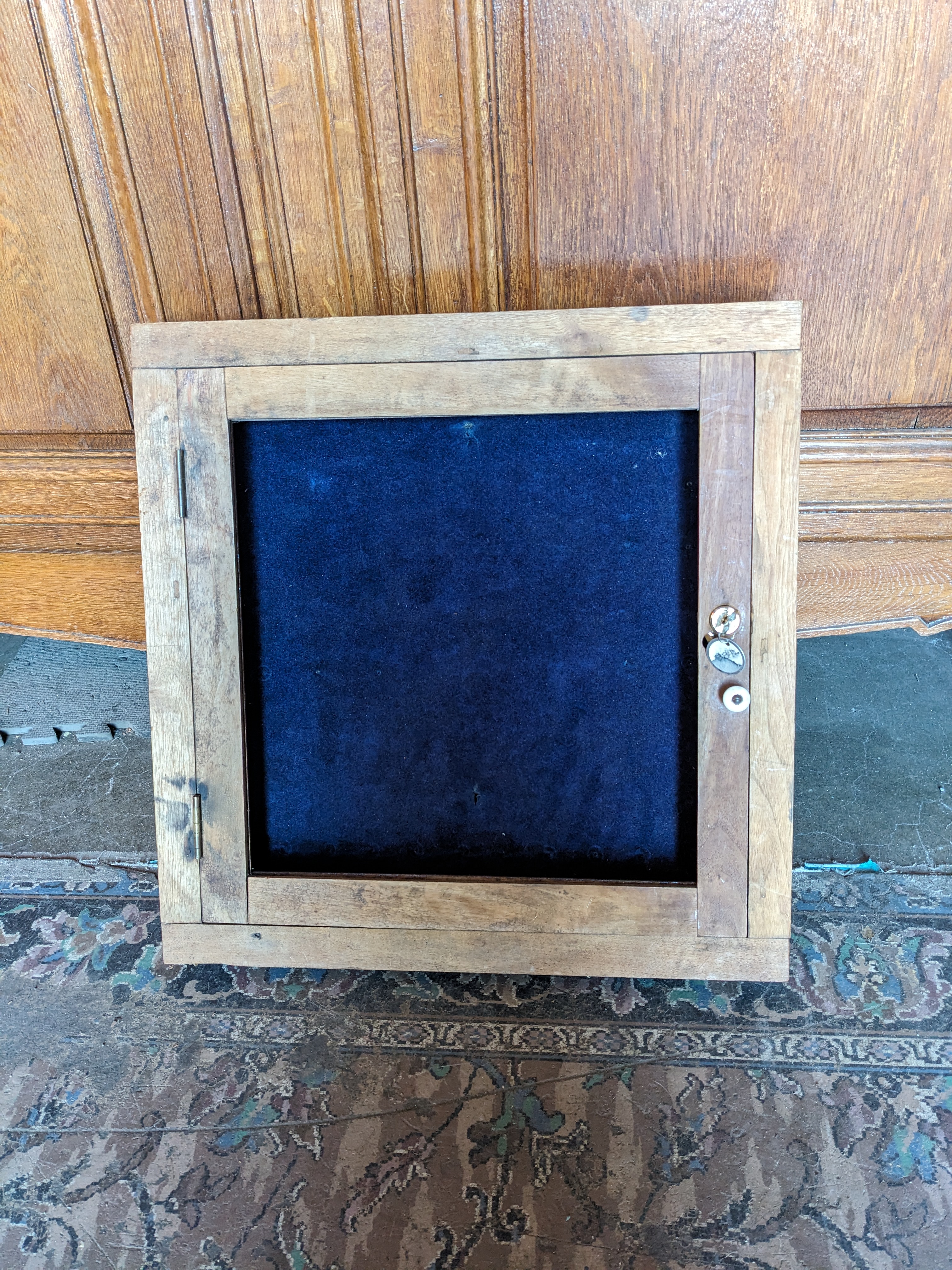 This vintage jewelry display case has plenty of charm! It's unfortunately missing its glass which could be replaced. A more modern locking mechanism has been added. It features a nice blue felt backdrop for displaying earrings or necklaces. This item measures 19.75 x 20 x 3.25.