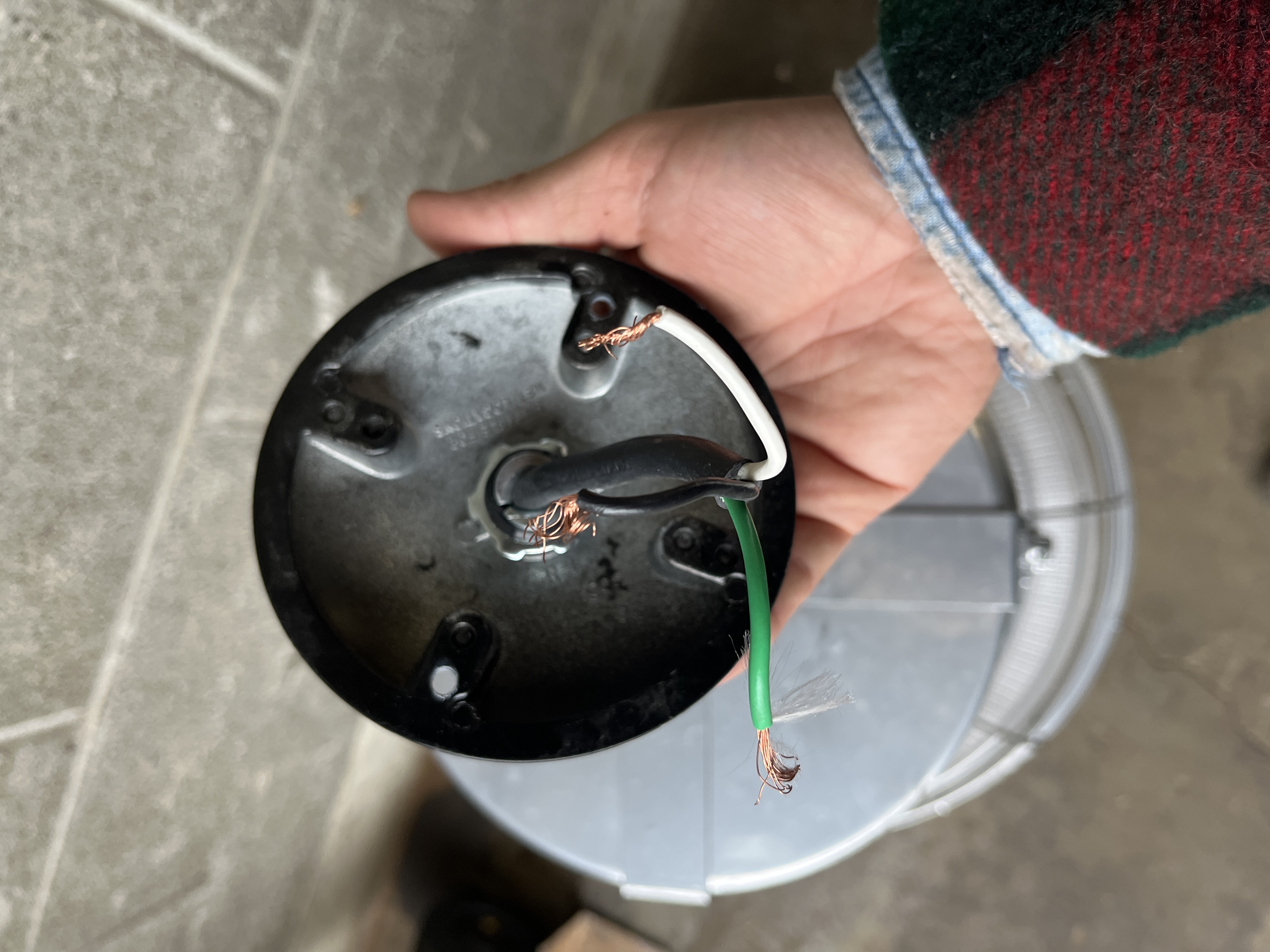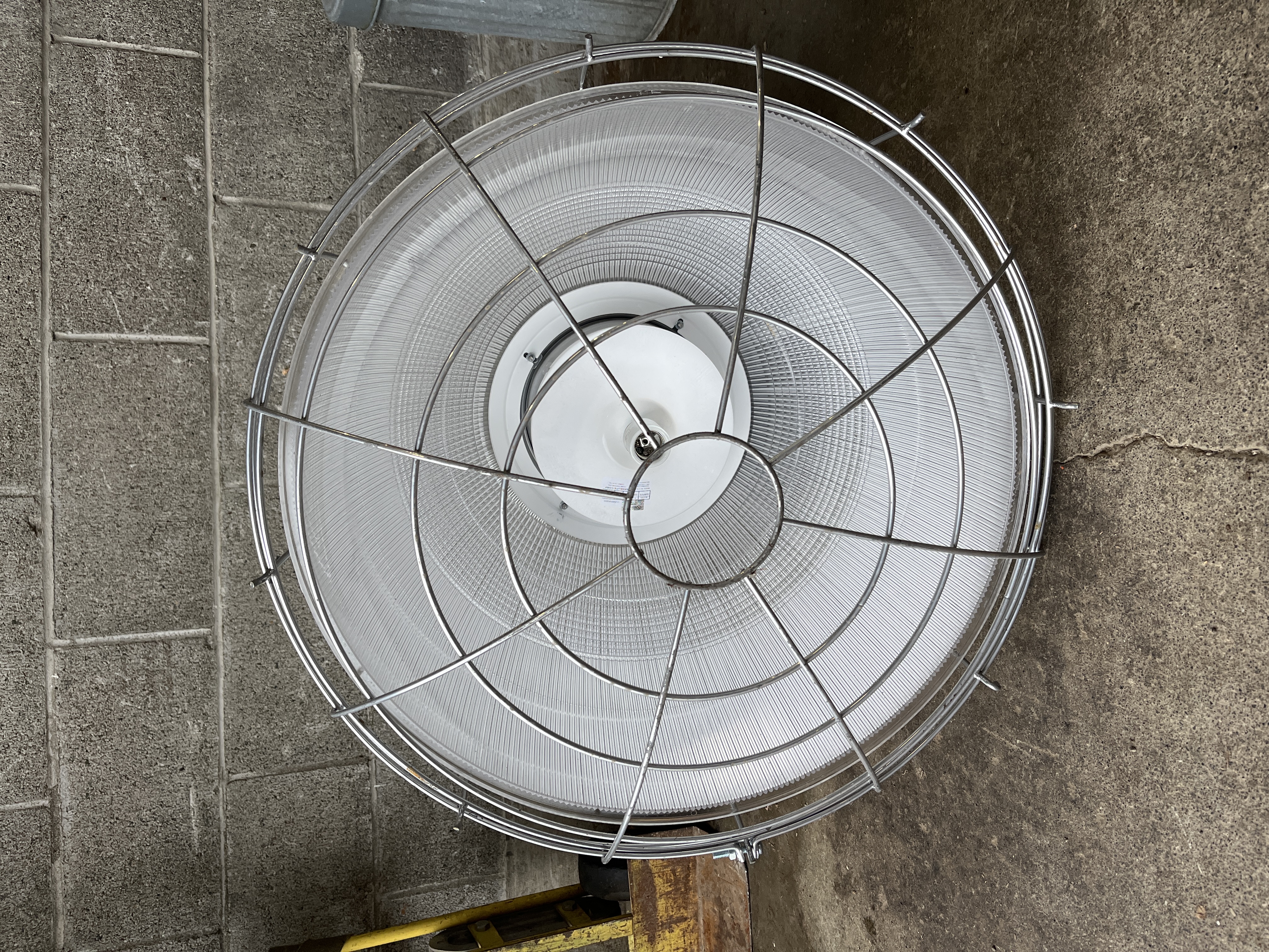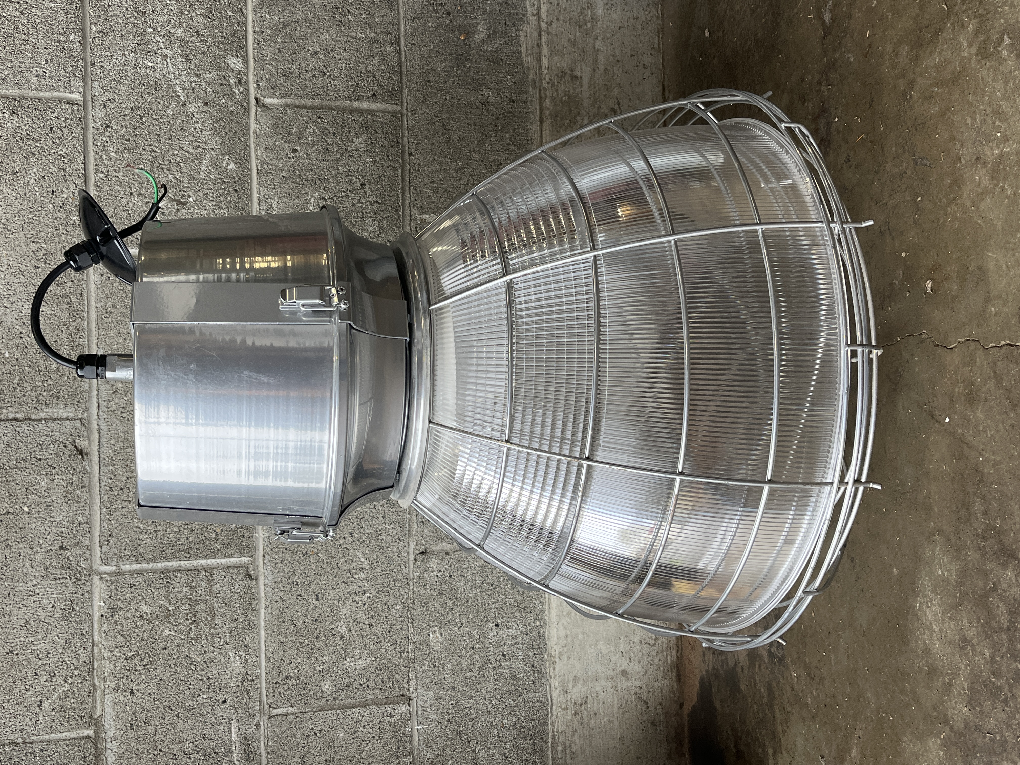 A large high output light for commercial style applications. It does state it is suitable for wet conditions and it has easy, standard style wiring. The shade is made of plastic, so it is relatively lightweight. Photos may be representational. Measures roughly 25 x 29 inches.