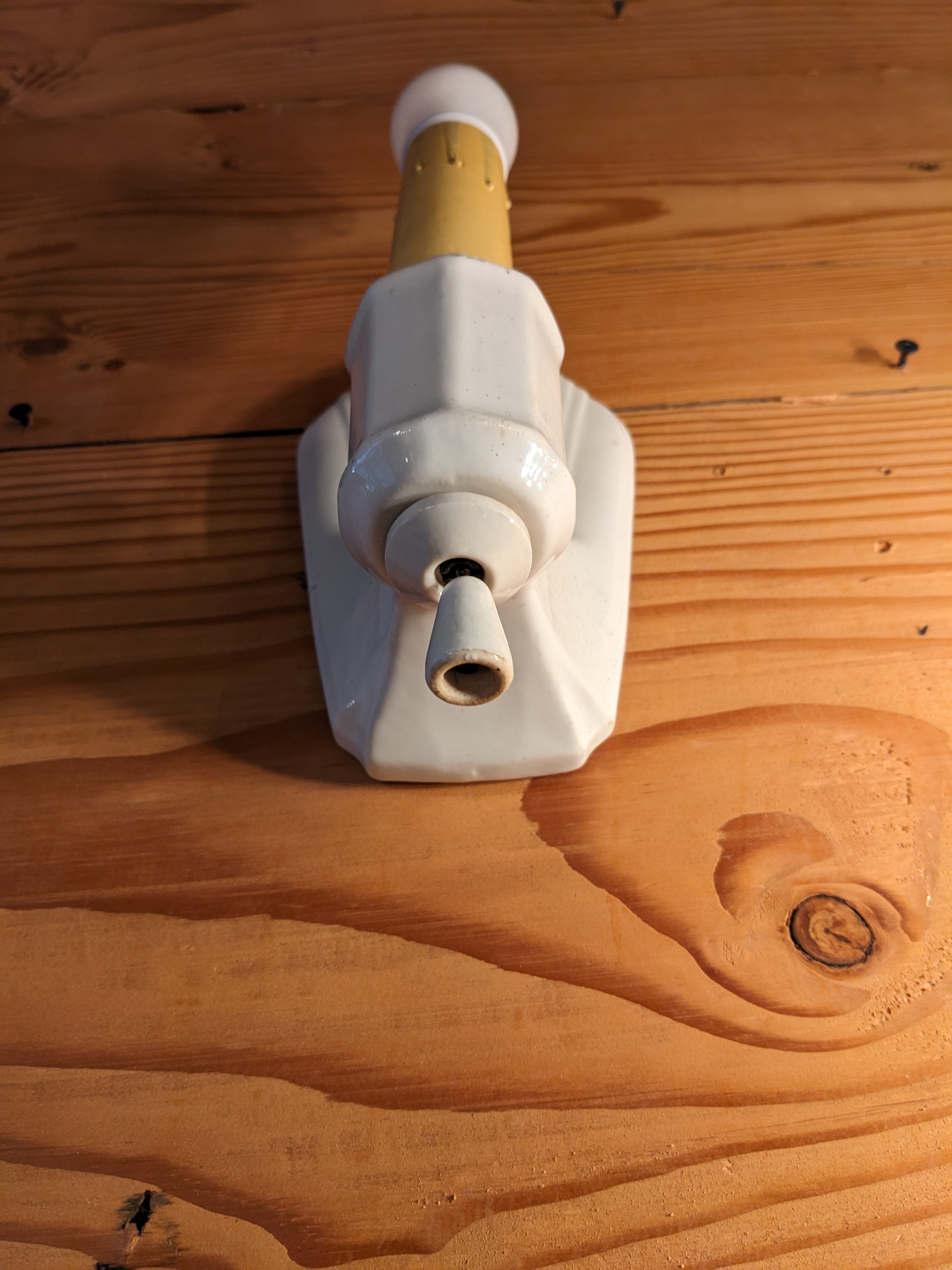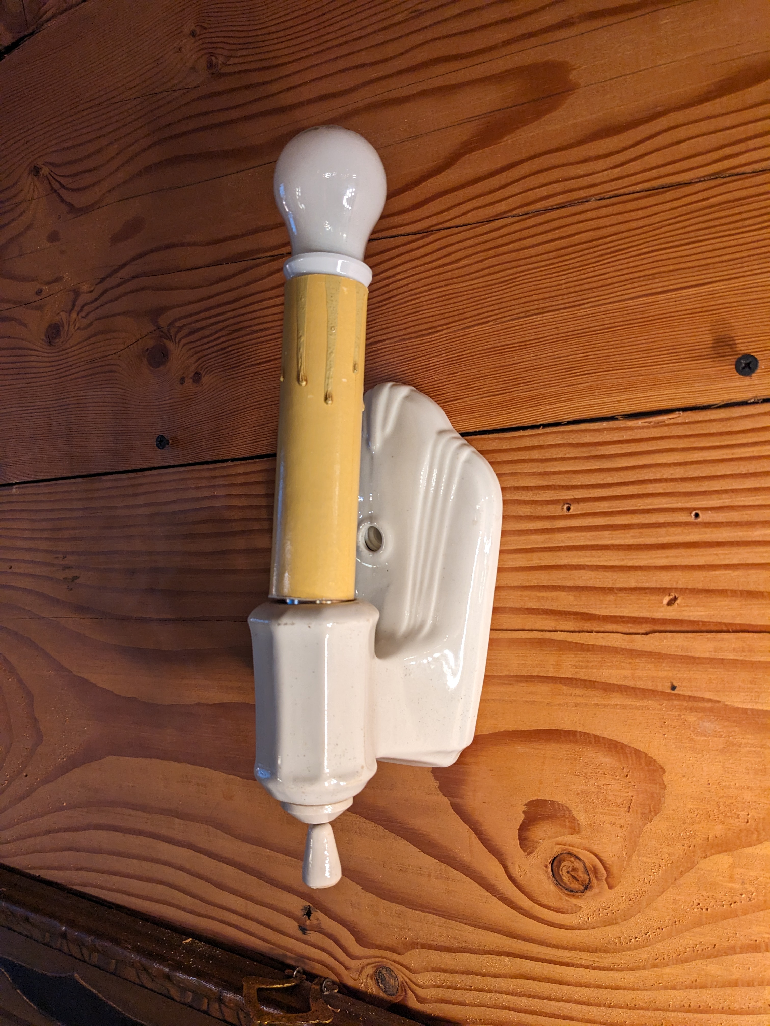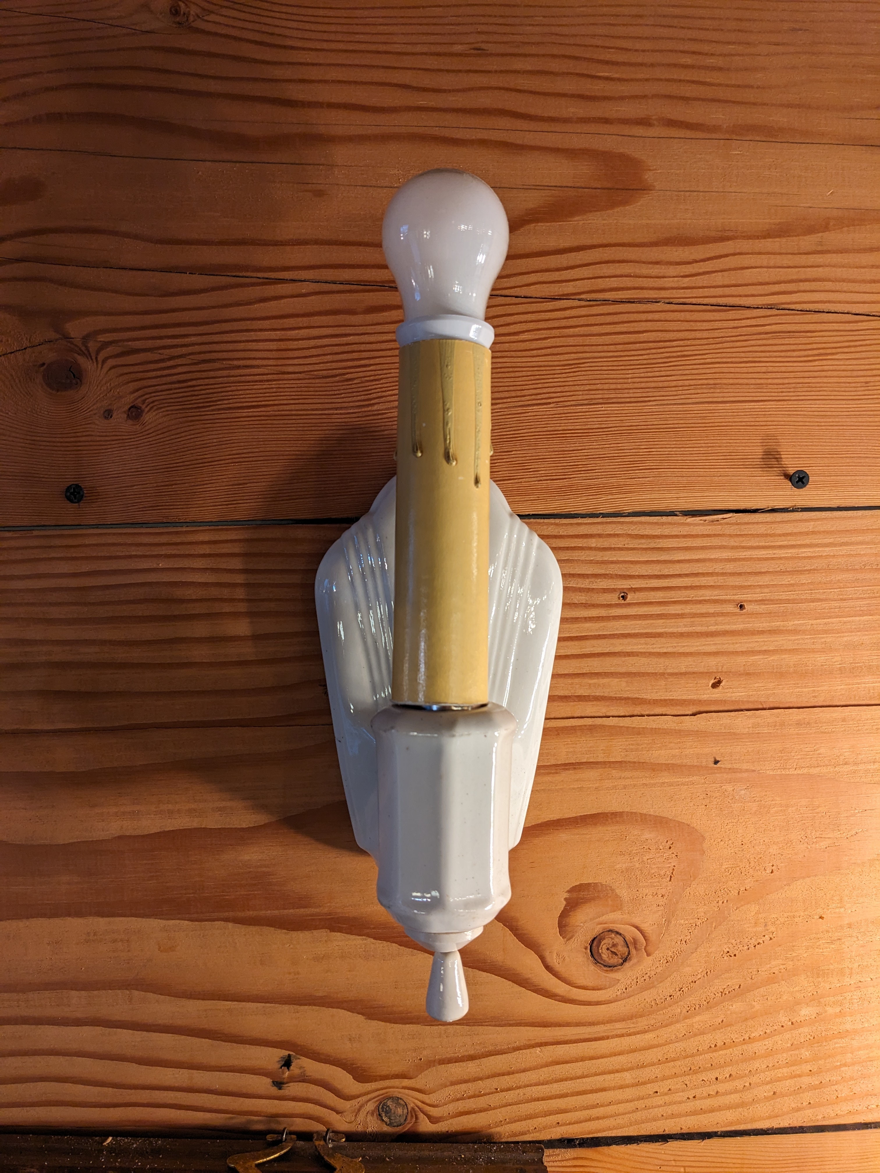 Check out these vintage art deco ceramic wall sconces! Donated to Earthwise out of a 1930s house renovation so these babies are authentic and still rockin after nearly 95 years. No cracks or scratches on the body, only minor remanence paint and drywall on the backside from their previous mounting. Pull switch to turn the light on and off. And outlets! The wire coverings could be replaced as the rope has frayed over time. This Specific sconce has the same body style and pull switch as the 105478 sconces, but no outlet.