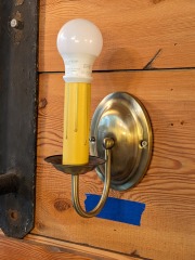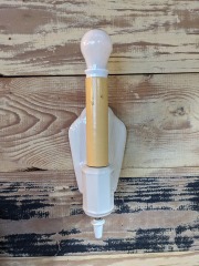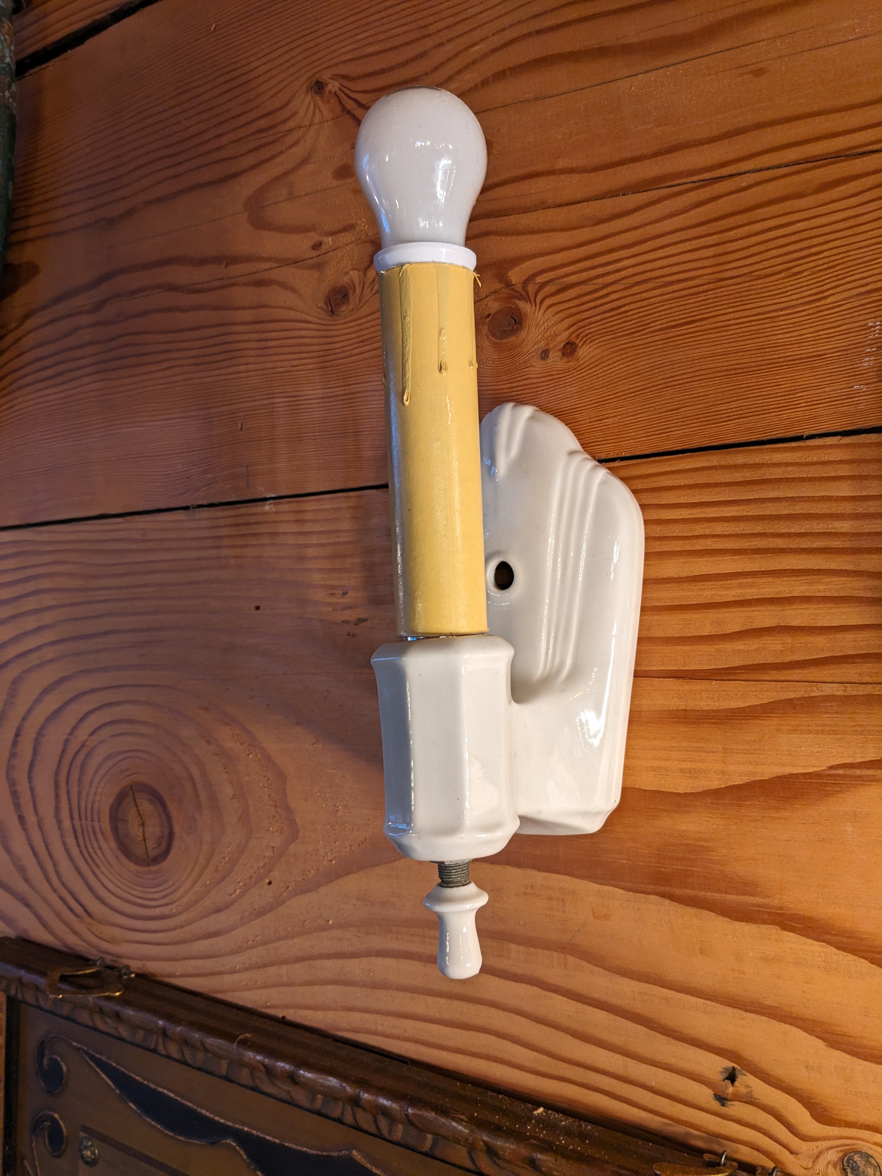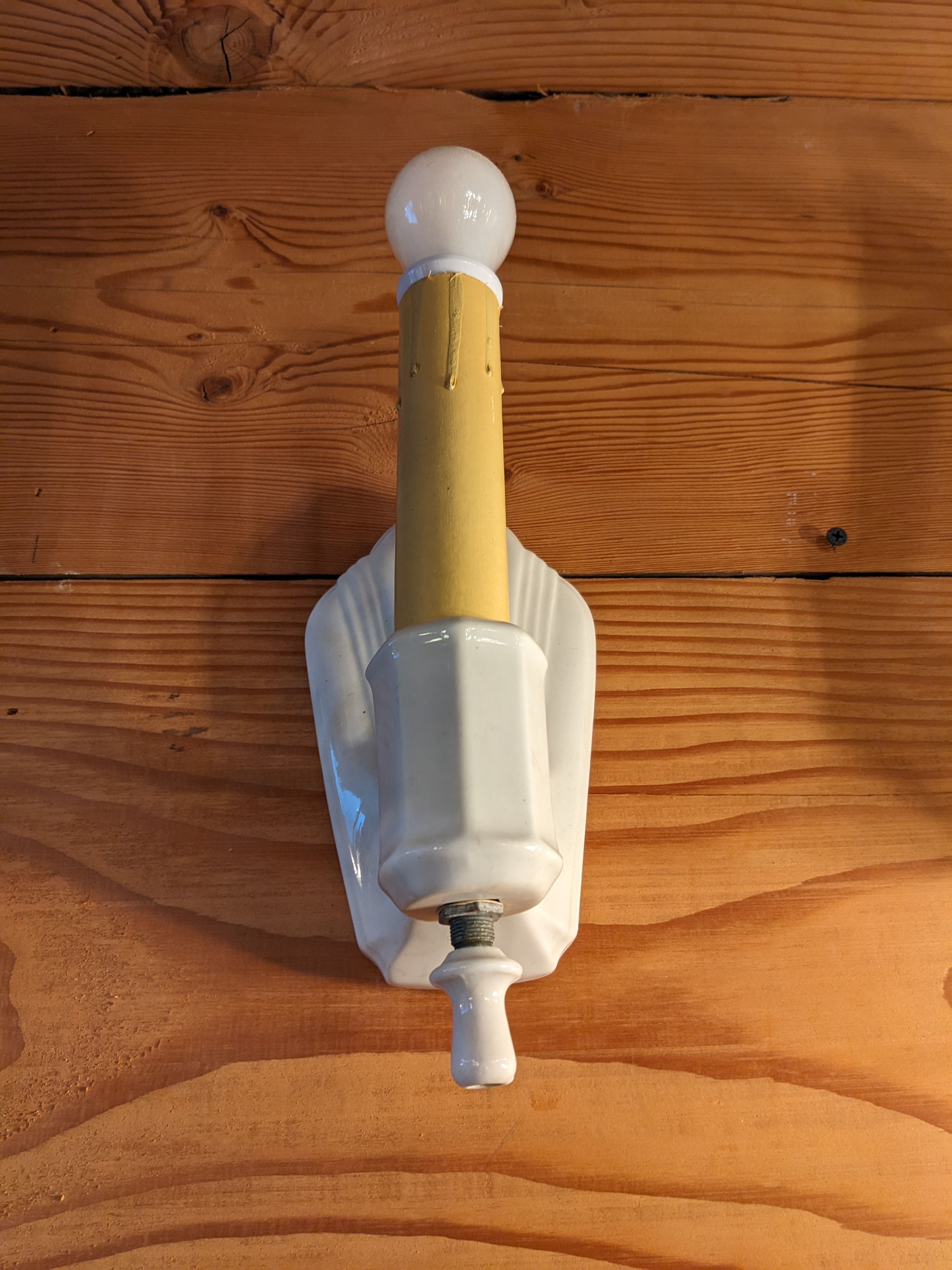 Check out these vintage art deco ceramic wall sconces! Donated to Earthwise out of a 1930s house renovation so these babies are authentic and still rockin after nearly 95 years. No cracks or scratches on the body, only minor remanence paint and drywall on the backside from their previous mounting. Pull switch to turn the light on and off. The wire coverings could be replaced as the rope has frayed over time. This Specific sconce has the same body style as the 105486 sconces, but a different on/off pull on the bottom