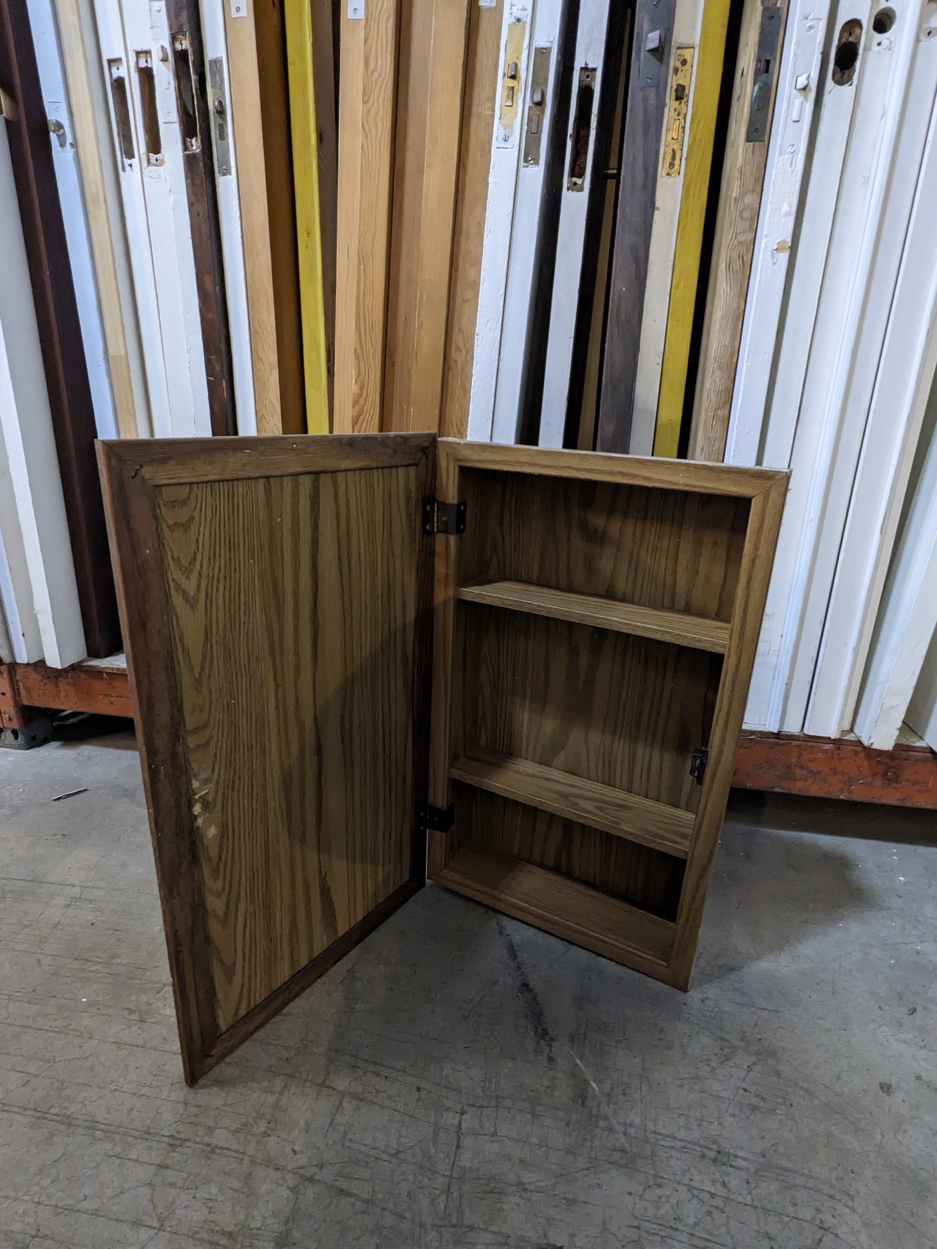 It's condition is good, it's shelves are durable and stable. There are no dents or any markings or bruises on the wood. It's such a cute piece.