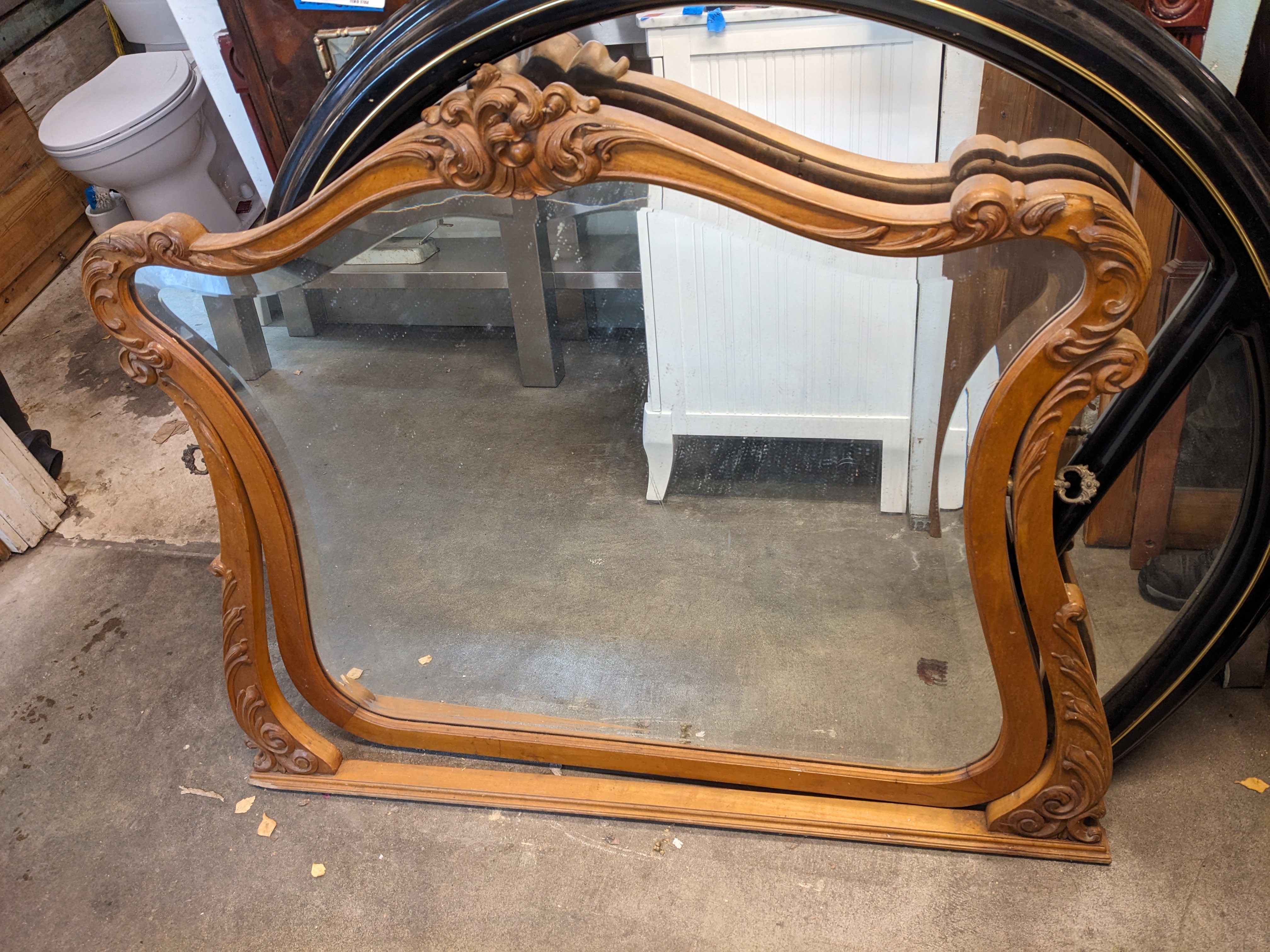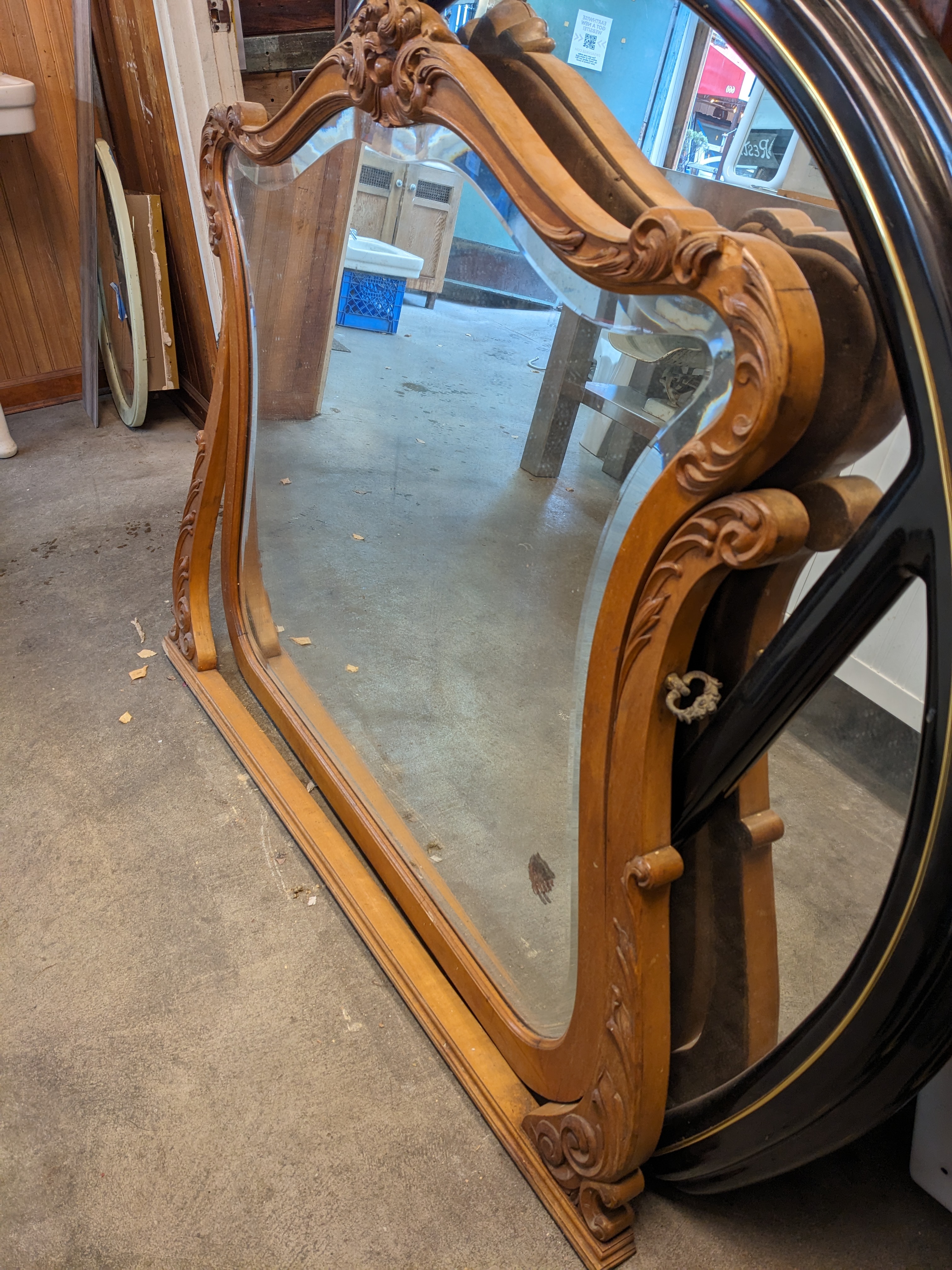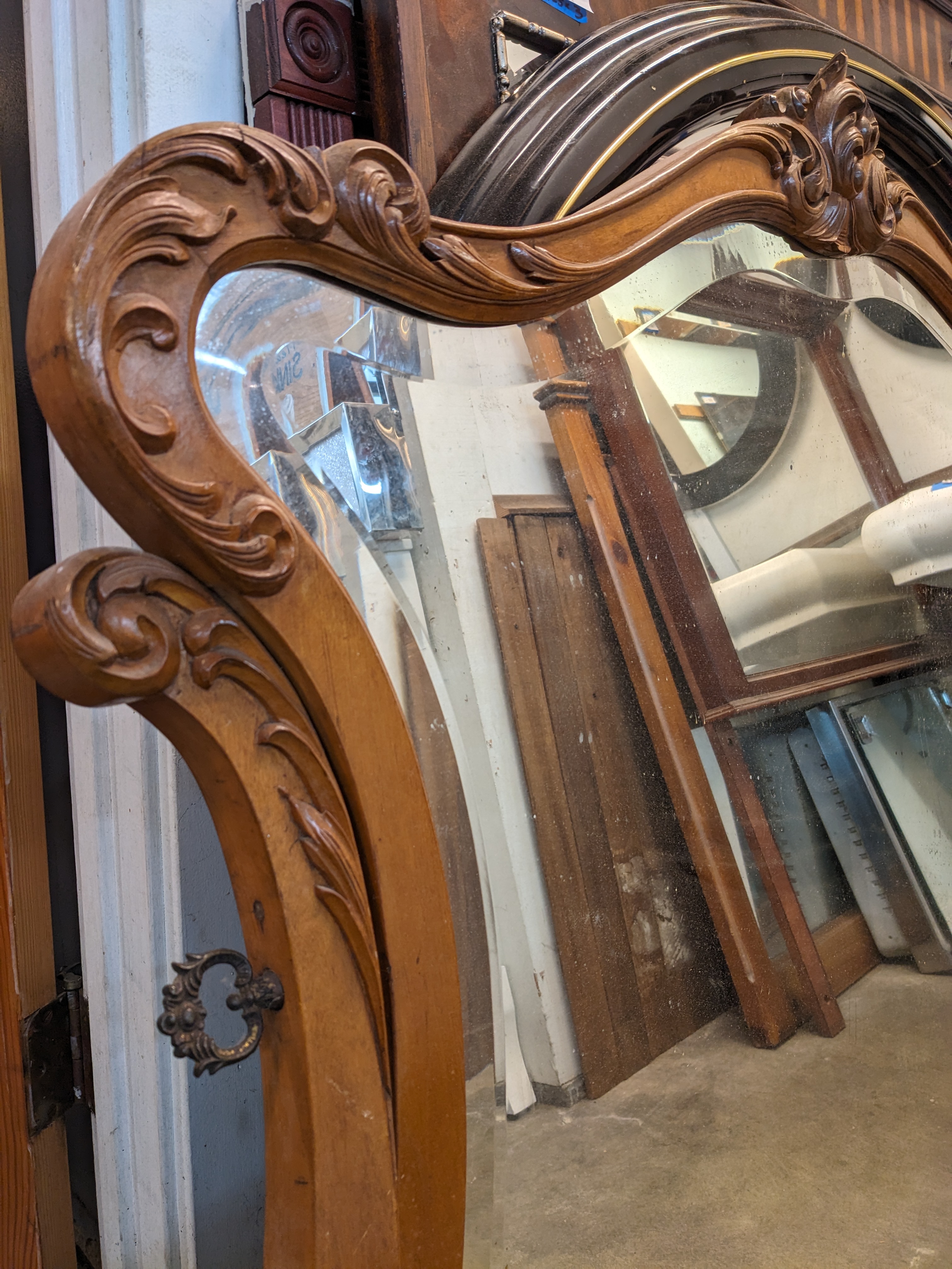 Gorgeousssssss jumbo-size wood carved mirror. Mirror swings in its frame, making it the perfect vanity mirror for your next project (or perhaps leave as is) ((it's your life))
