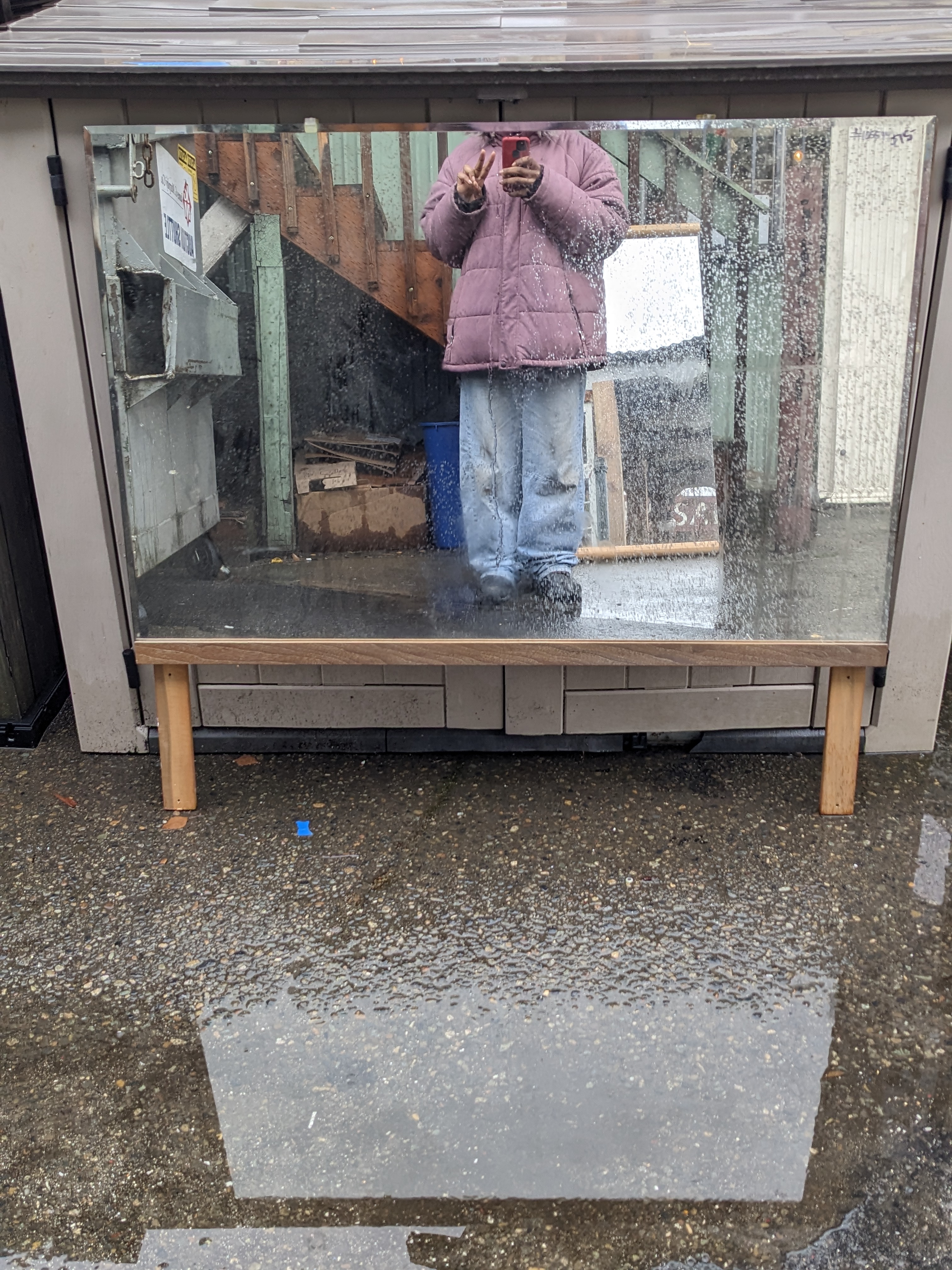 This lovely, large framed mirror was most likely taken off of a vanity. You could rebuild/replace, or keep as is. Lean up against a wall or cut the feet off to mount onto the wall ?