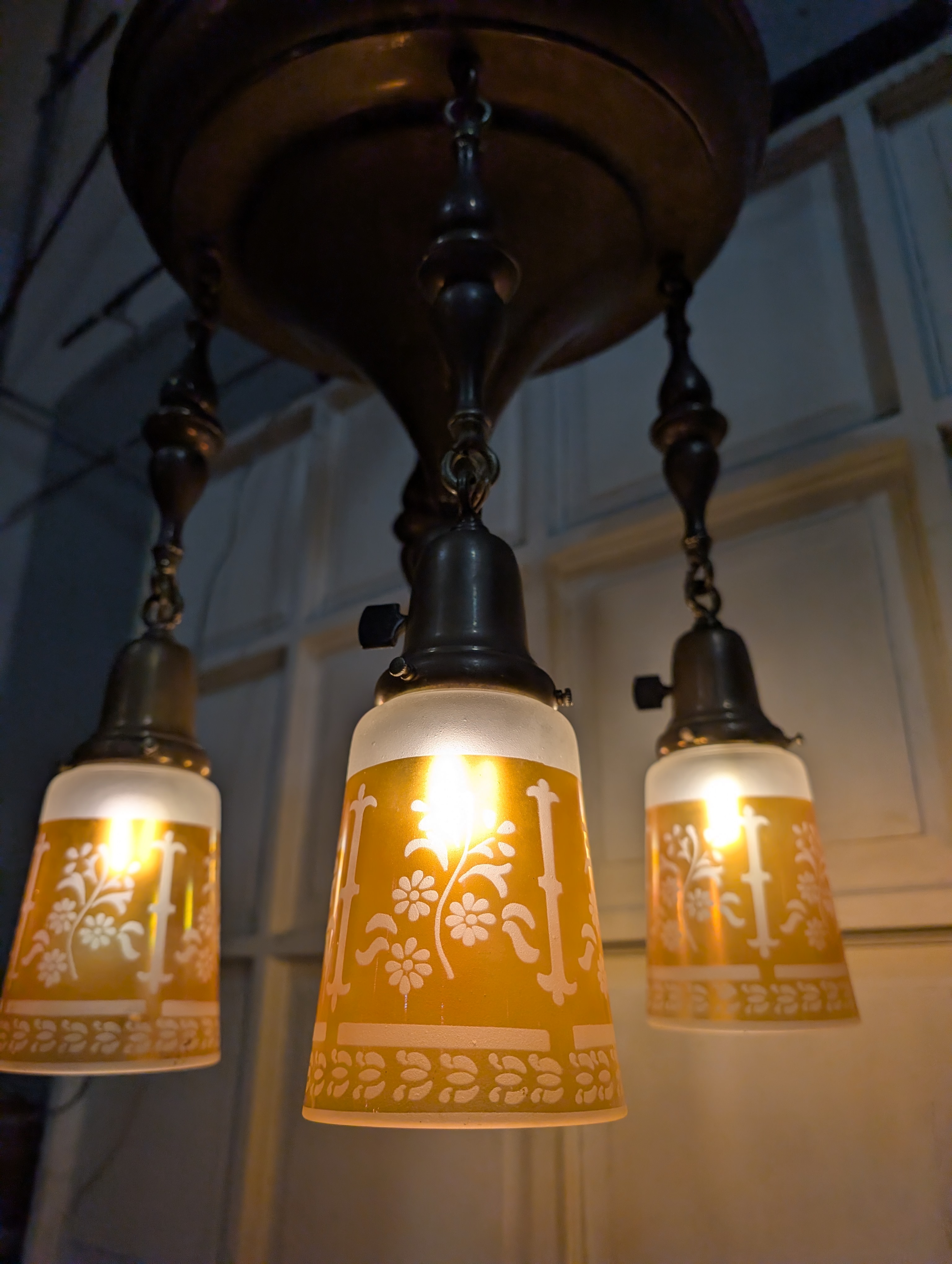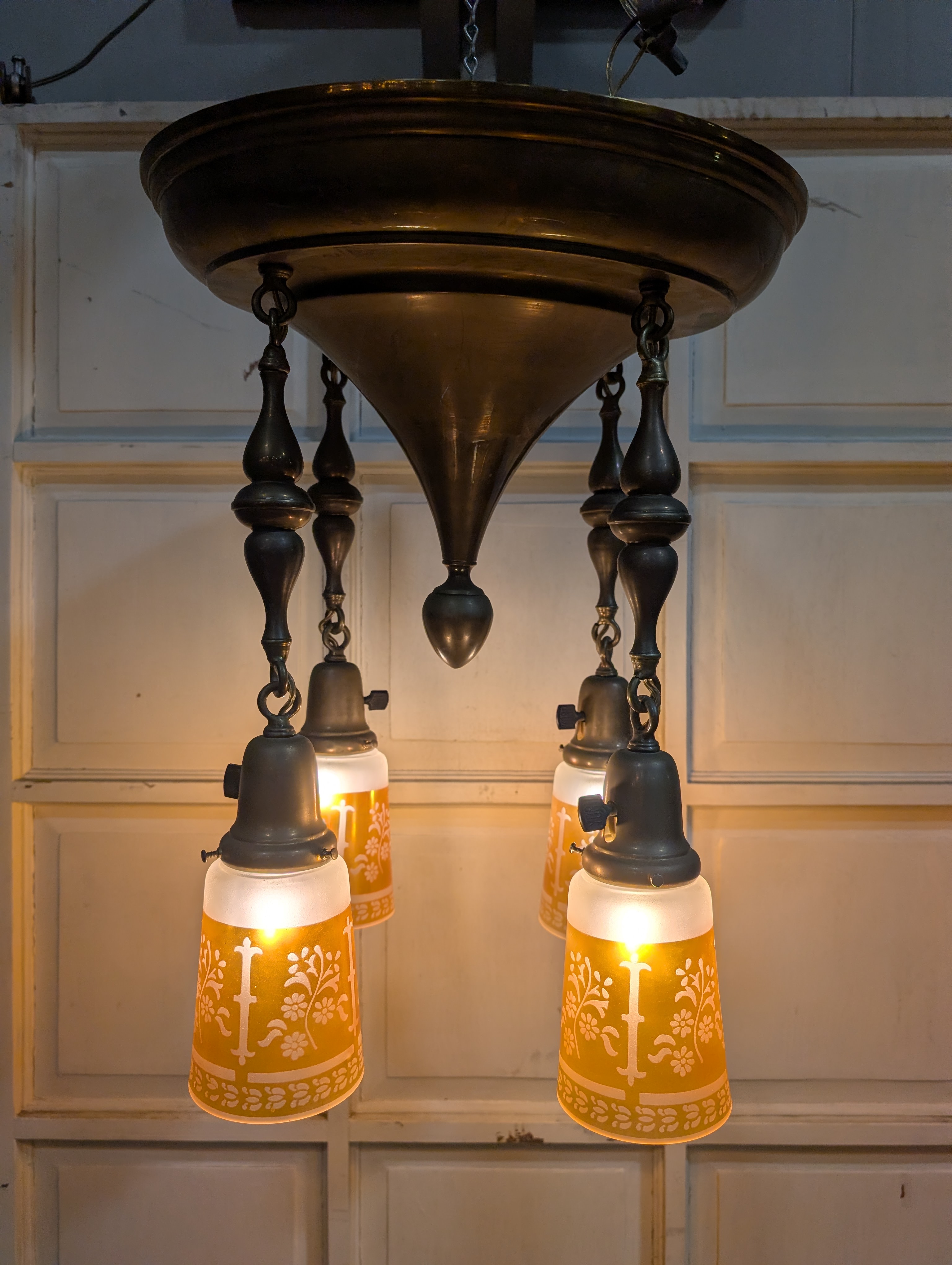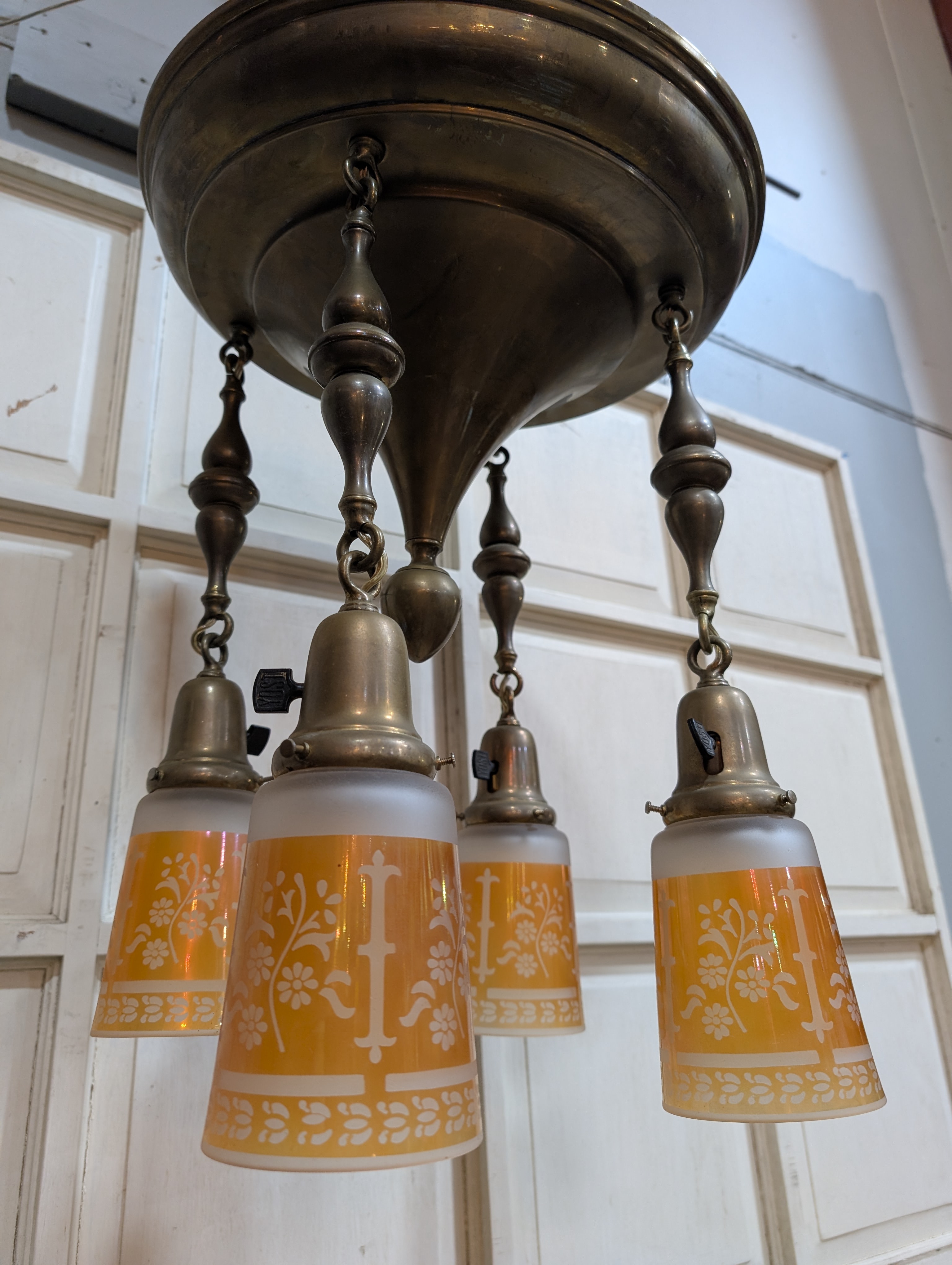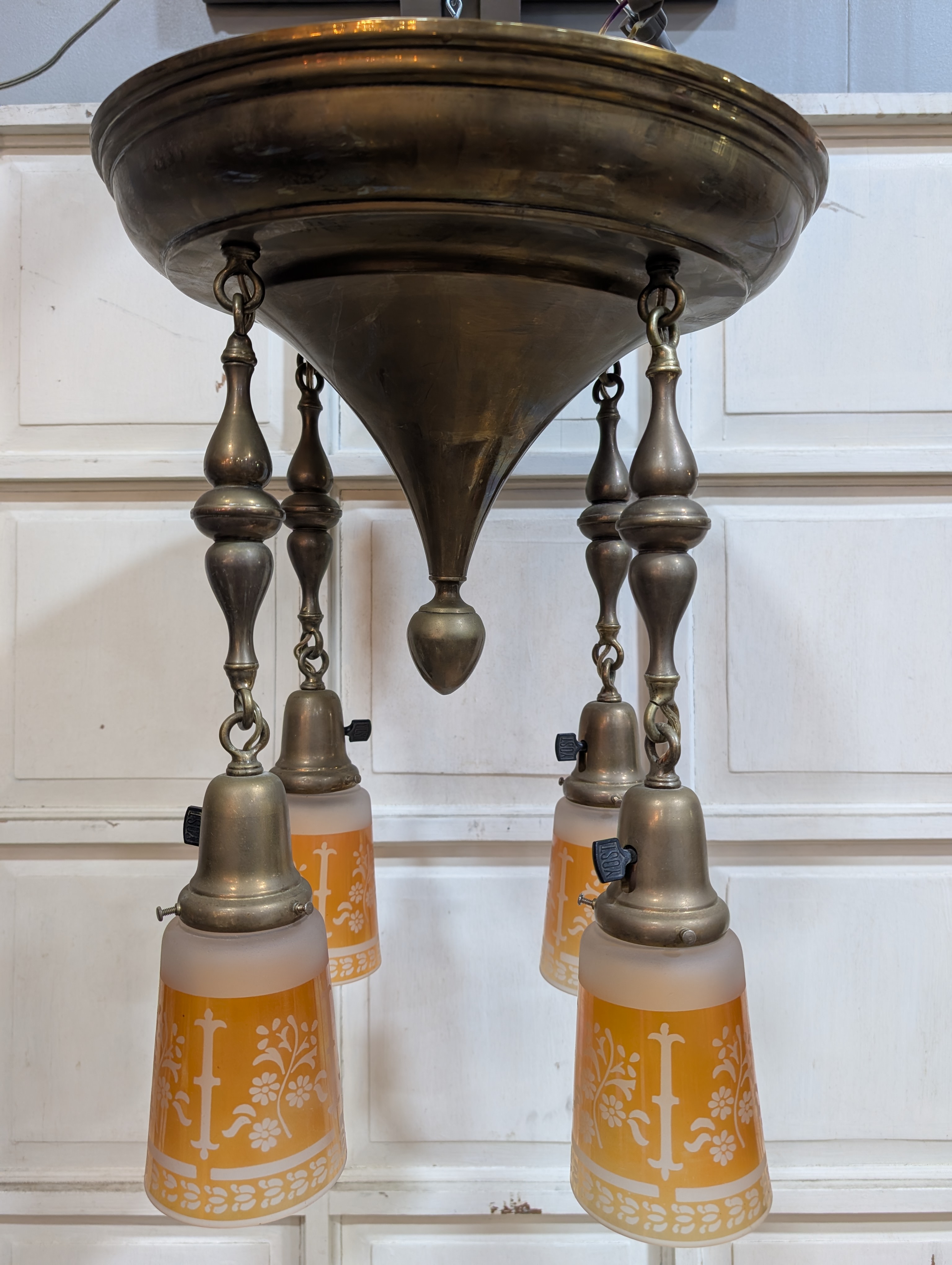 Lovely antique Art Nouveau four arm brass pan style chandelier. The brass has an aged medium brown patina with golden undertones. Each arm features a frosted shade with orange tinted glass etched with a floral pattern and a Yost dimmer switch. Wiring is in good condition, ready to hang and light up your space!