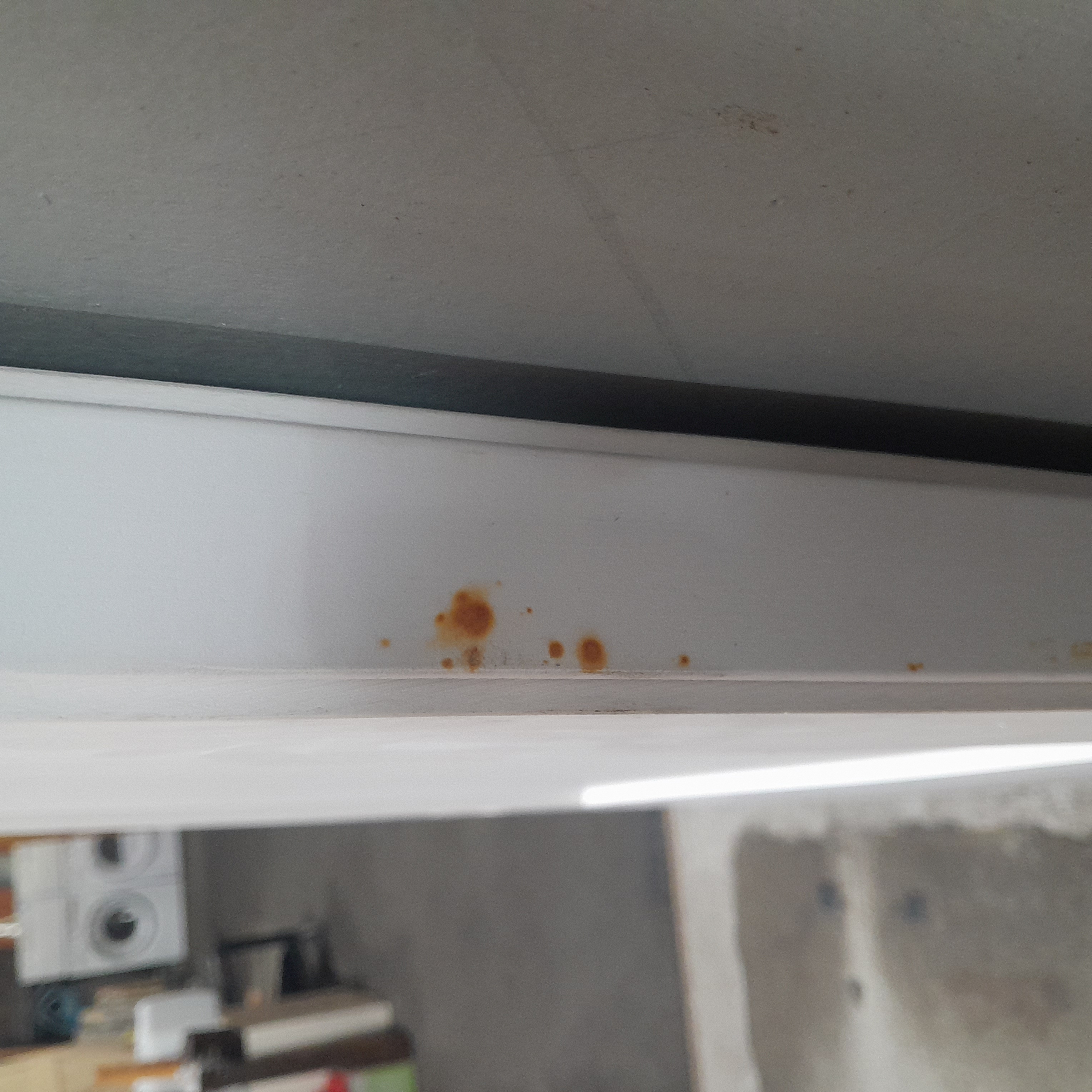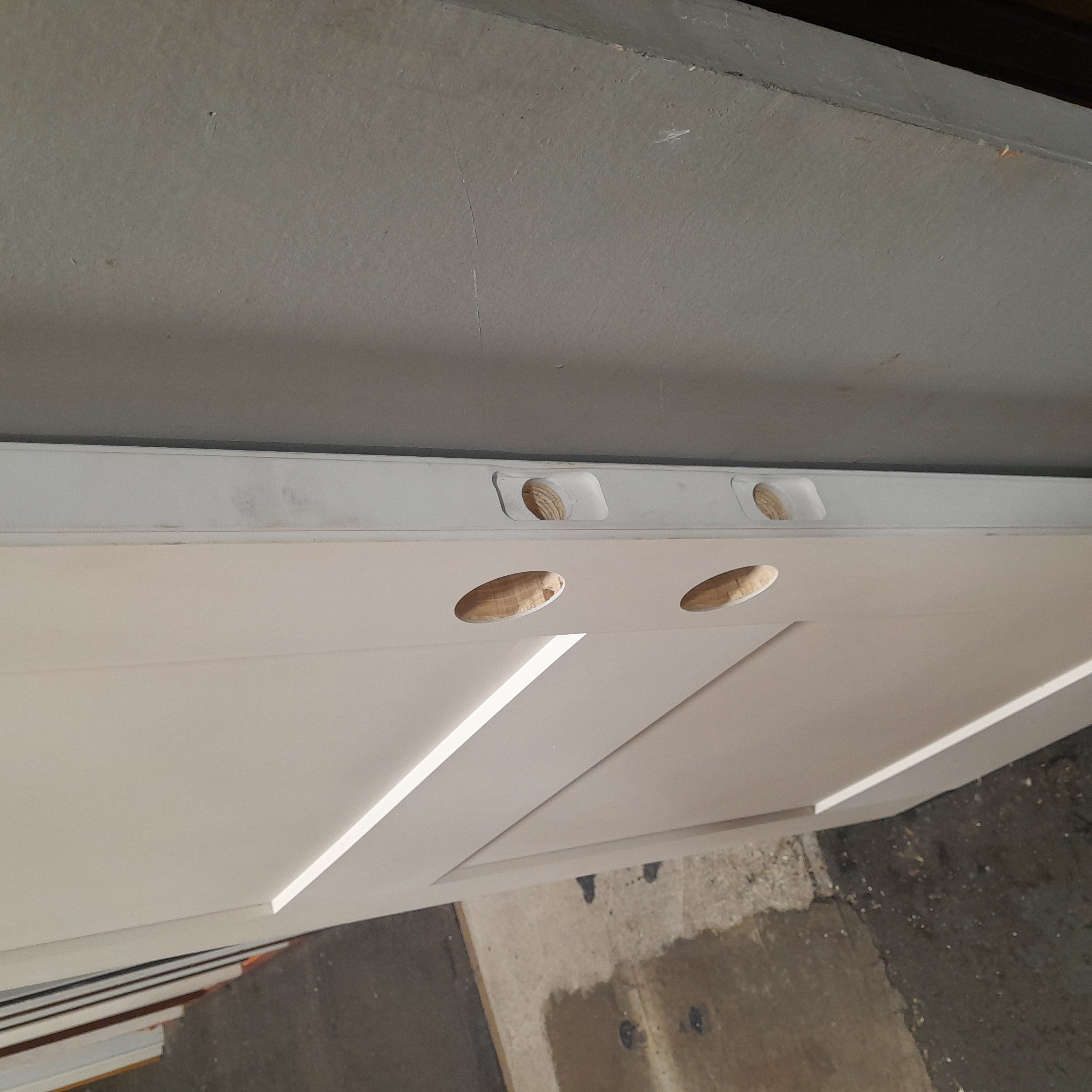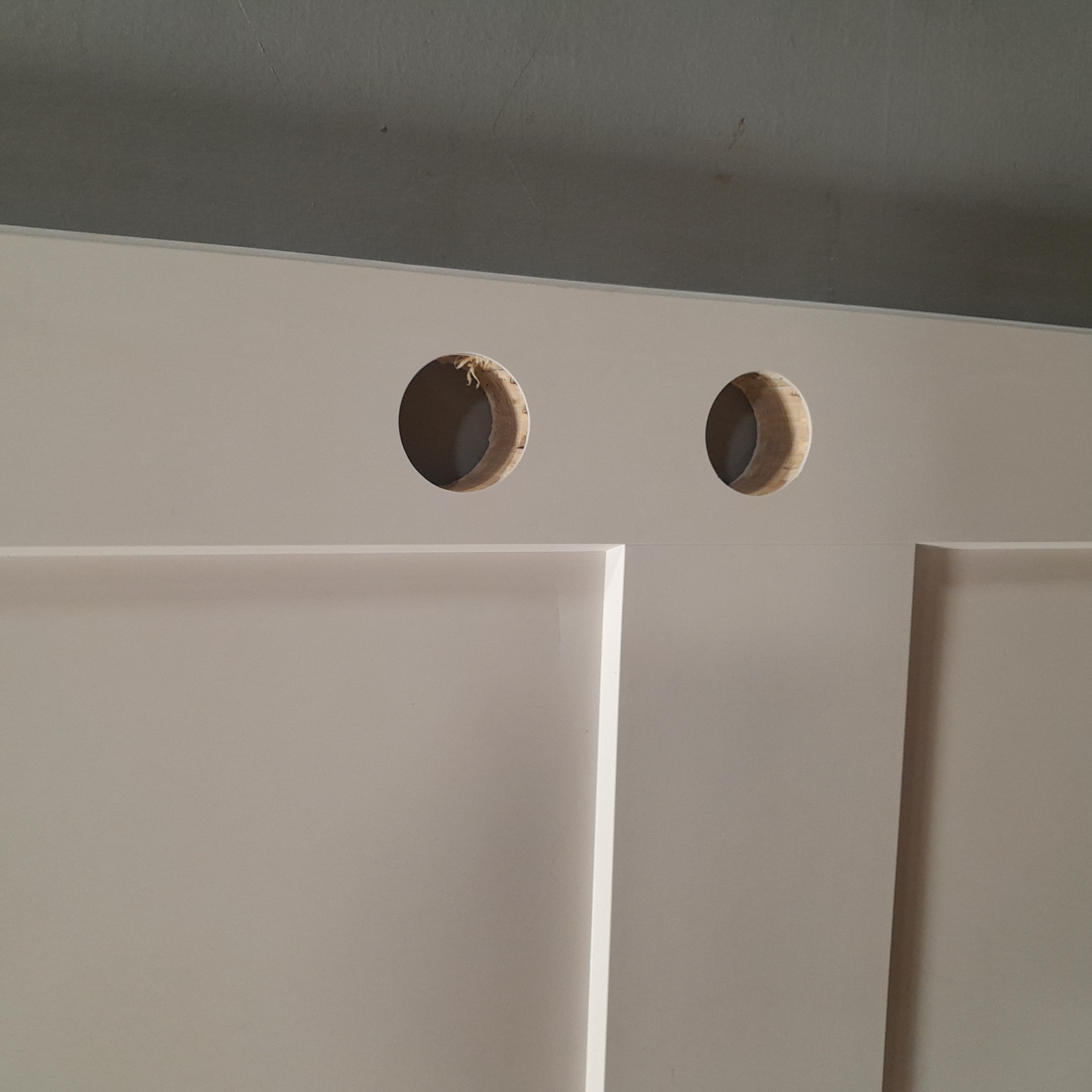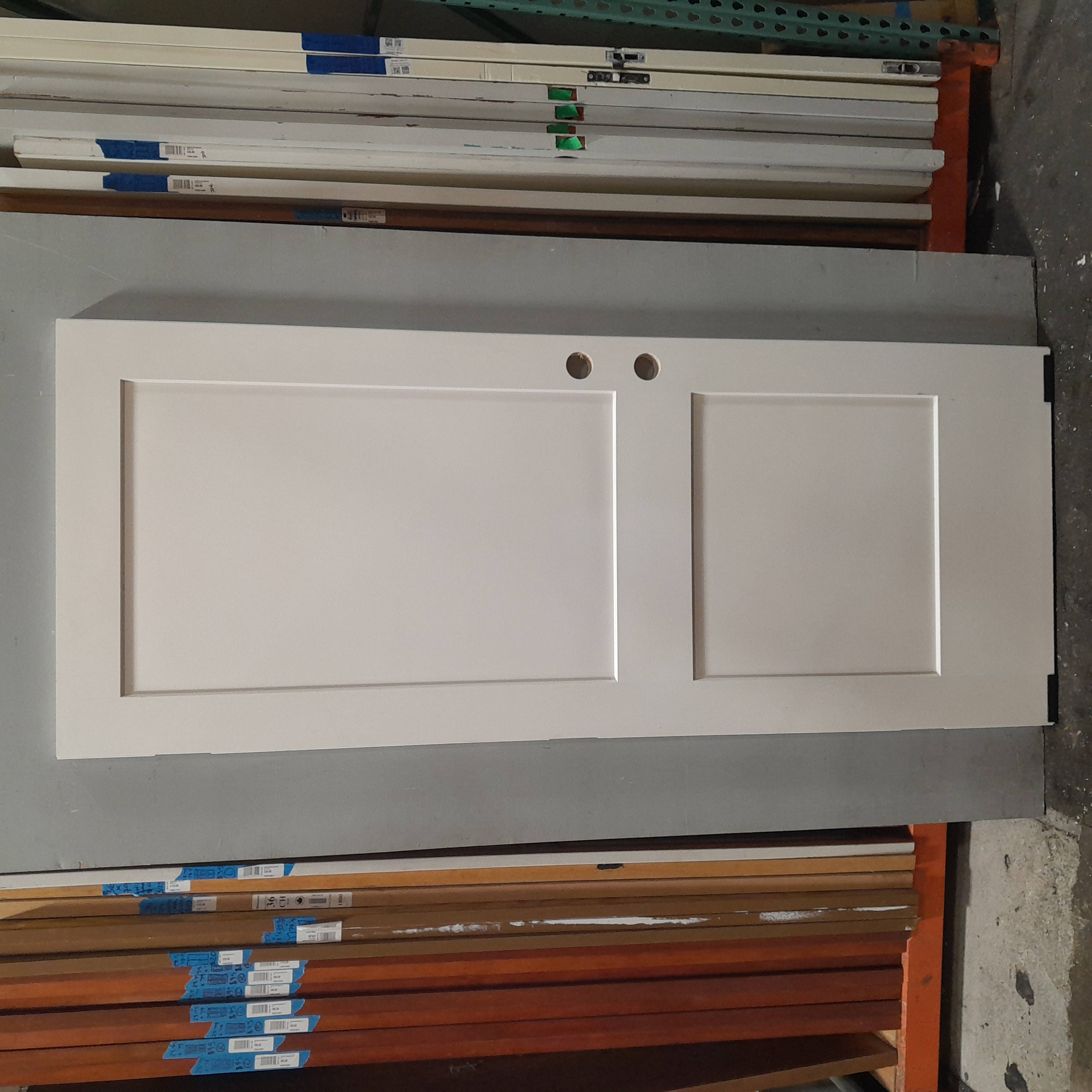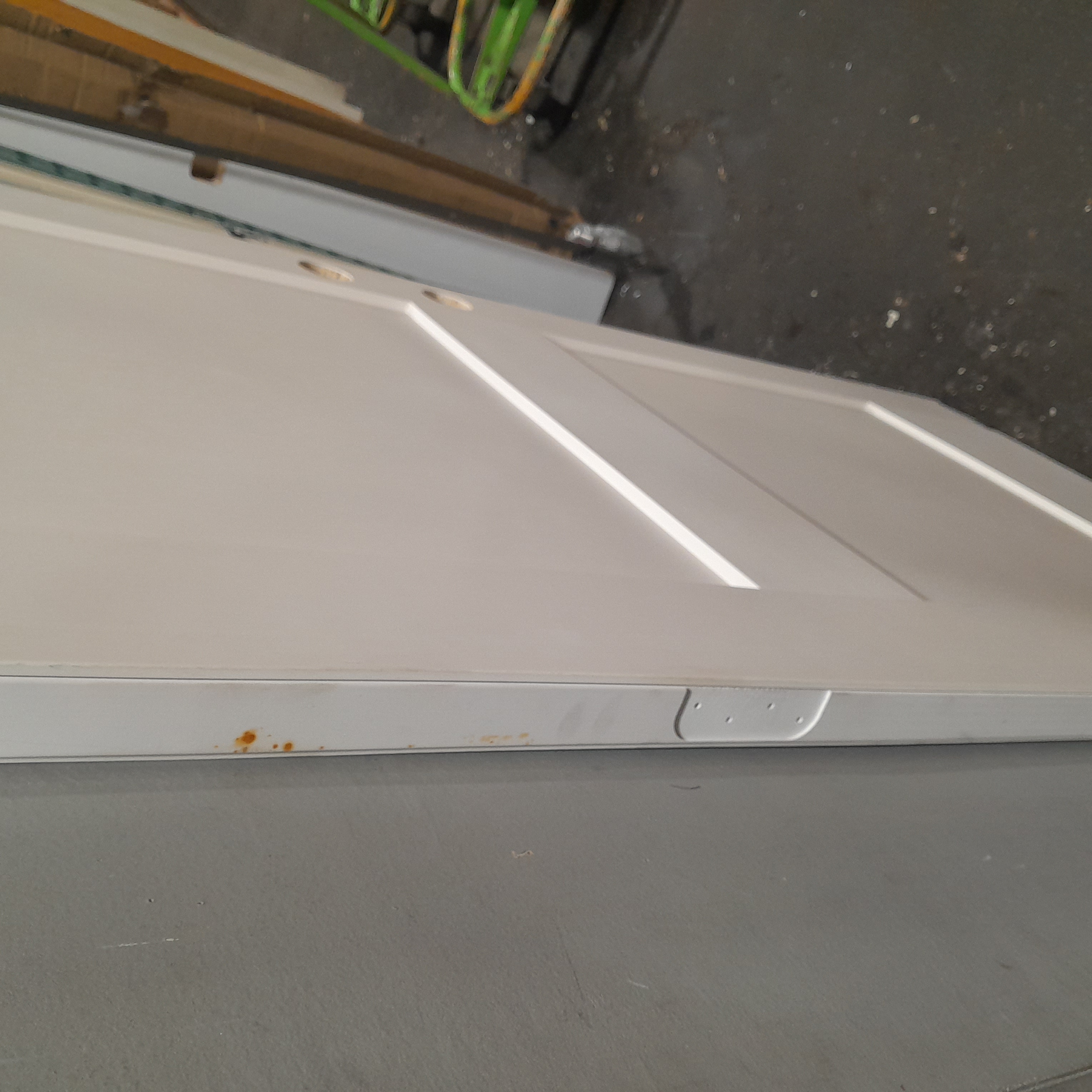 Exterior fiberglass door. Doesn't appear to have been hung or installed before. Could be preped and primed for paint. Hinge side has some small rust stains. Has holes drilled out for a dead bolt and door knob.