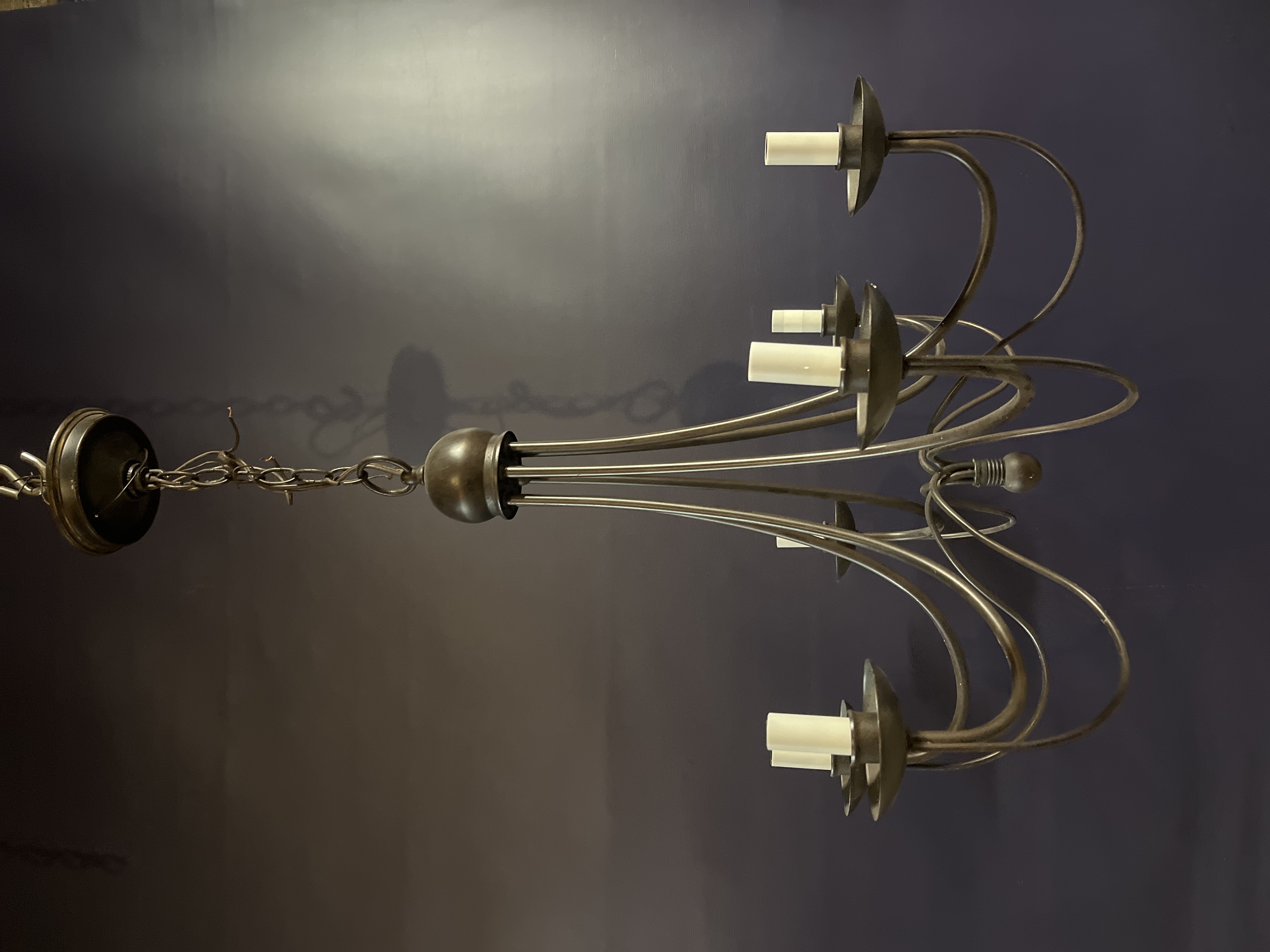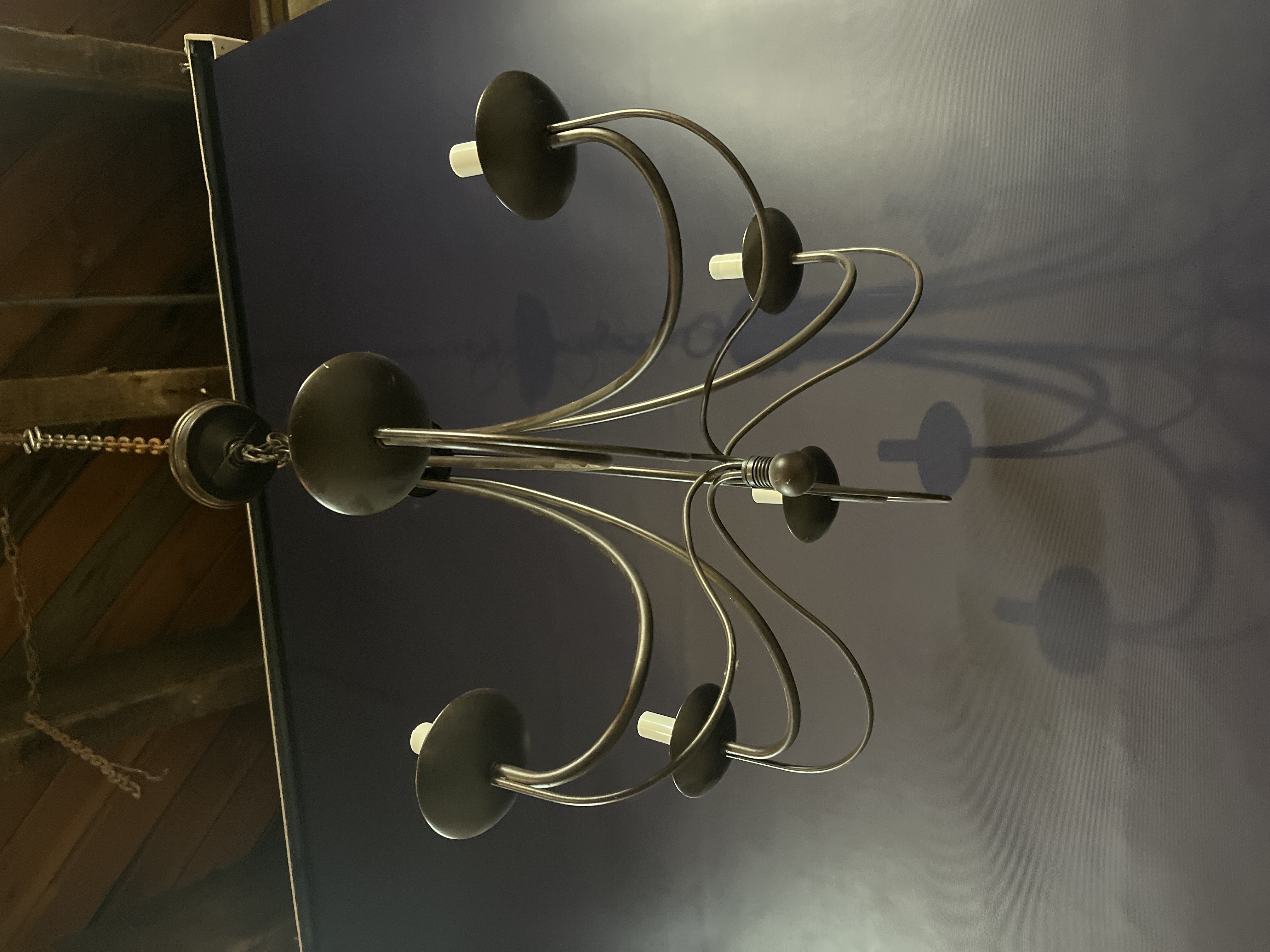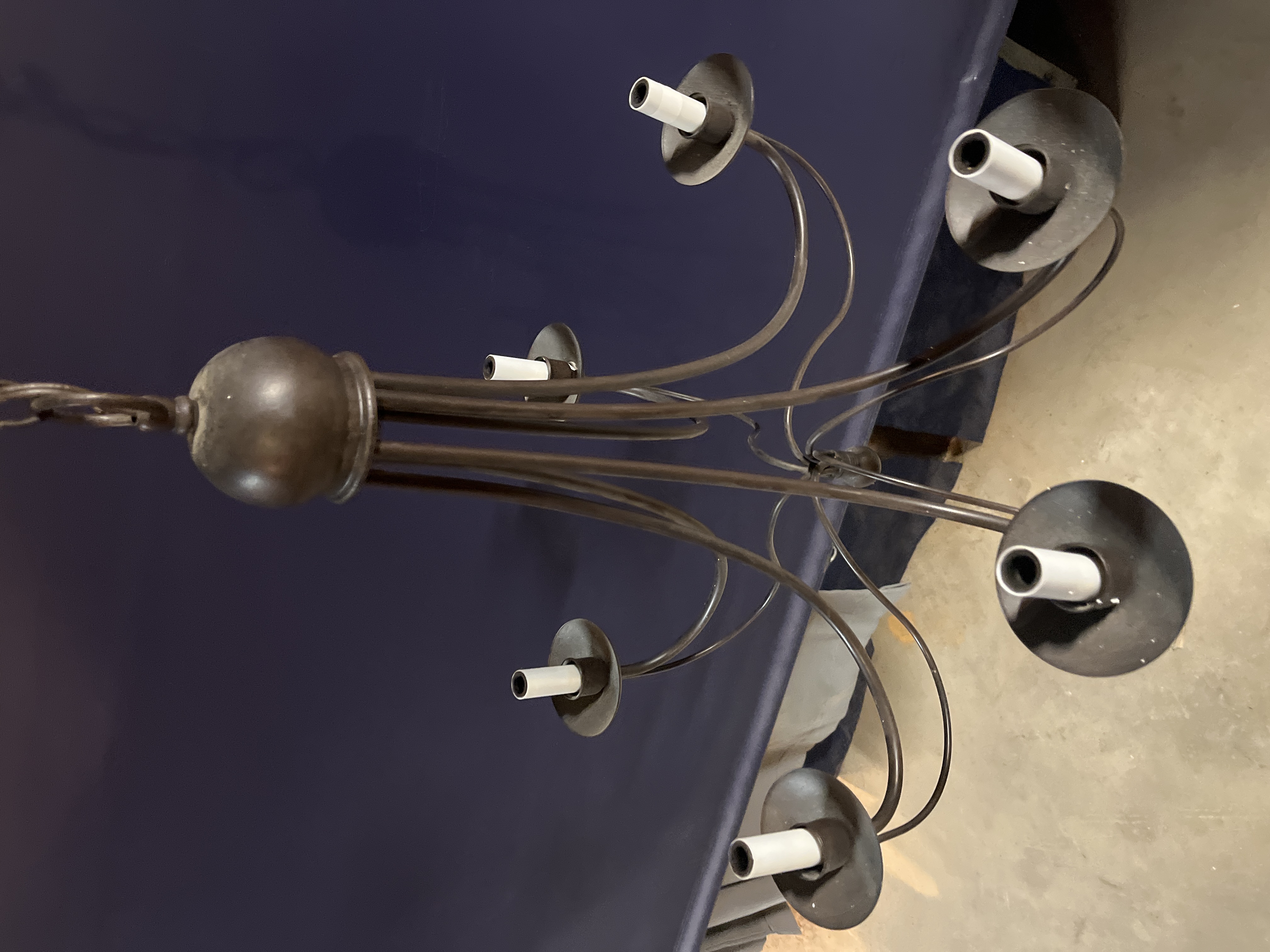A dark colored swooping chandelier with little ornamentation. All arms are movable. The wiring is modern, but should be double checked before installation. Measures 22 x 31 inches.