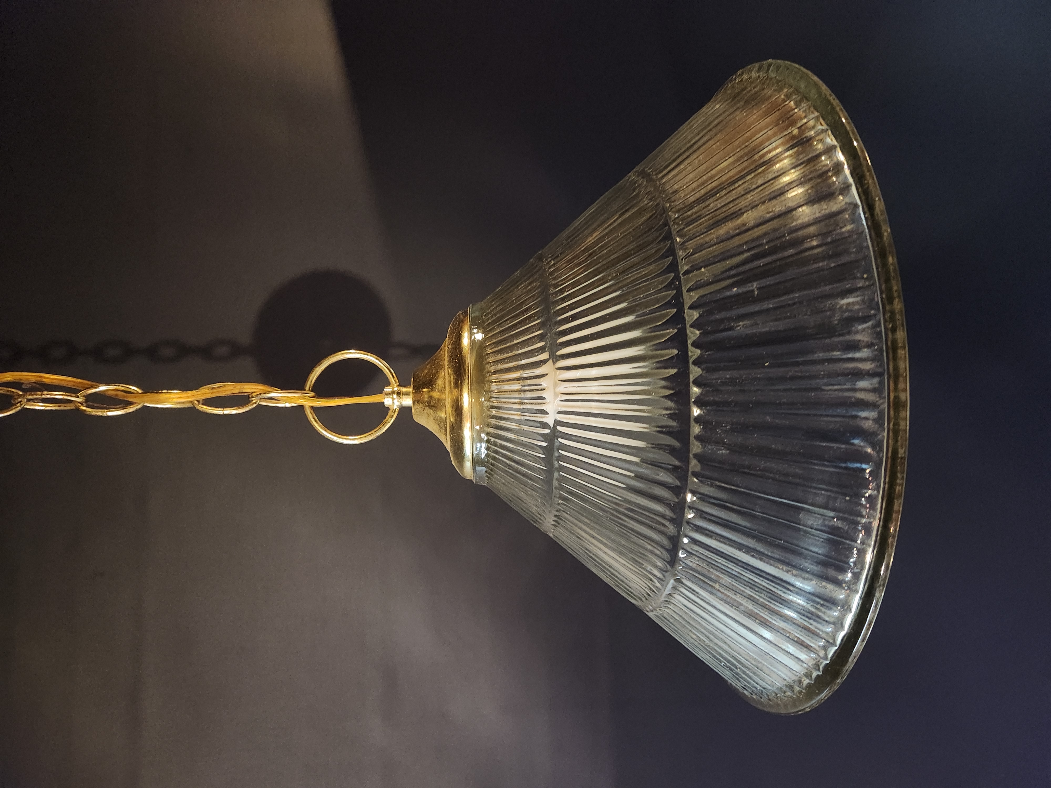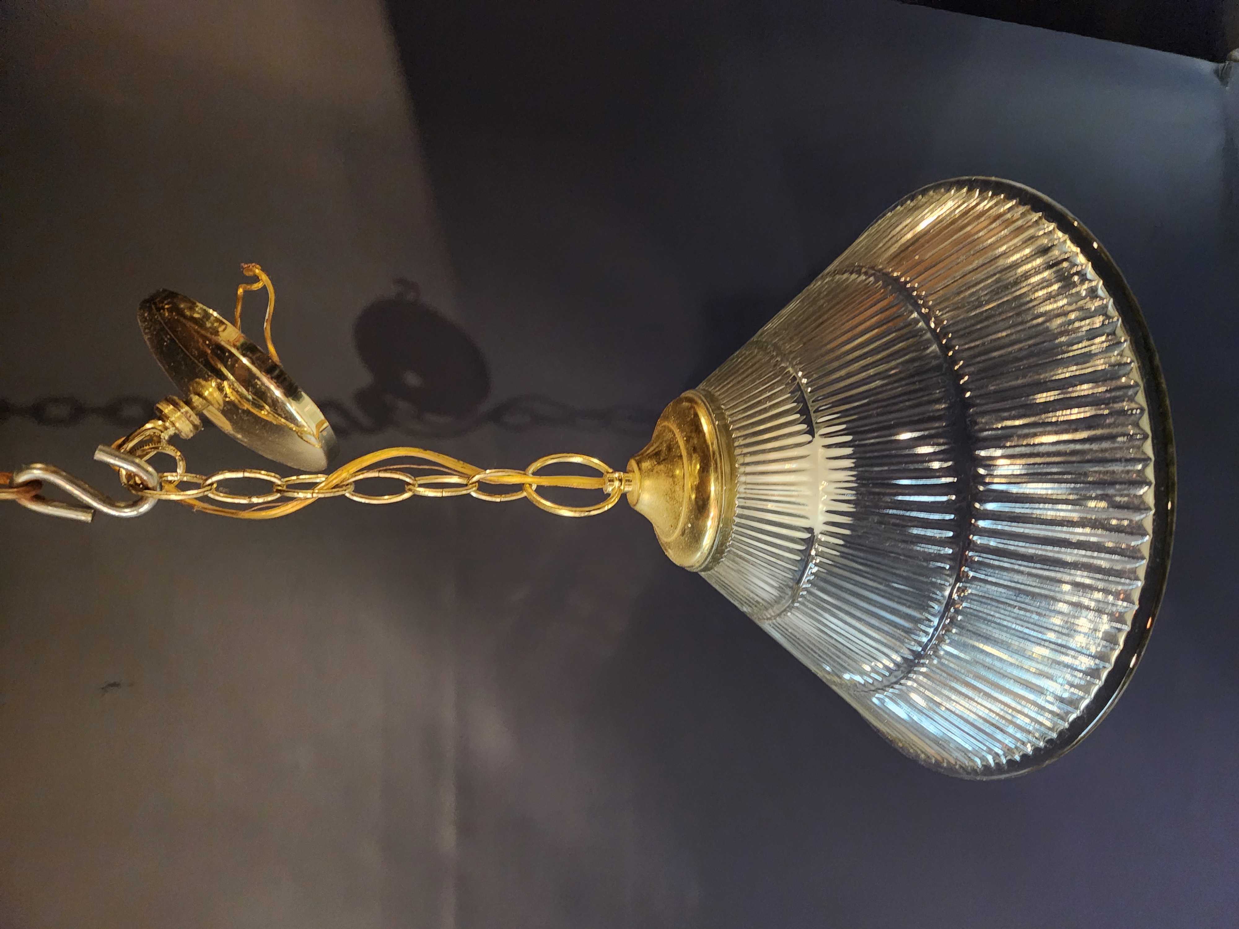Contemporary pendant light with a ribbed shade and brass fixture. It is in fair condition with some minor wear. It measures 14.75 x 22.5.