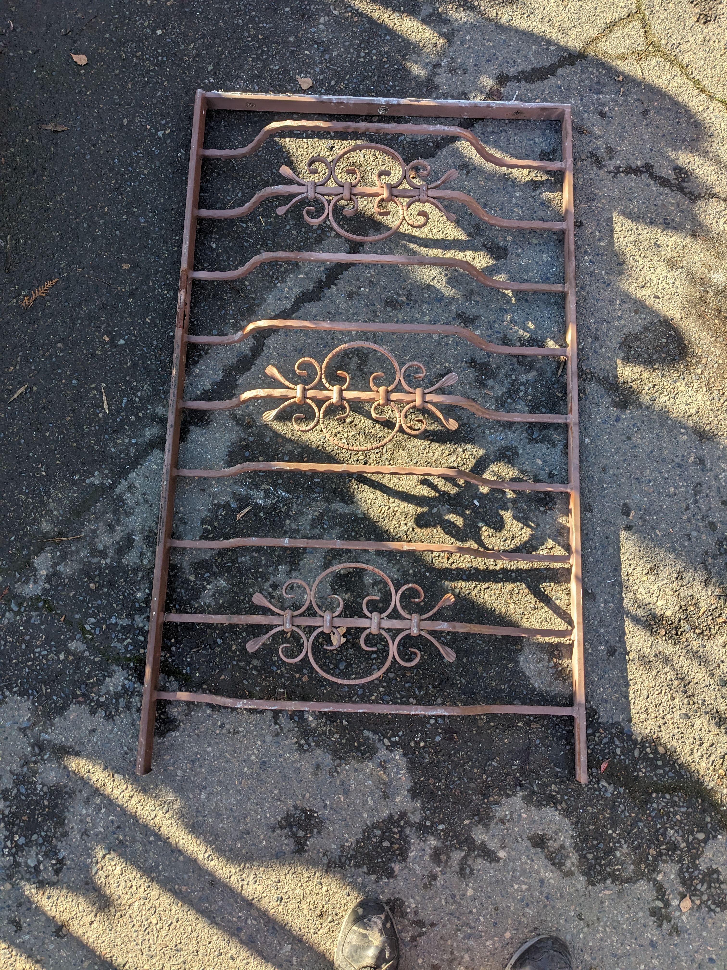 These solid and heavy decorative wrought iron railings were salvaged from a late mid century home in Seattle. The slight bow out and decorative filigree makes for a great place to lean and look out.