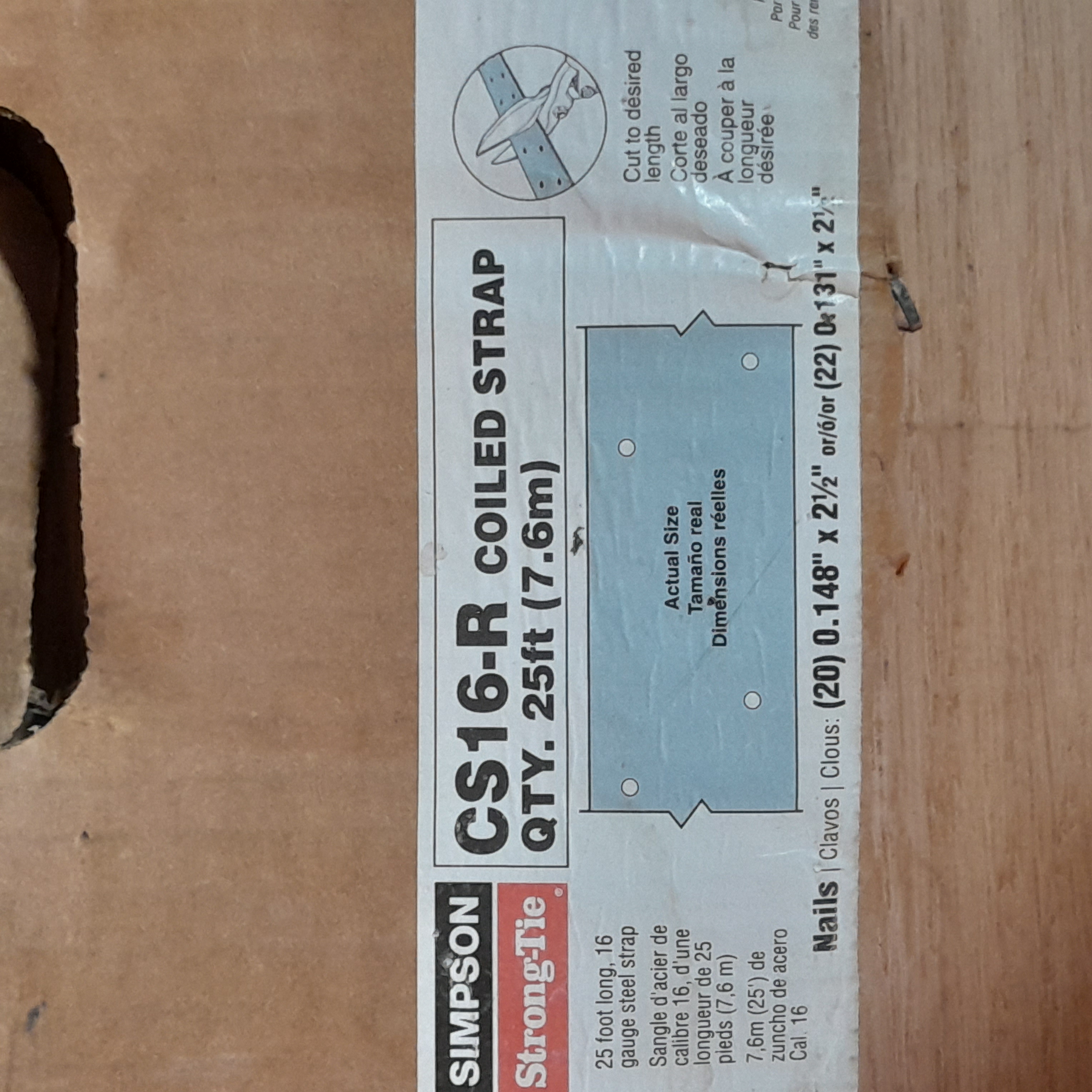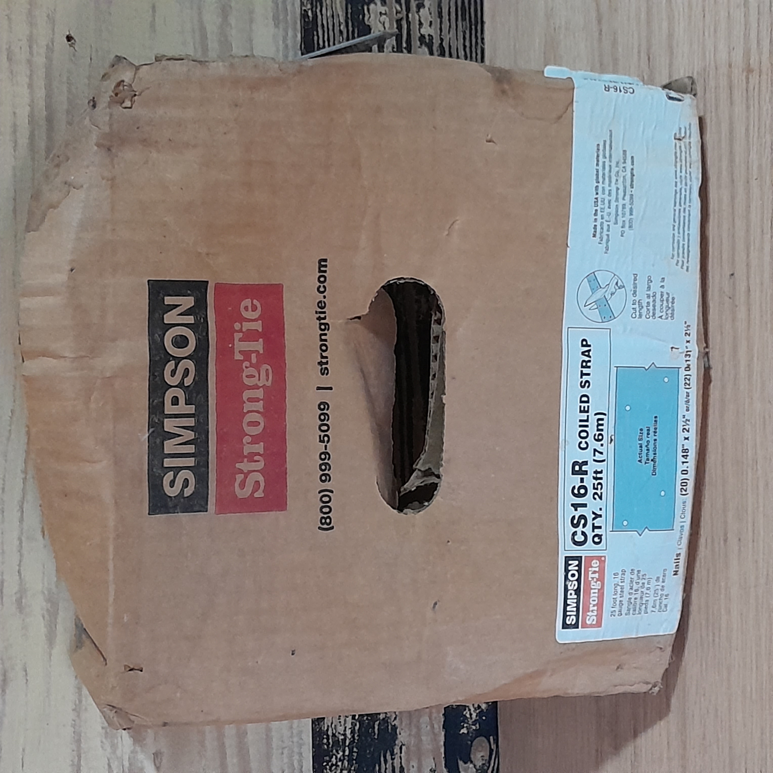 New, never used, just comes in damaged box. 25 foot long, 16 gage steel strap. Cut to desired length and use as needed.