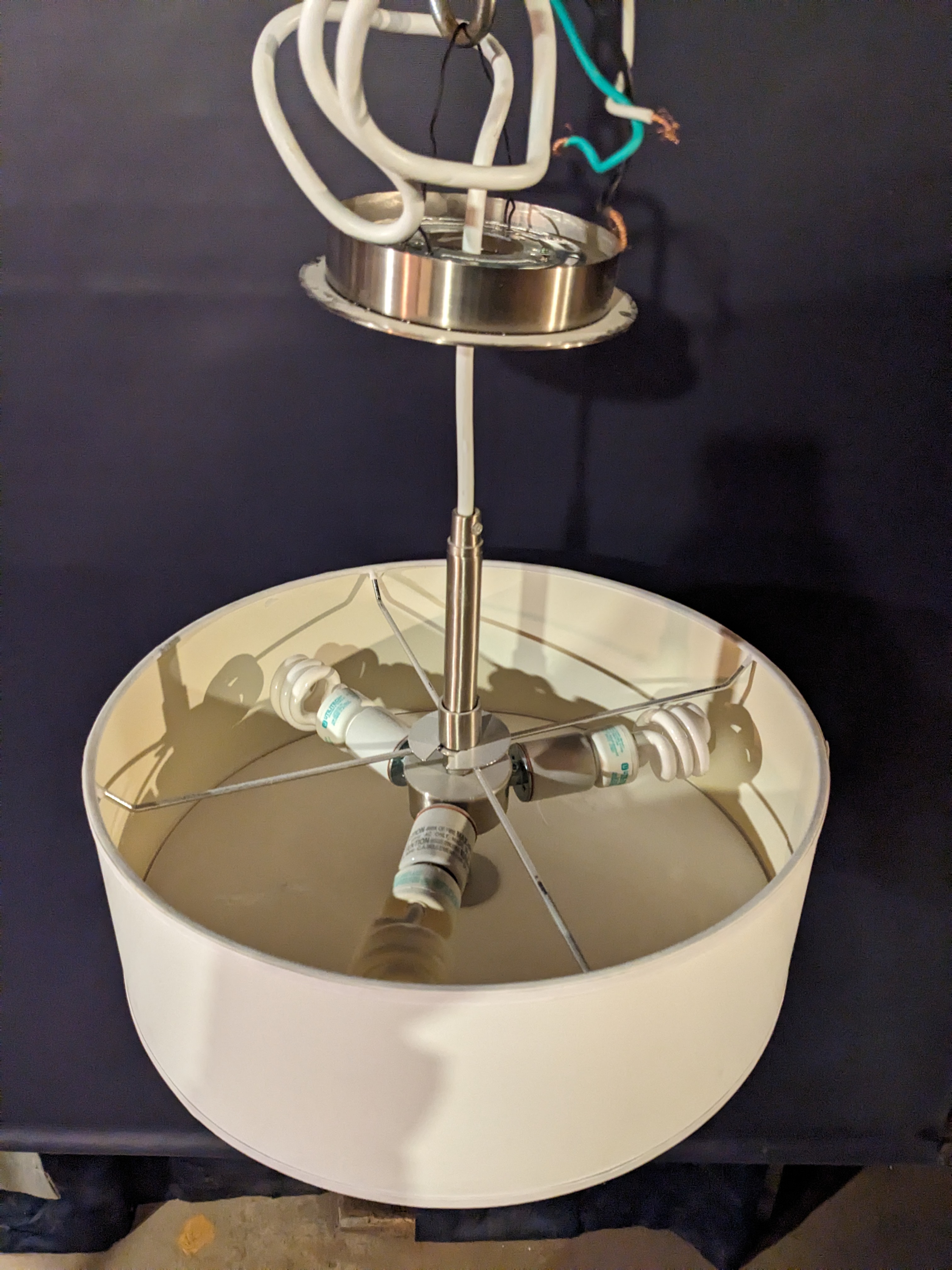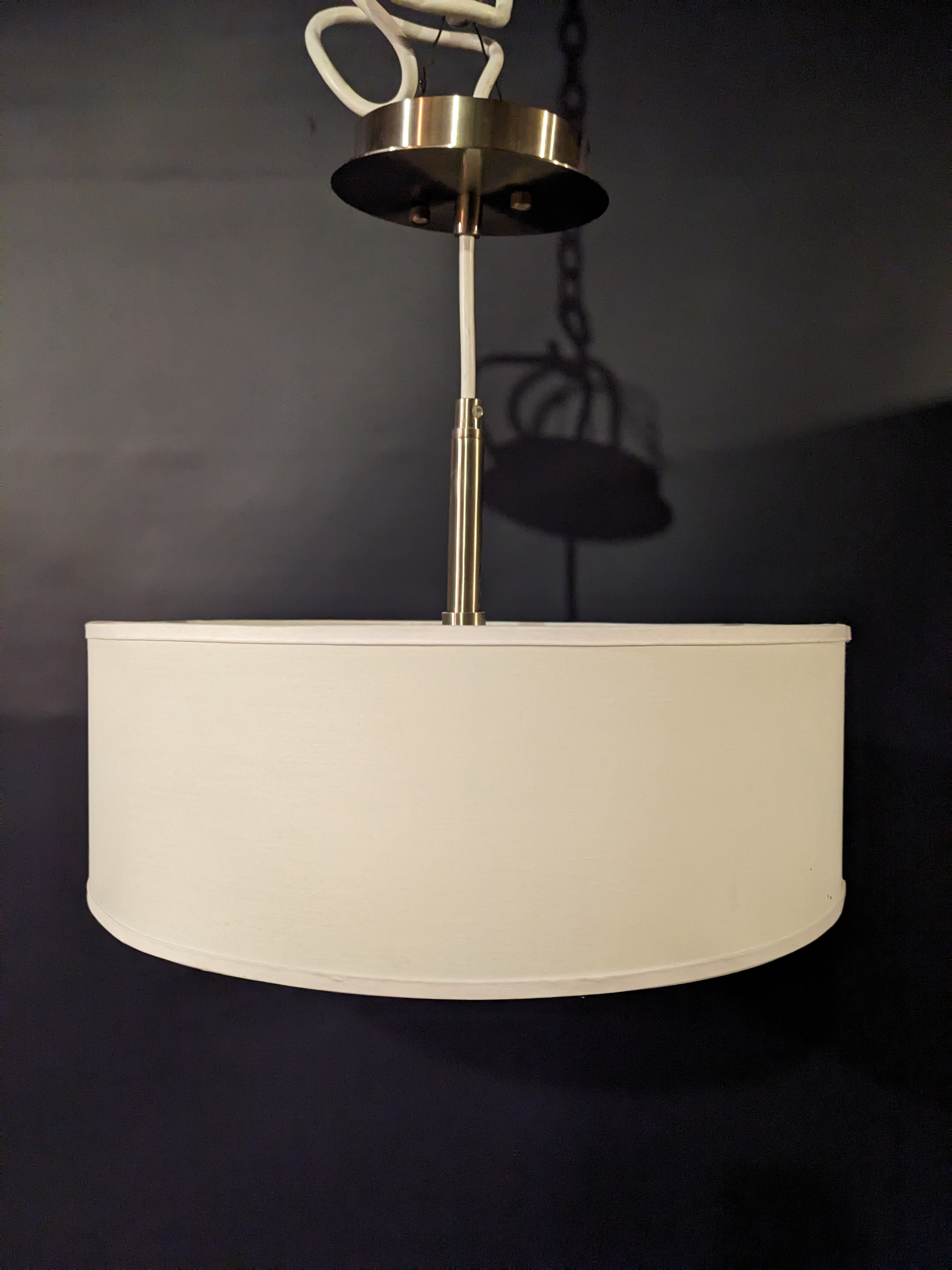 A sleek three bulb contemporary drum light. This light is in great shape with a bit of wear. Its height is adjustable, and the light itself measures 16 x 5.5 inches, with roughly two feet of cord. Images may be representational.