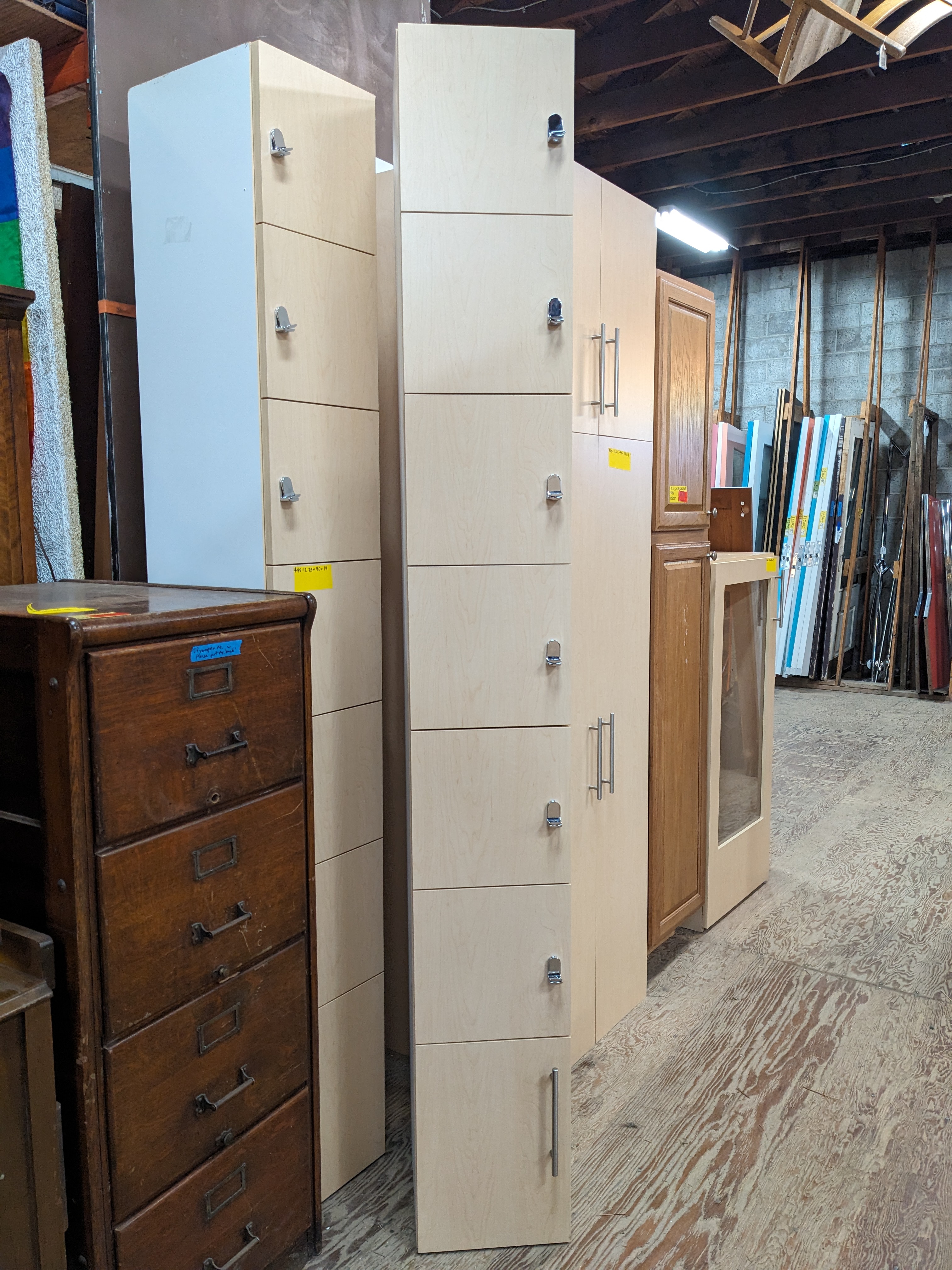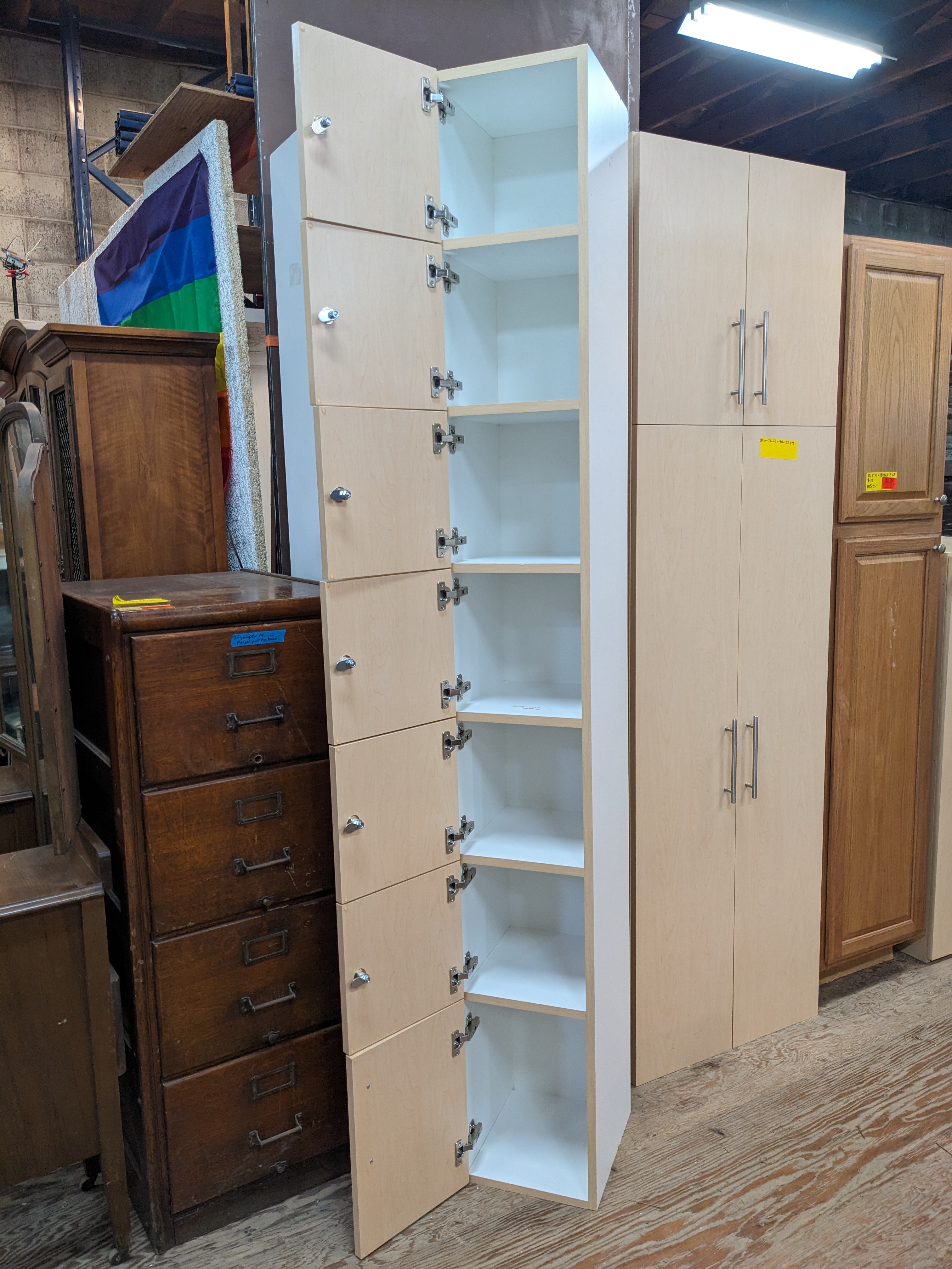 A particle board locker cabinet with a wooden veneer. This cabinet is in good condition with almost no wear. It measures 12.25 x 90 x 14 inches.