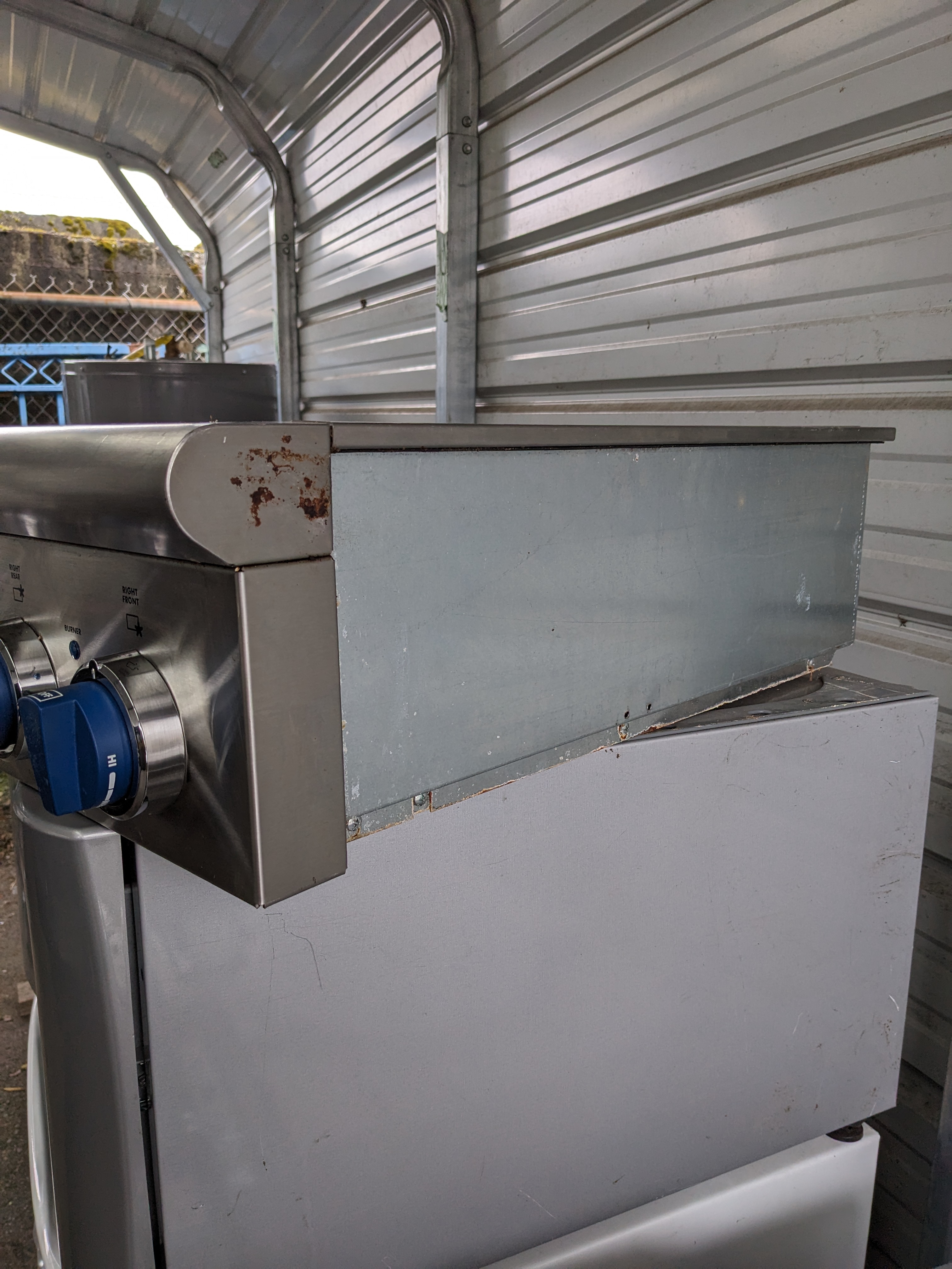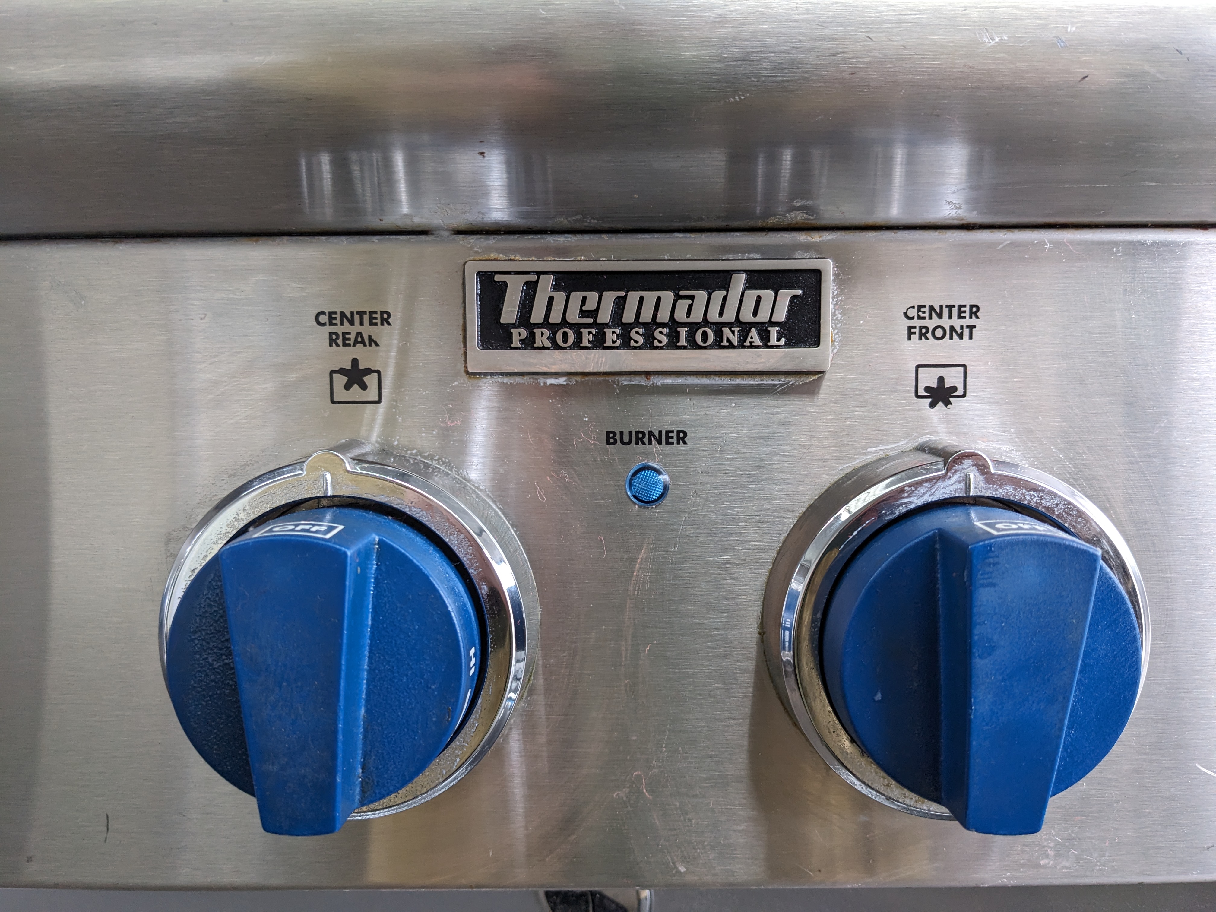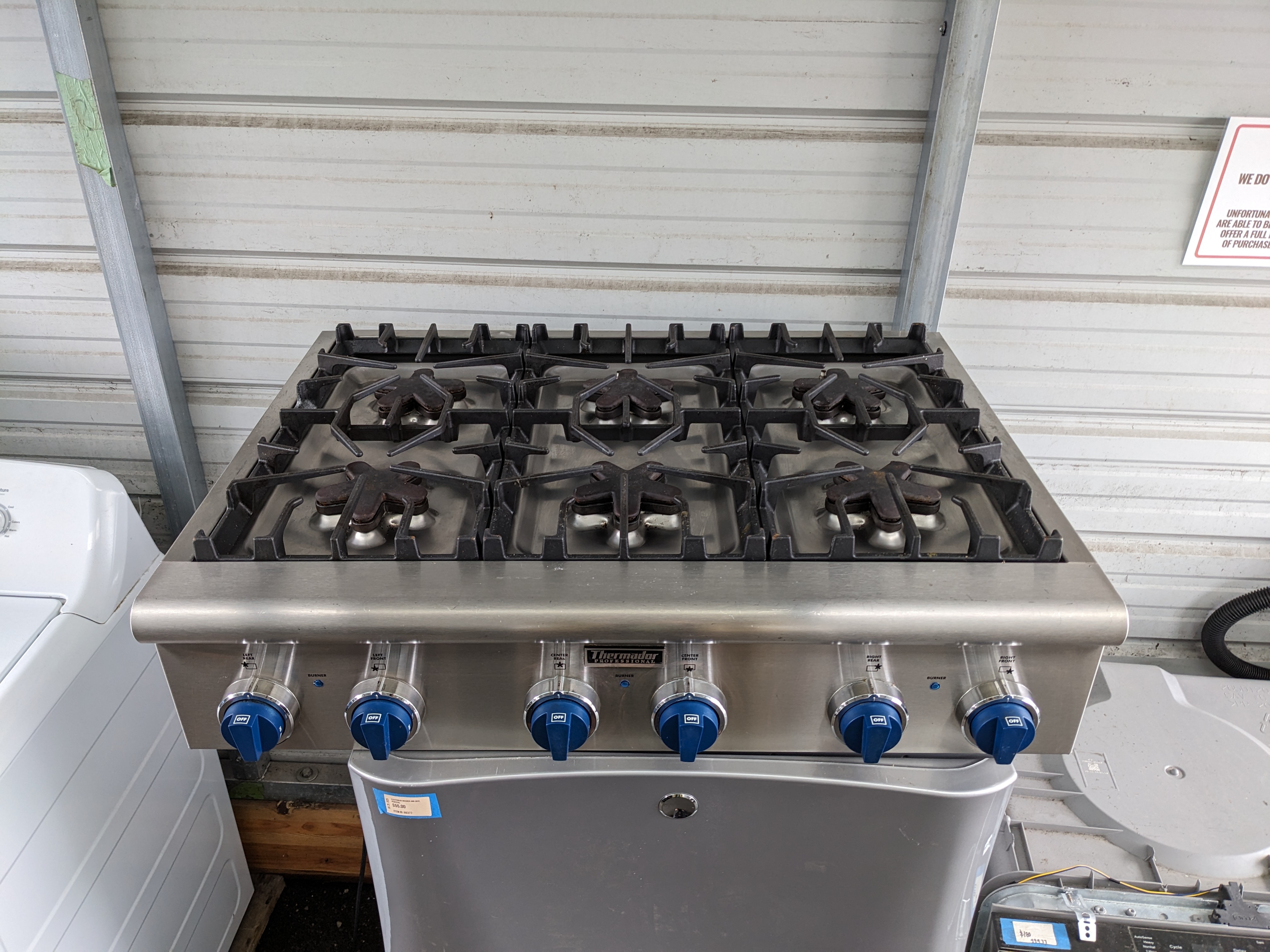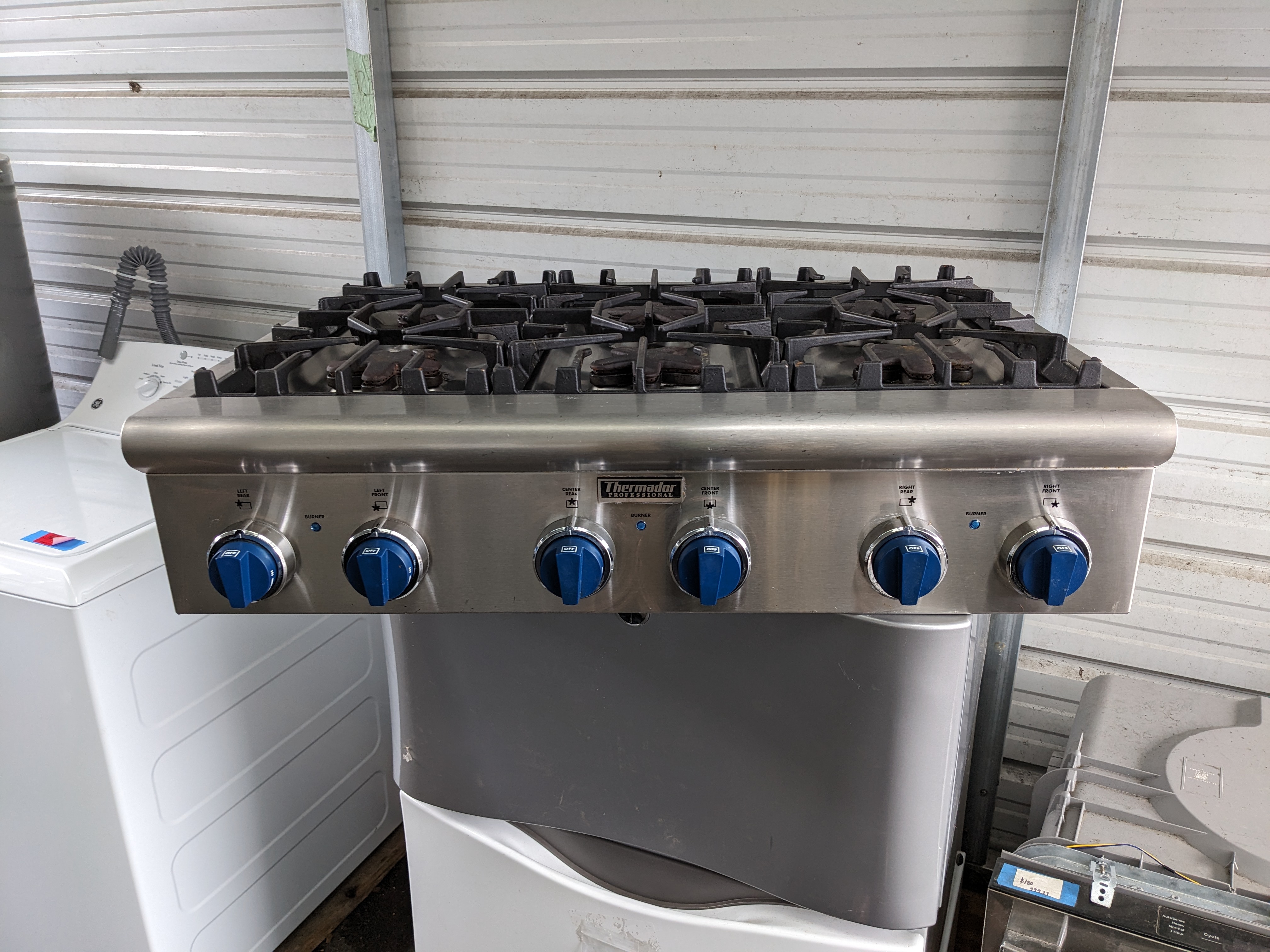 36 x 26.5 x 8 Thermador professional six burner gas cooktop. Big Blue knobs on the front still turn with ease and are ready to get cookin! It is still in good cosmetic condition with shiny stainless steel with minimal scratching. The cast iron stove grates have begun to experience a range rusting in a few locations, not overwhelmingly, but notable. The electrical connection is in fantastic shape, however the old gas line connection seems to have been removed with some pipe cutters, it will likely need to be replaced. Untested, as is. The price reflects the condition.