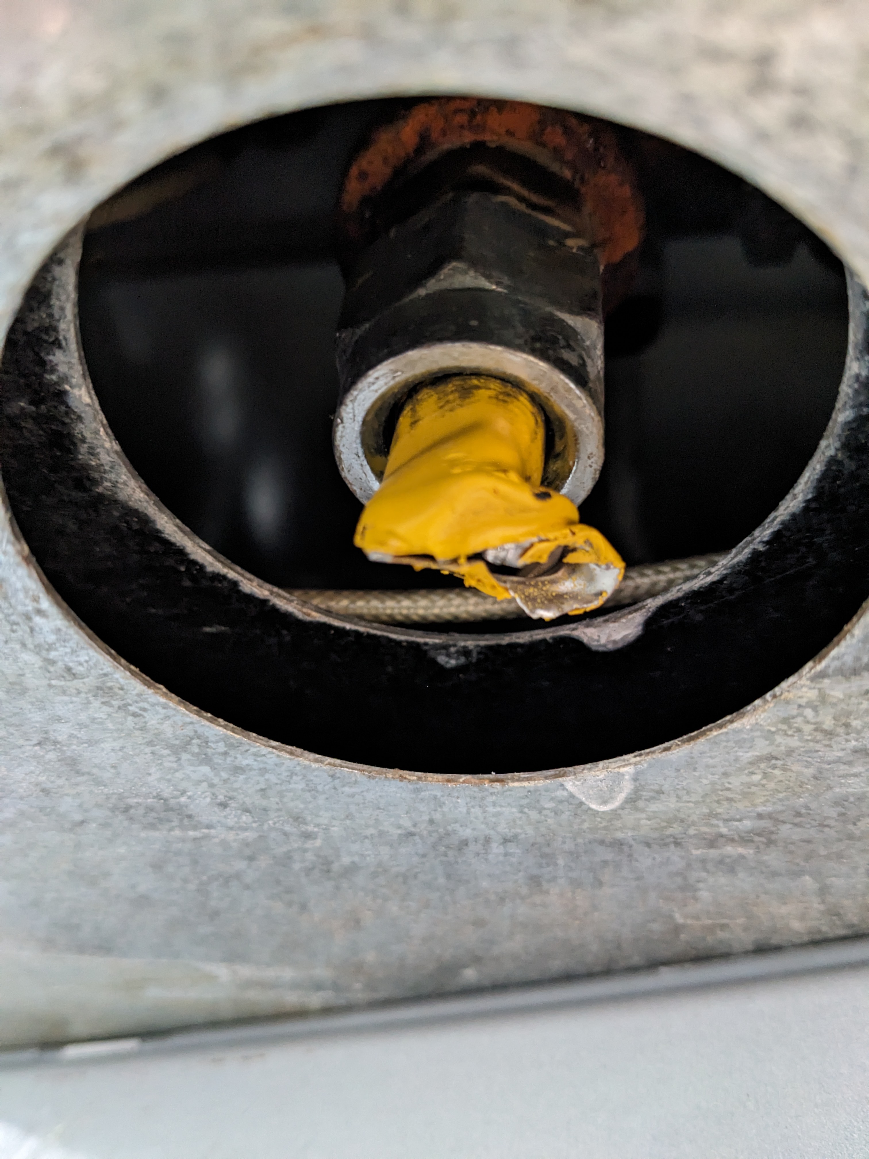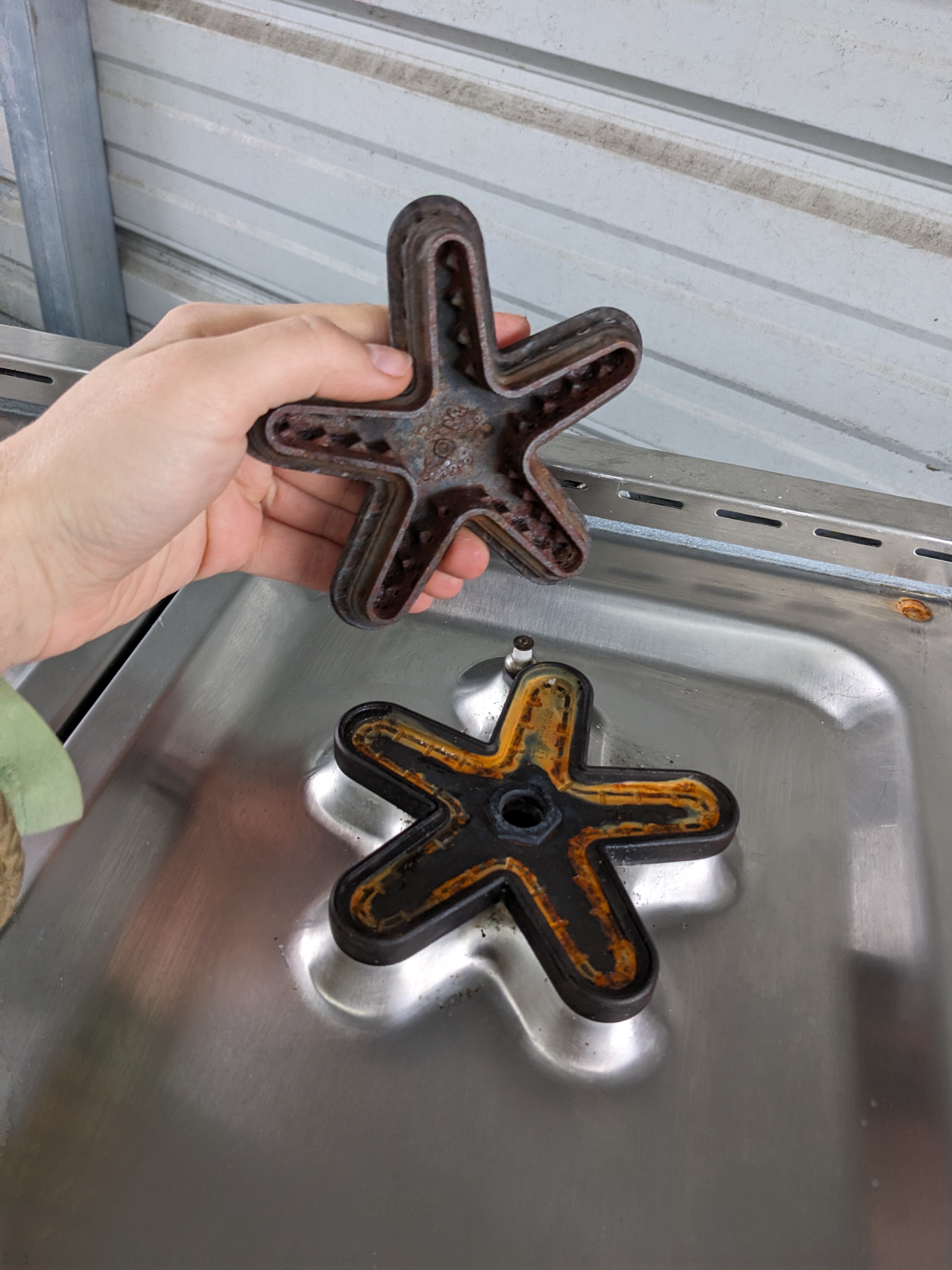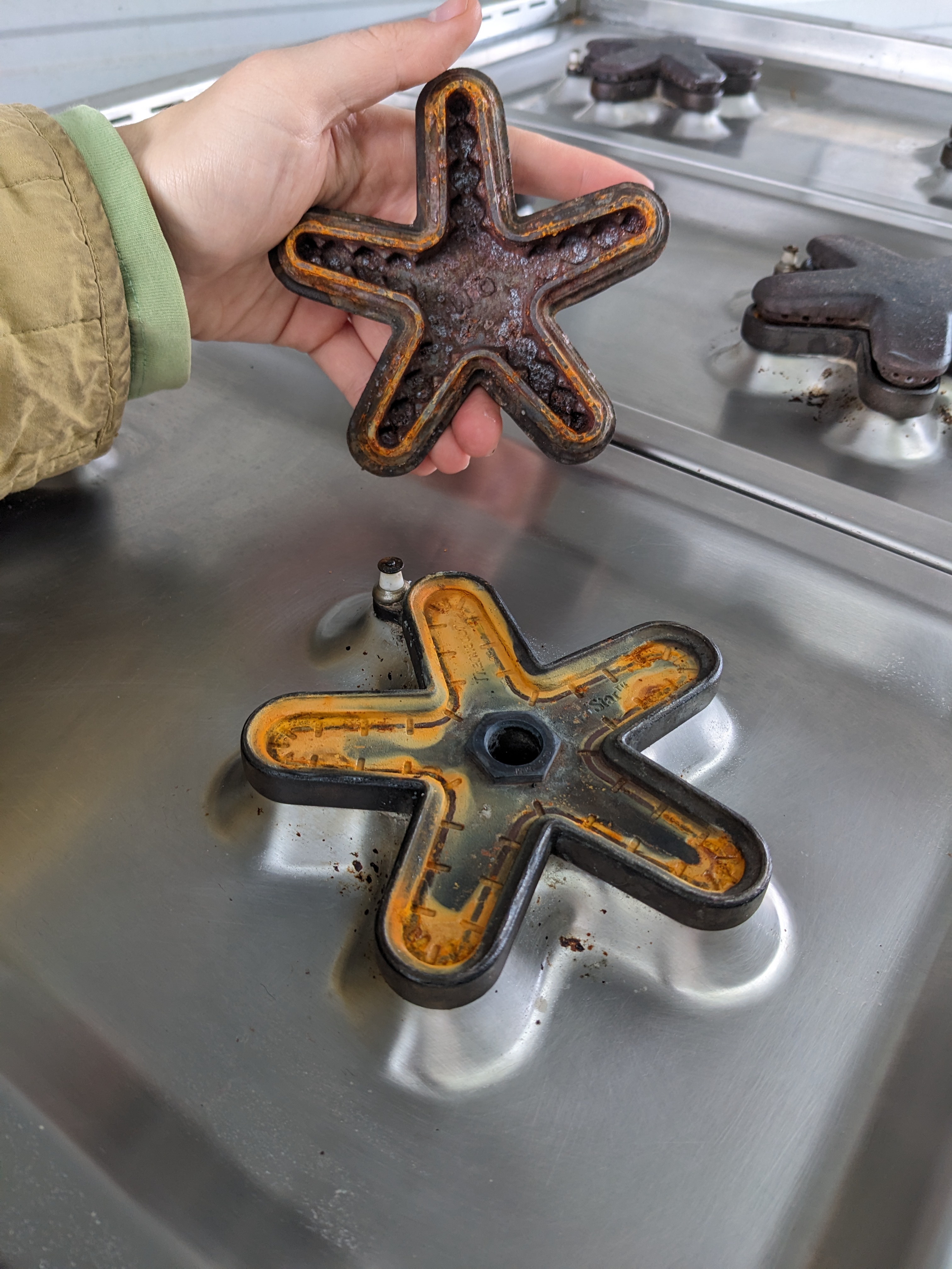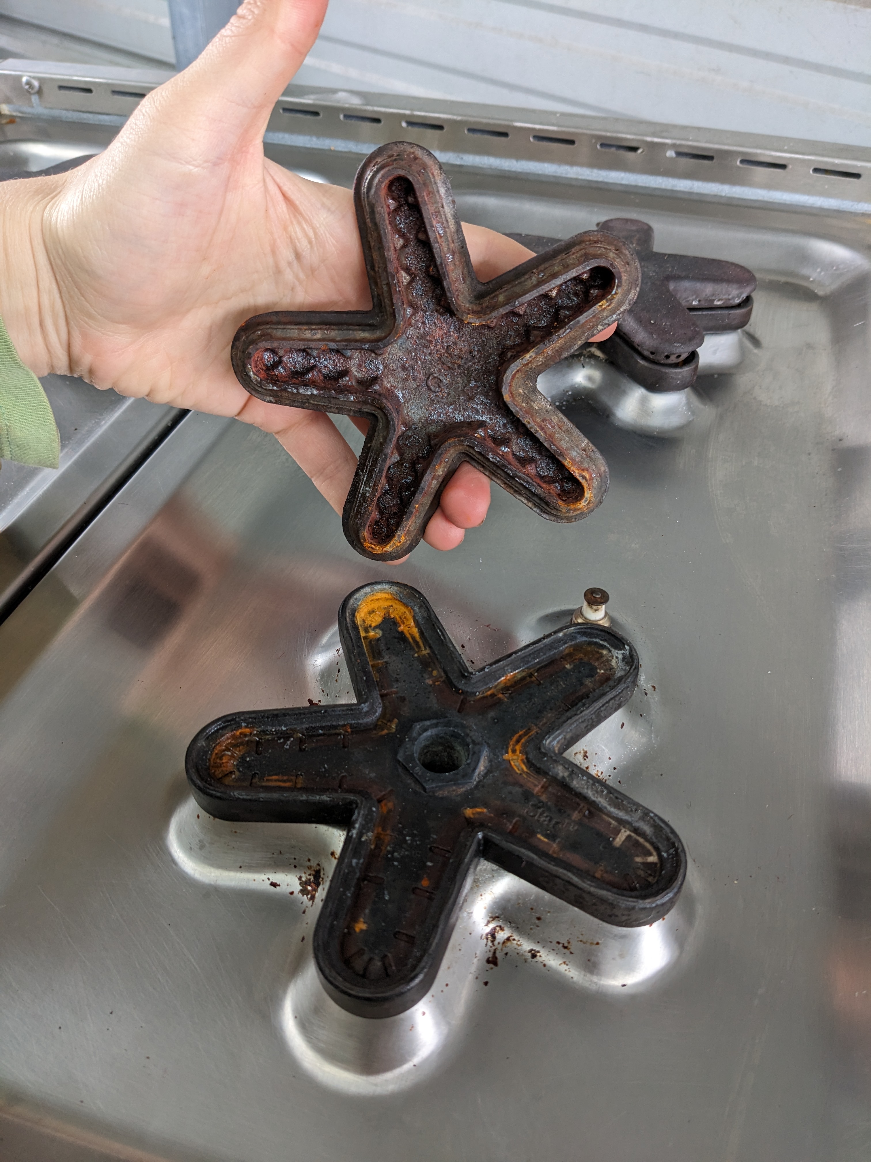36 x 26.5 x 8 Thermador professional six burner gas cooktop. Big Blue knobs on the front still turn with ease and are ready to get cookin! It is still in good cosmetic condition with shiny stainless steel with minimal scratching. The cast iron stove grates have begun to experience a range rusting in a few locations, not overwhelmingly, but notable. The electrical connection is in fantastic shape, however the old gas line connection seems to have been removed with some pipe cutters, it will likely need to be replaced. Untested, as is. The price reflects the condition.
