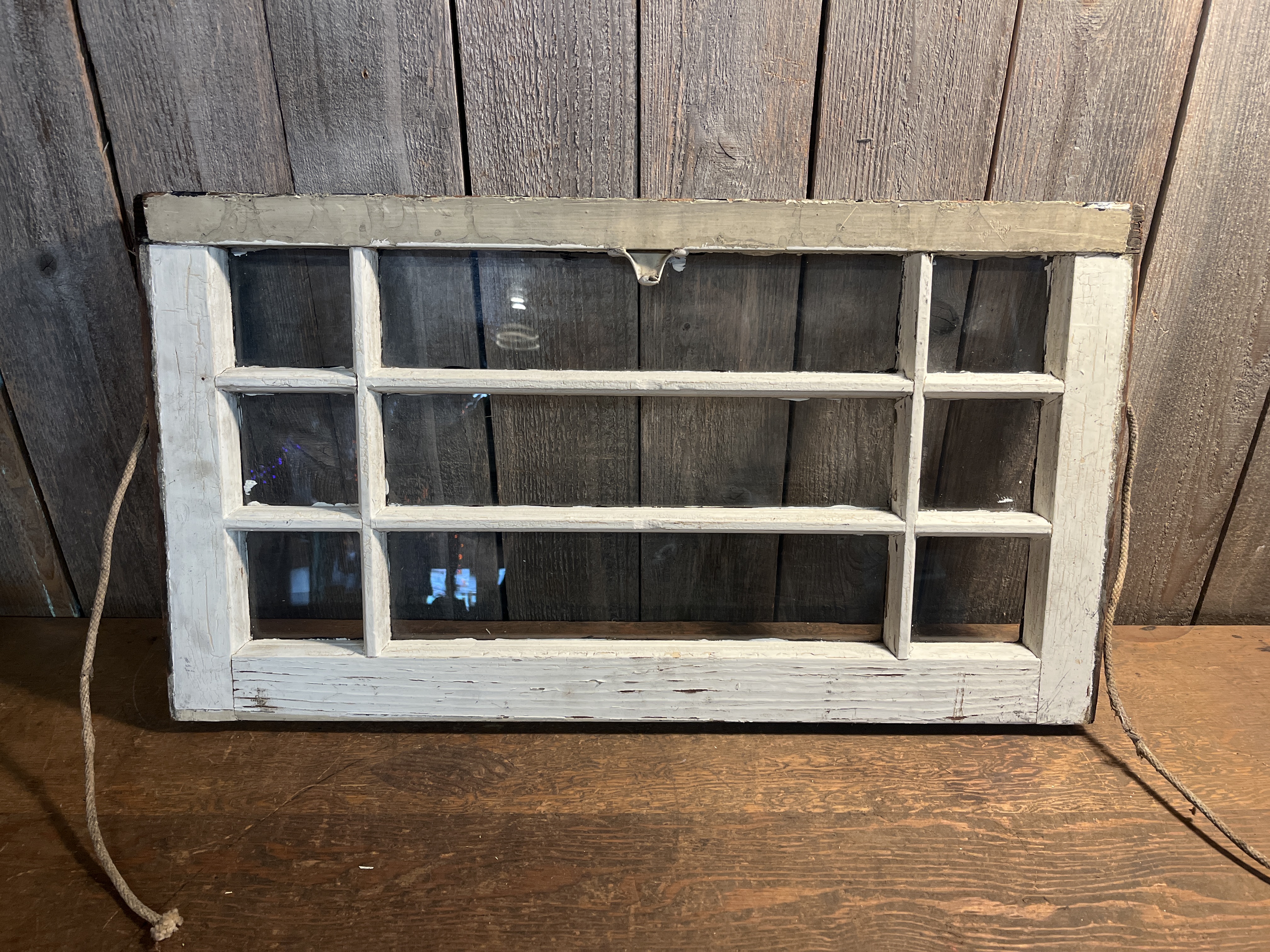 A lovely craftsman window with all 9 original panes intact. One side is painted black and one side is painted white. This window is in good shape throughout! Measures 28 x 15.375 x 1.75 inches.