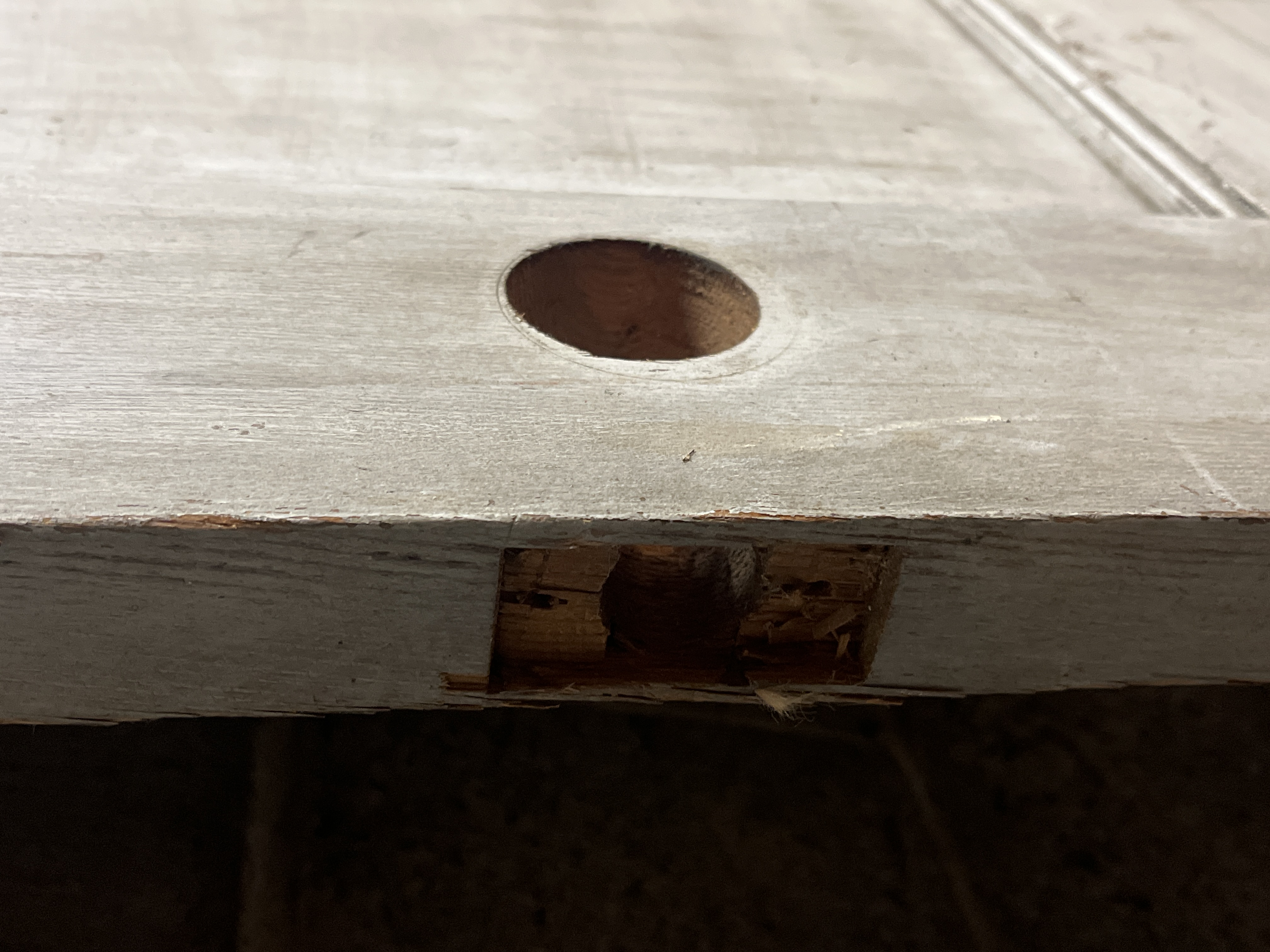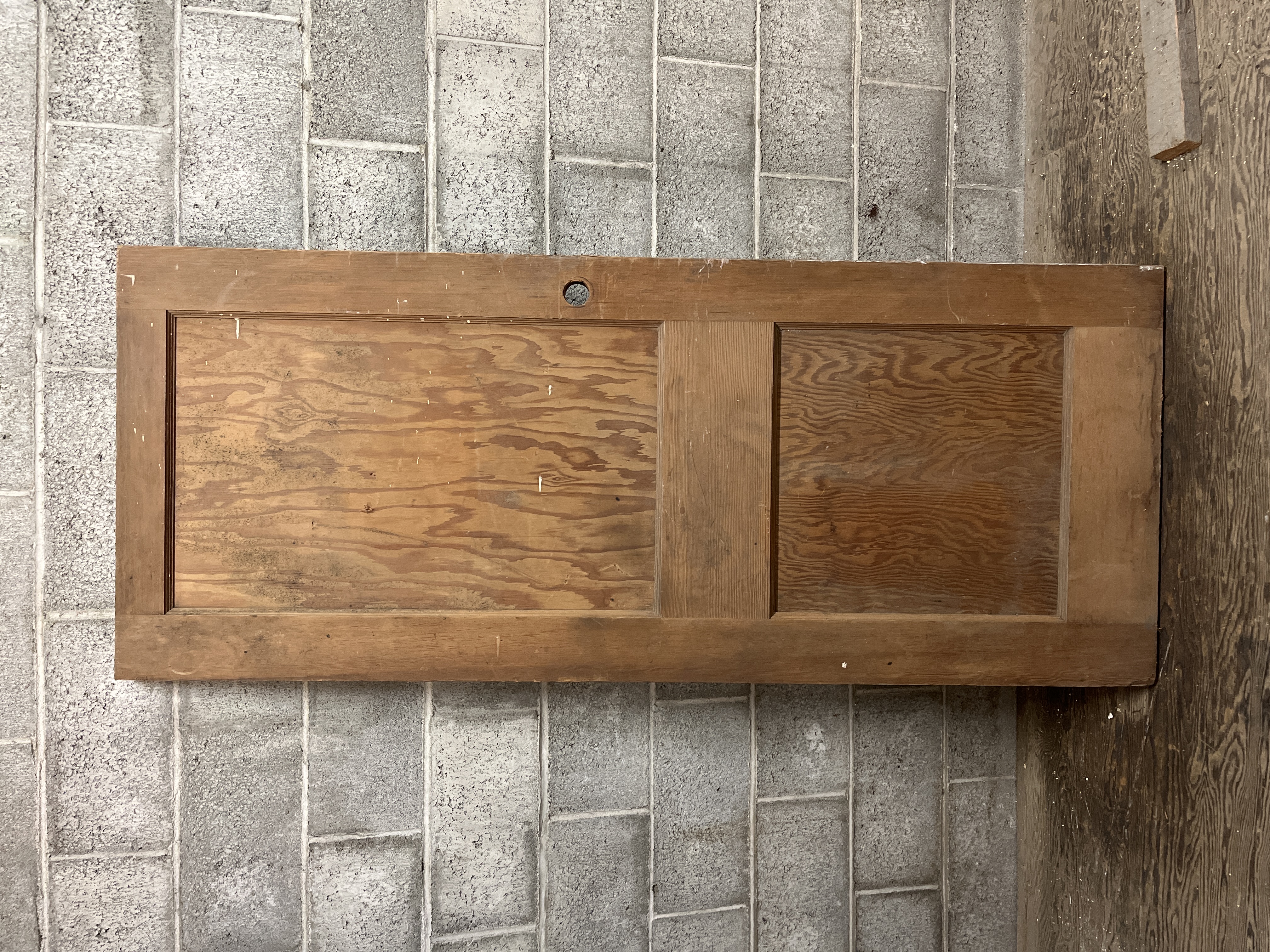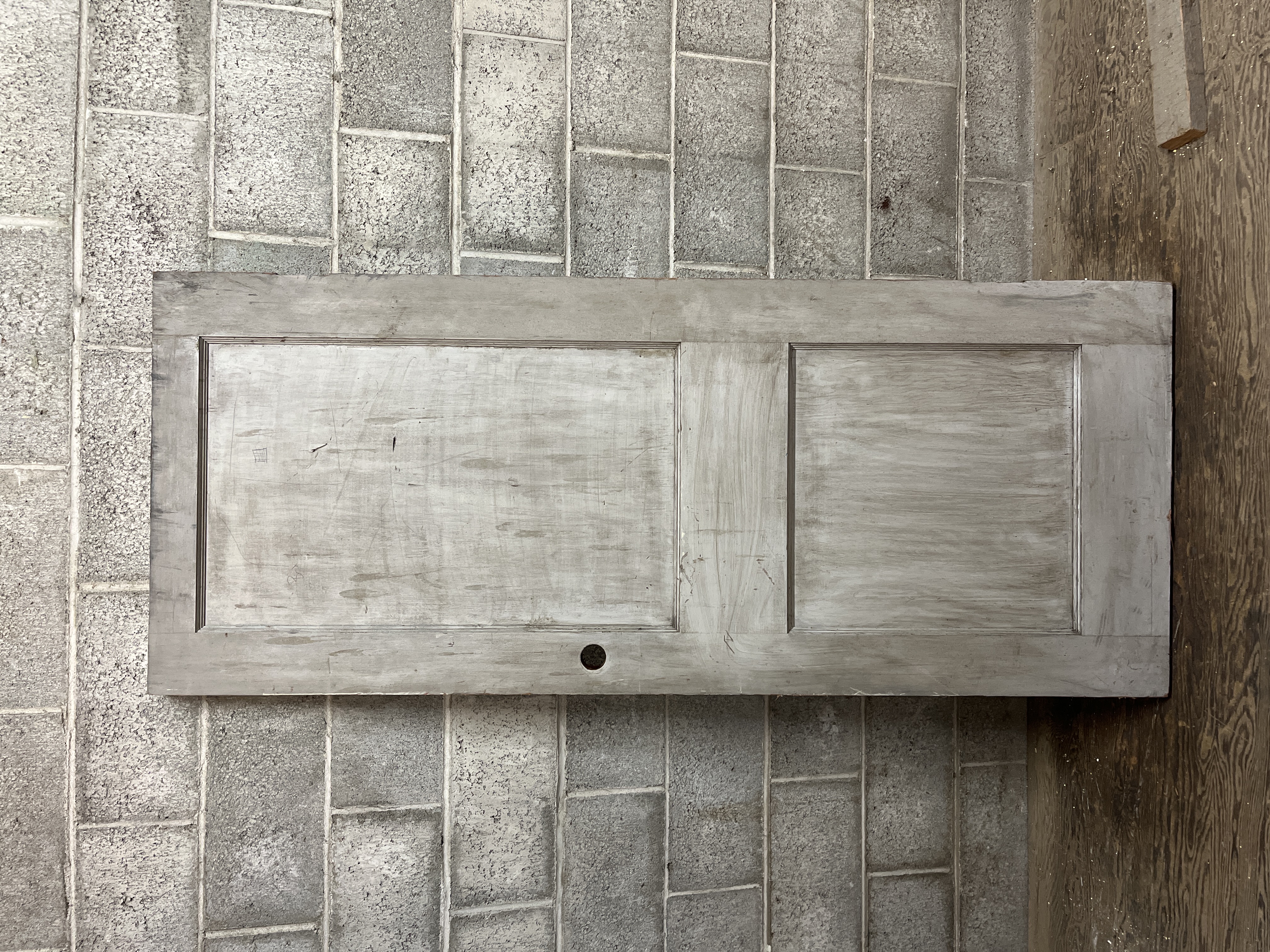 A harder to find short two panel door. This door is left hand swing. Looks to have been cut for a modern style knob set. One side is unpainted, and the other is grey. Measures 28 x 68 x 1.25 inches.
