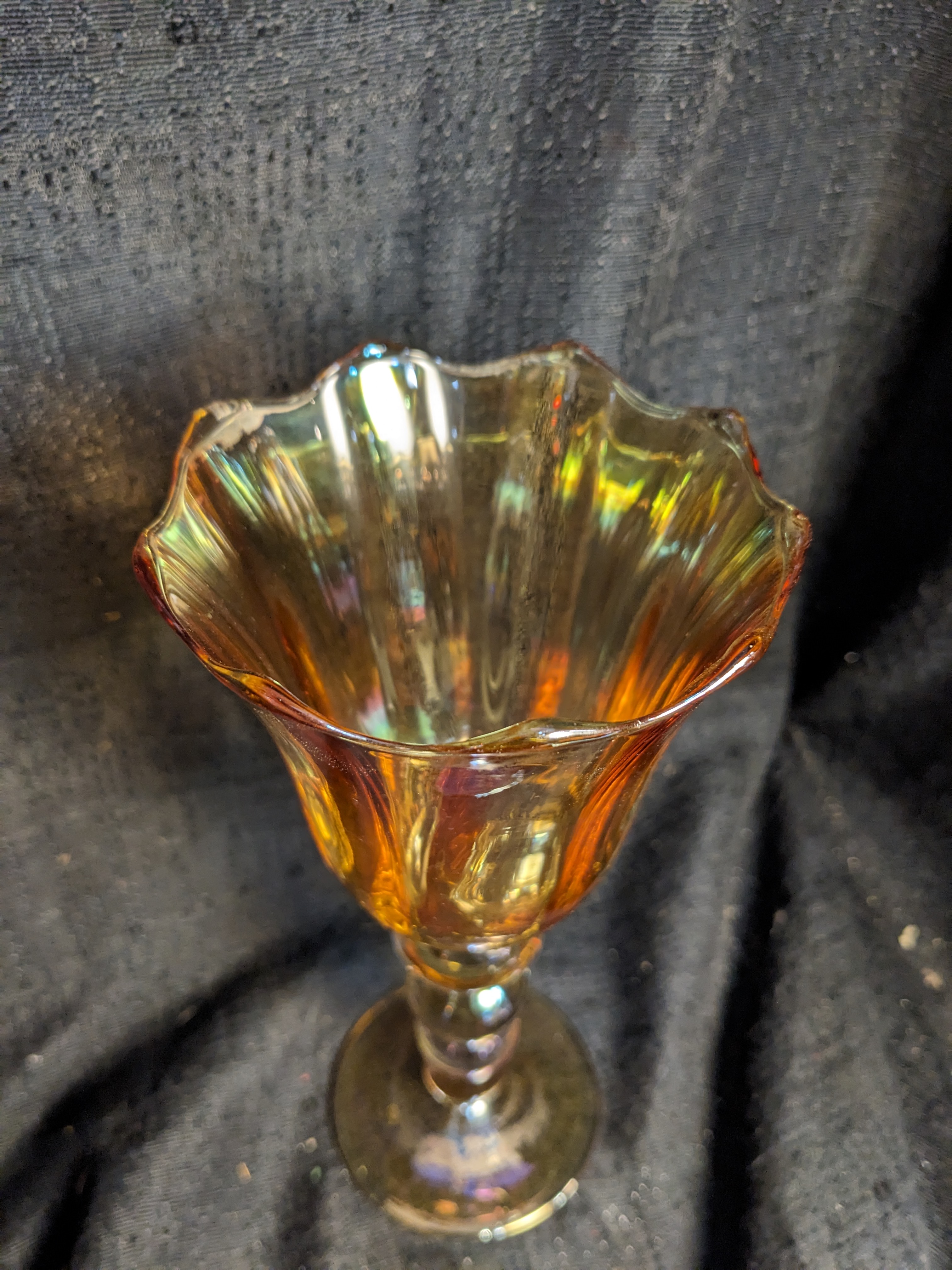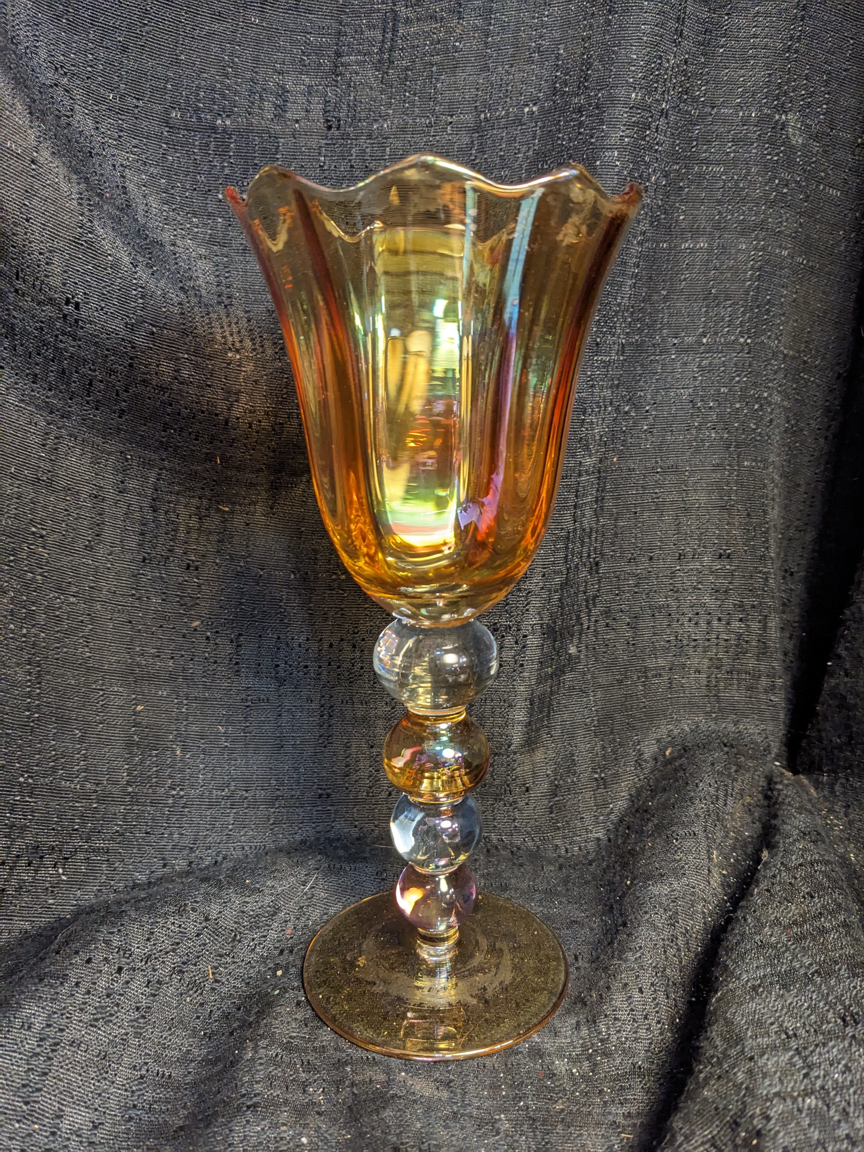 This iridescent, bubble stem goblet is in good condition.
