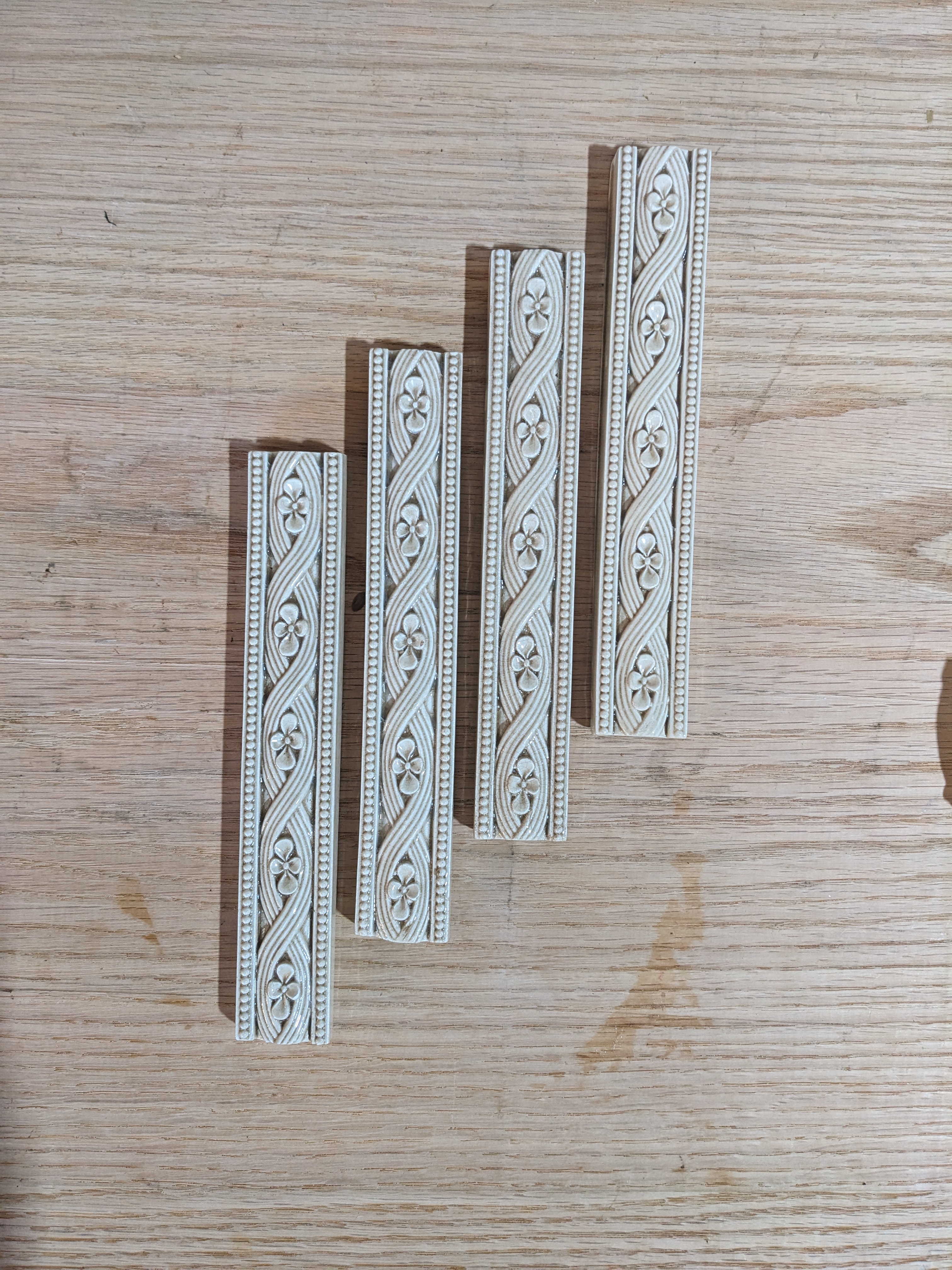 We dont have much, but these gorgeous ceramic border tiles are too adorable to let go to waste. A dotted border encases a double helix which in each of its openings holds a four petaled flower. So cute. We only have 4 pieces, sold all together. 8 x 1.25 x .5