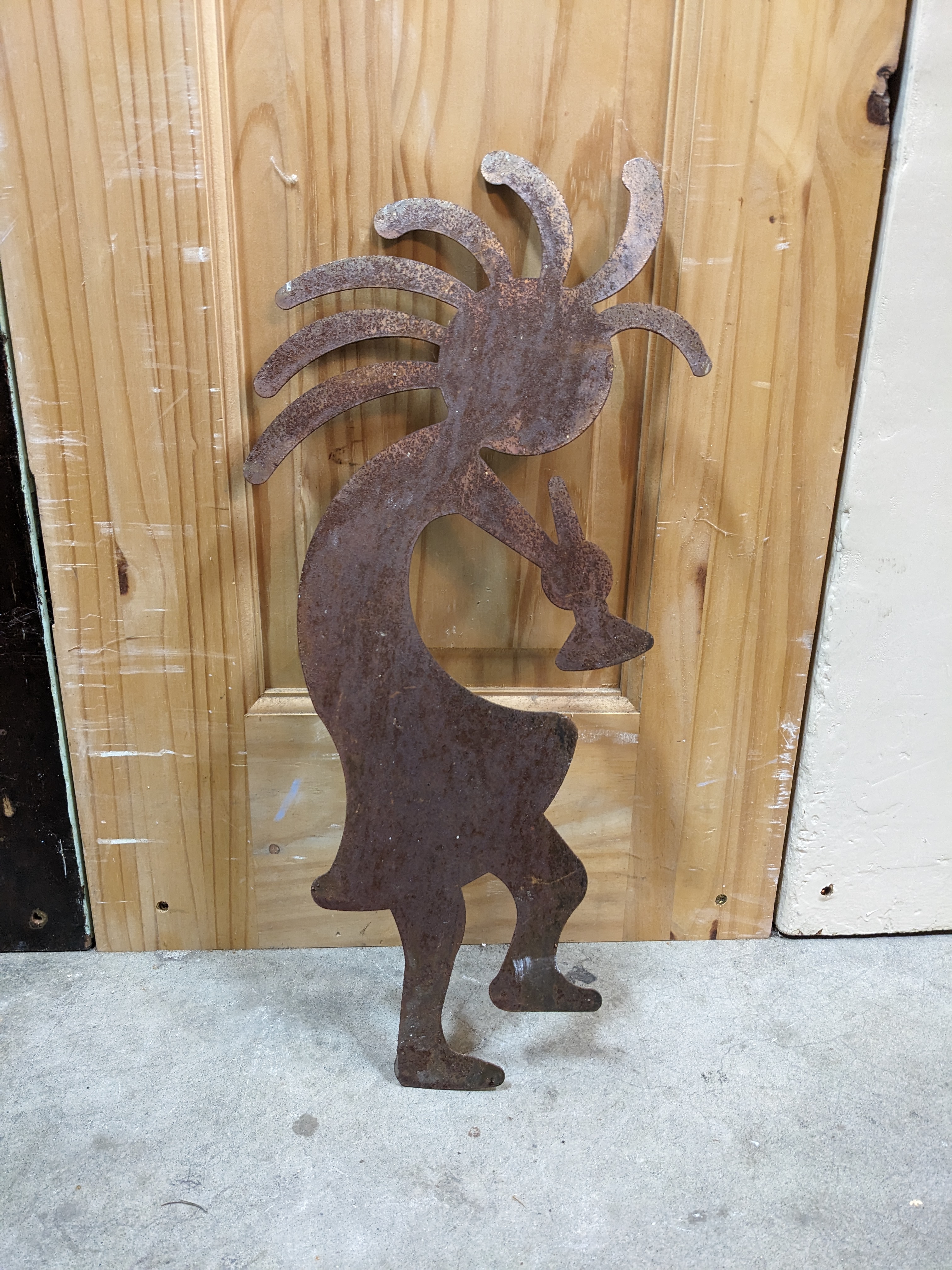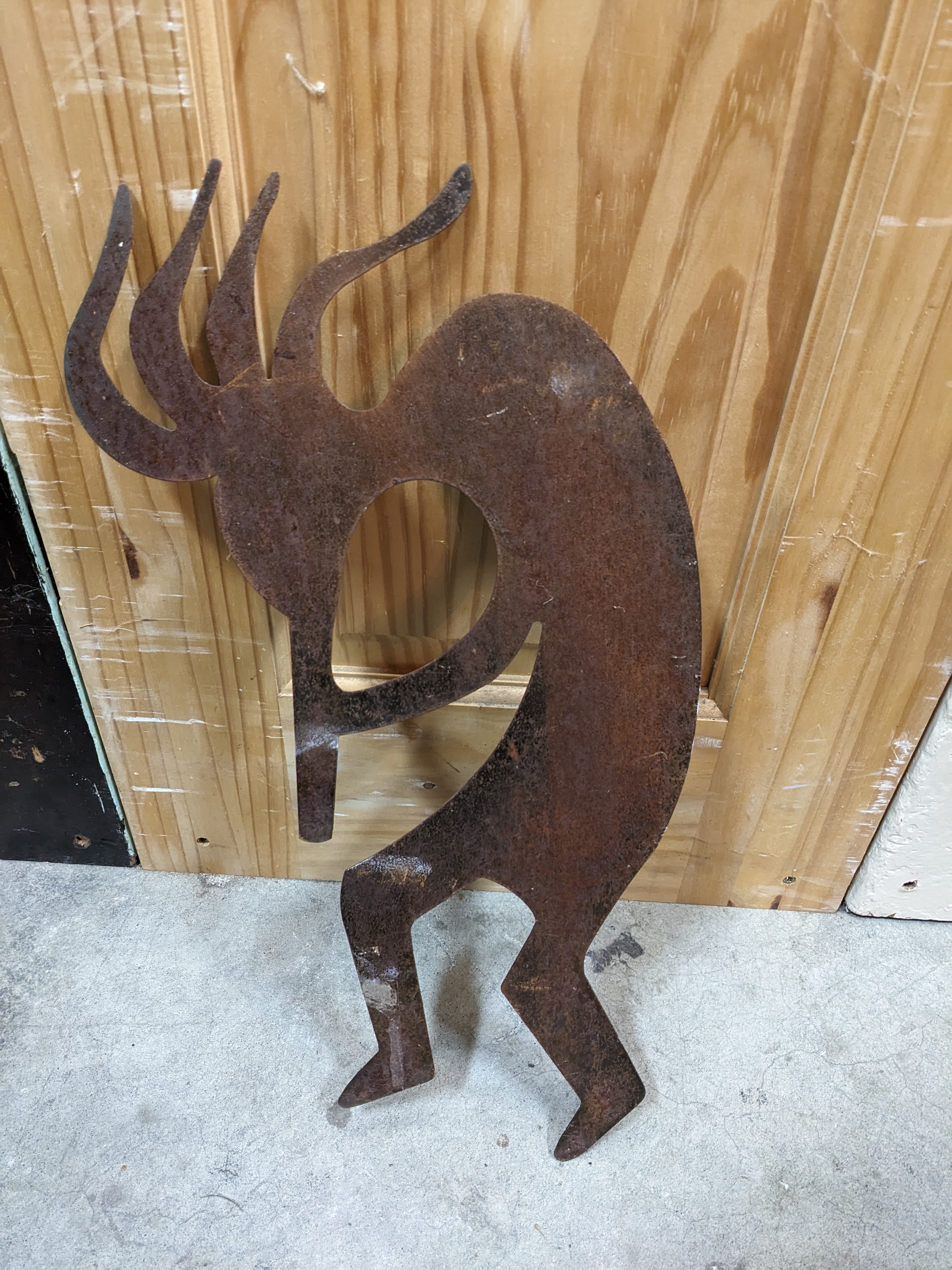 Made from steel with a rustic or rusted finish. The design style depicts a common figure in Native American Mythology known as Kokopelli. Who symbolizes Bounty, Fertility, Music and Life, as well as a rustic charm to homes.They're in pretty good condition as well.