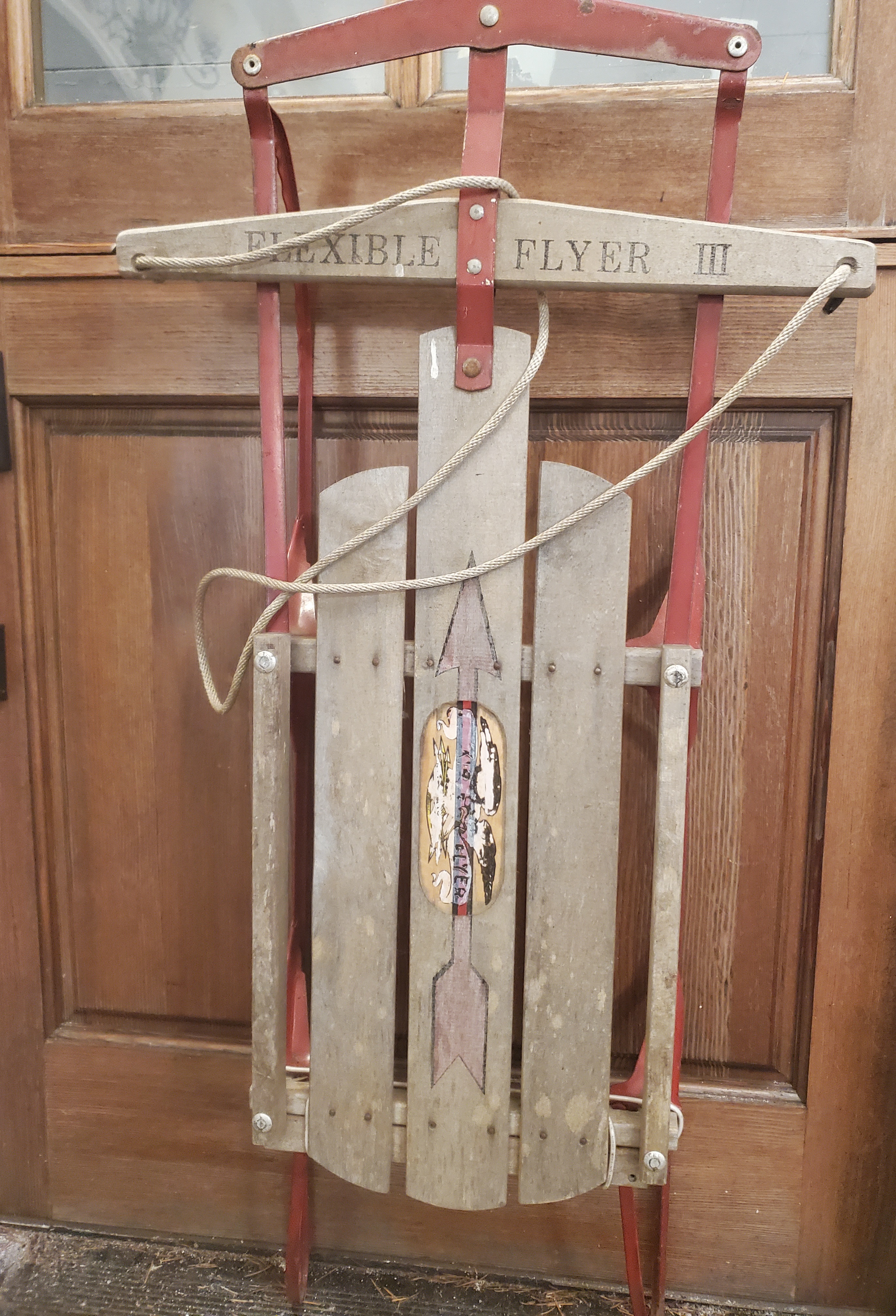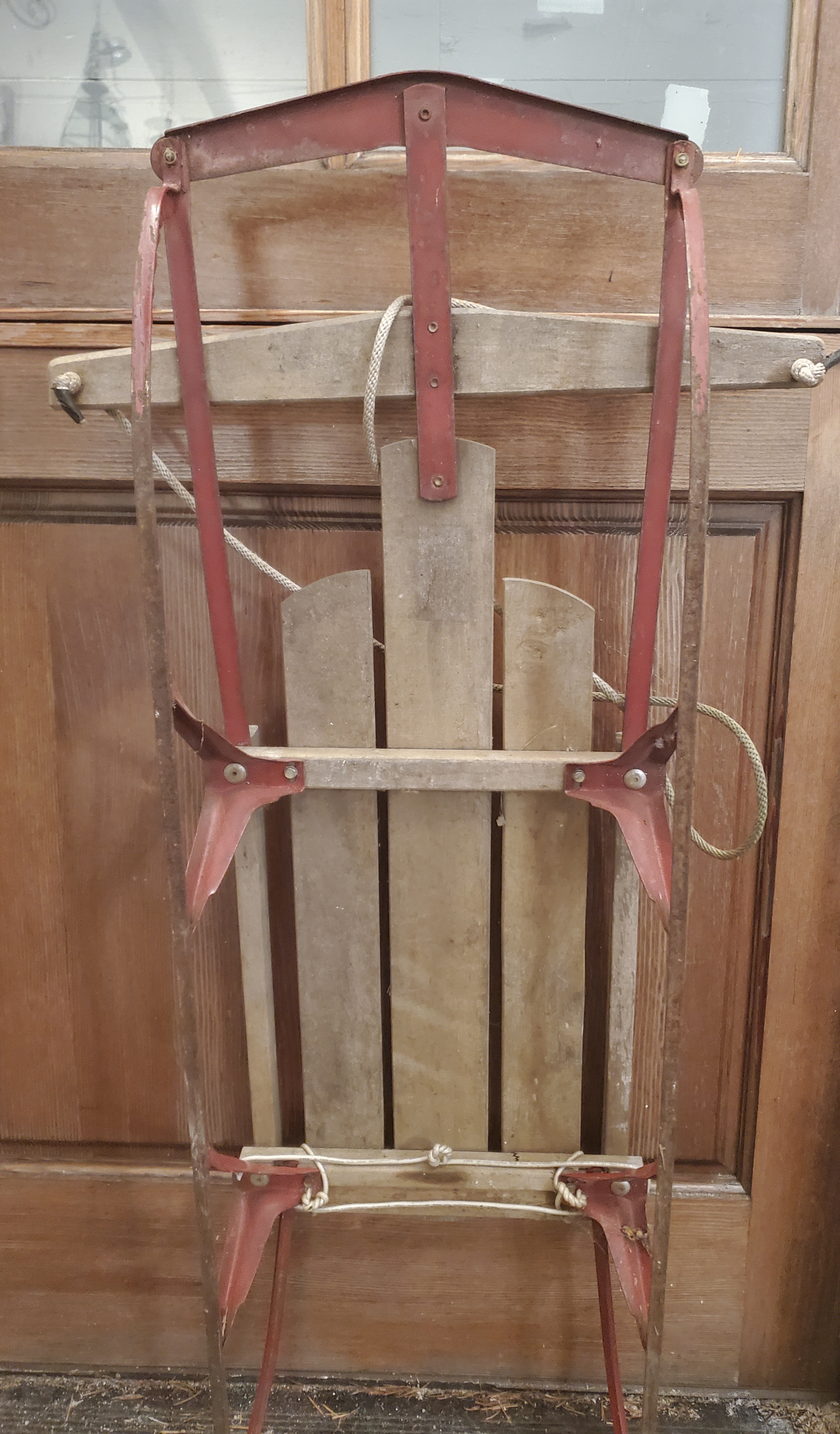 This is an antique sled and not recommended for safe sledding. Beautiful as a nostalgic collectible or for the Extreme sport slender in your family. Great holiday decor!