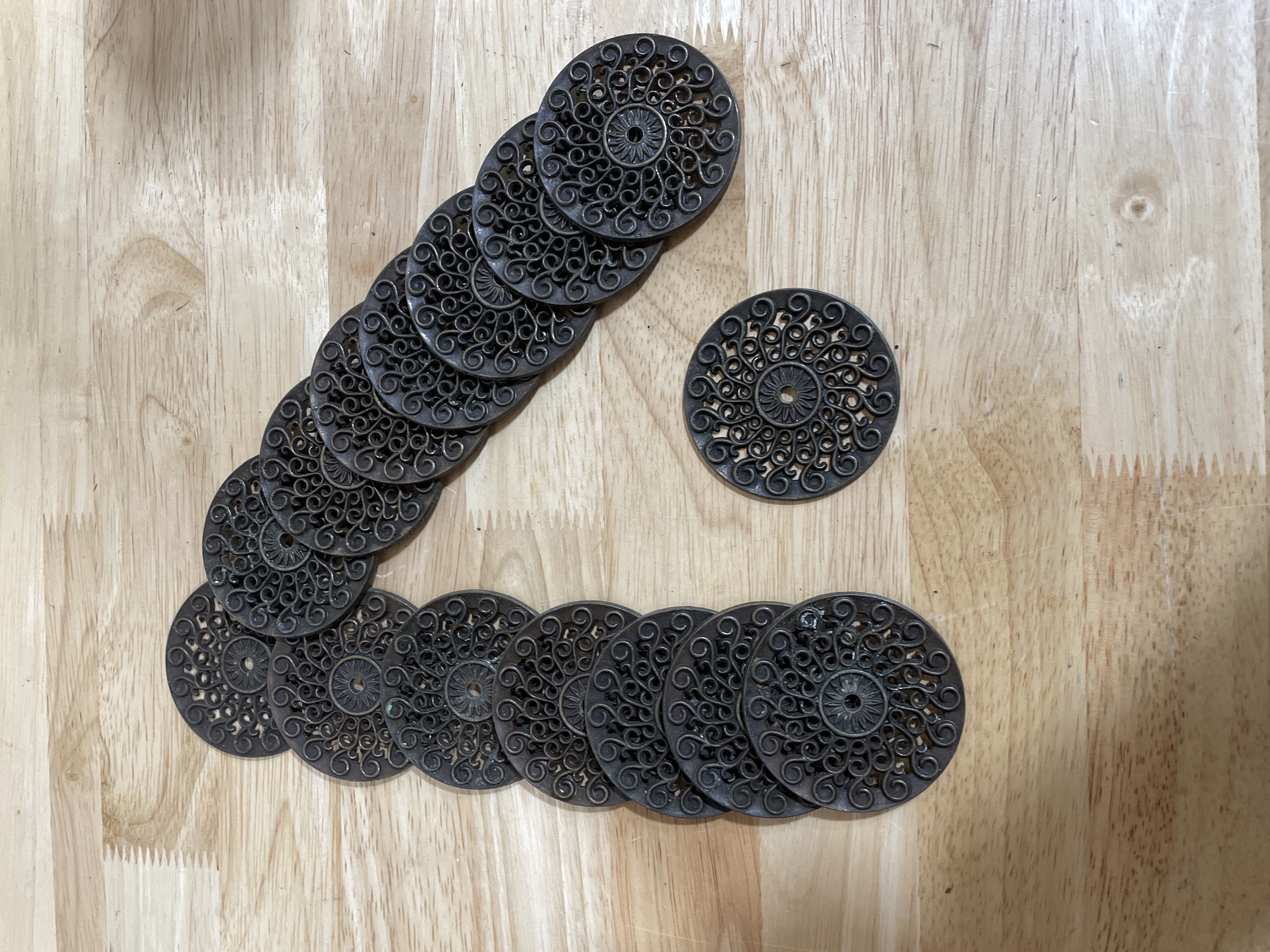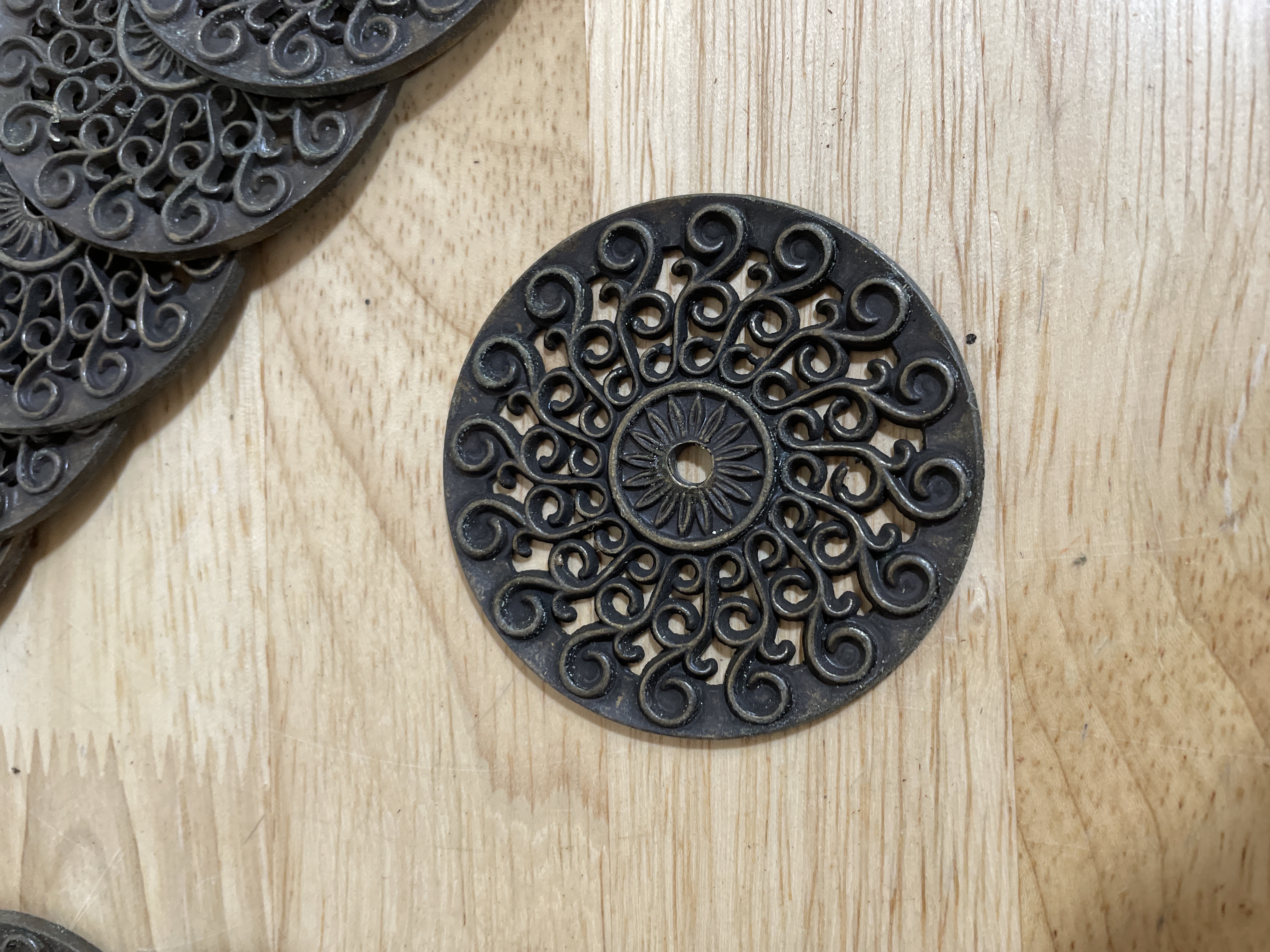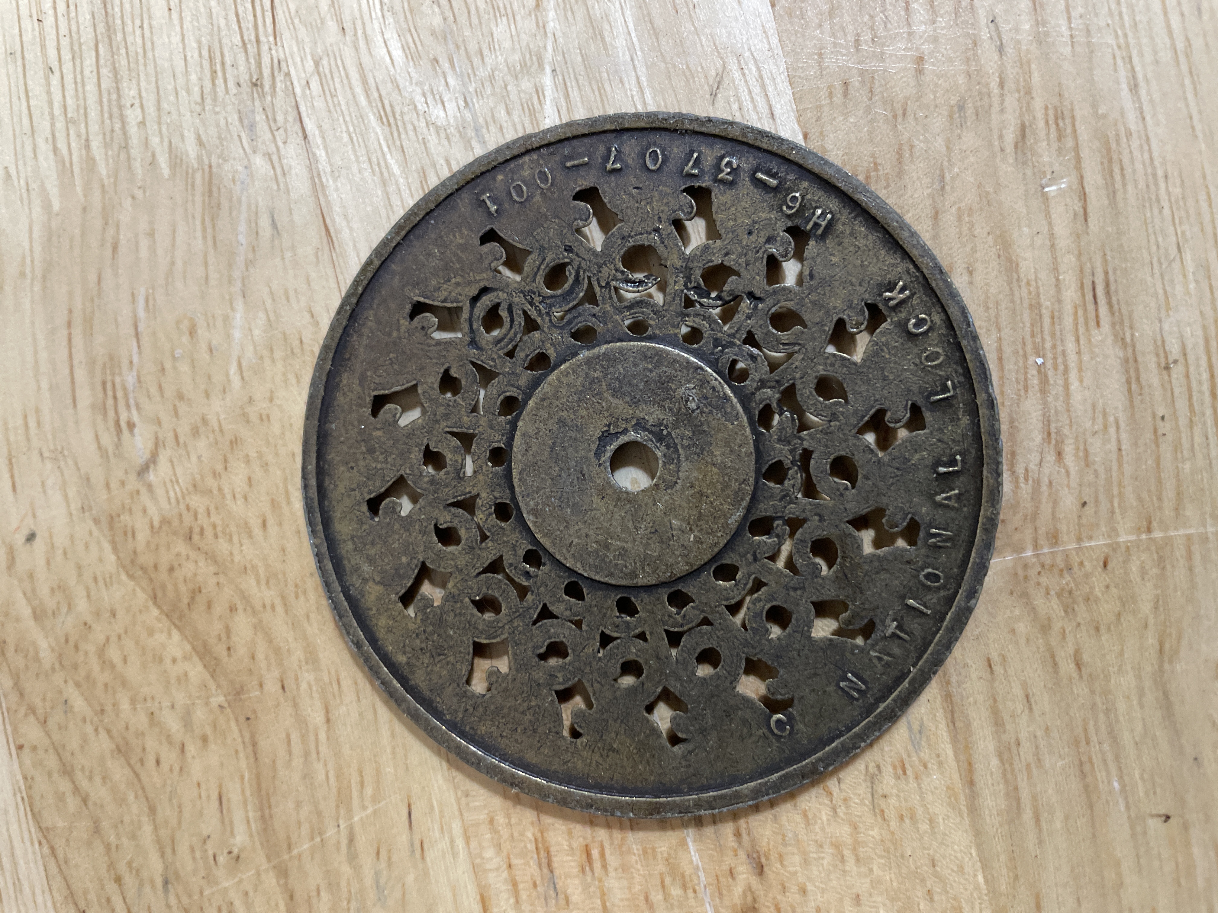 Brass ornate backplate with scrolling designs.