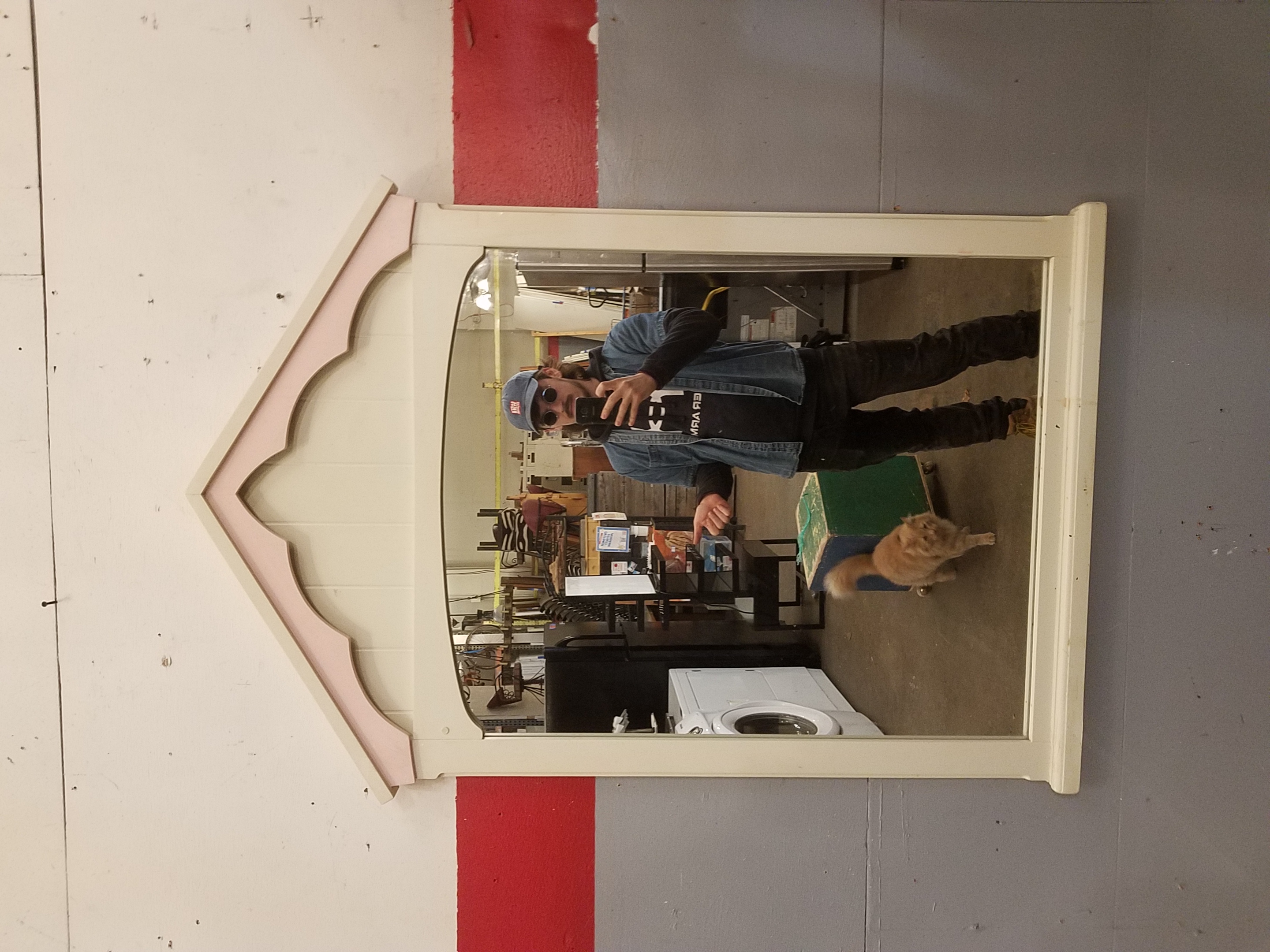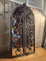 Funky styled mirror in good condition, sort of looks like the front of a house.
