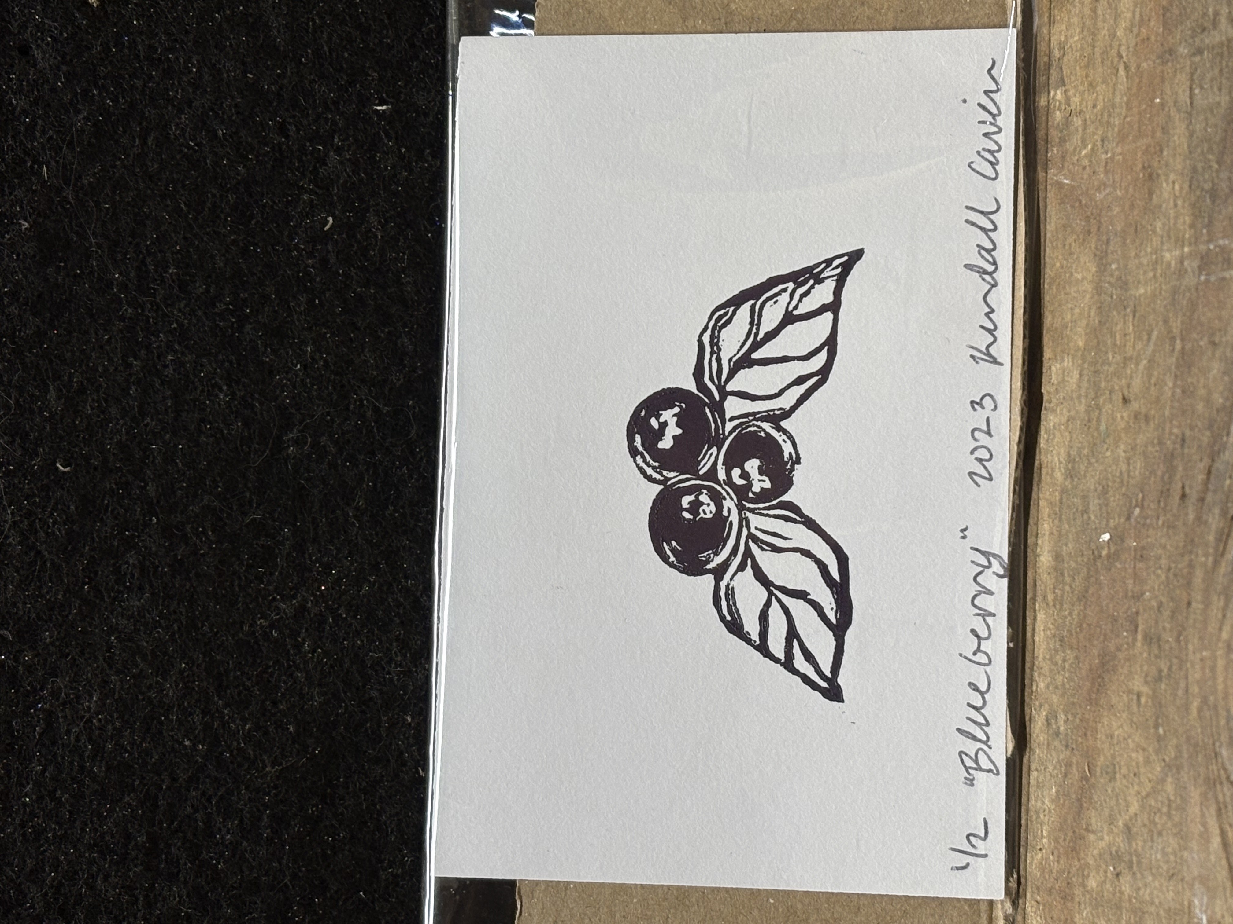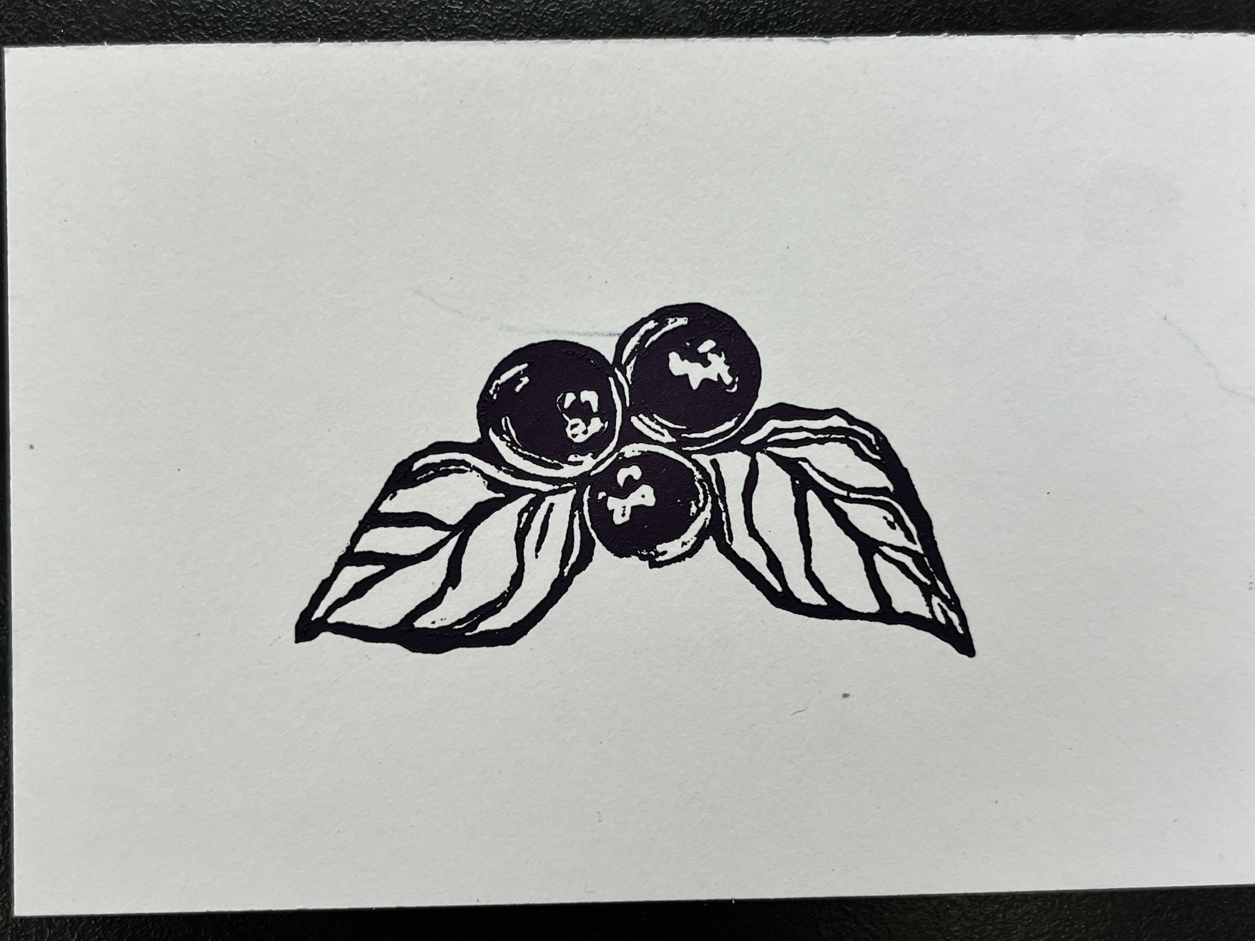 Original linocut relief print of a small cluster of blueberries inked in a midnight blue.