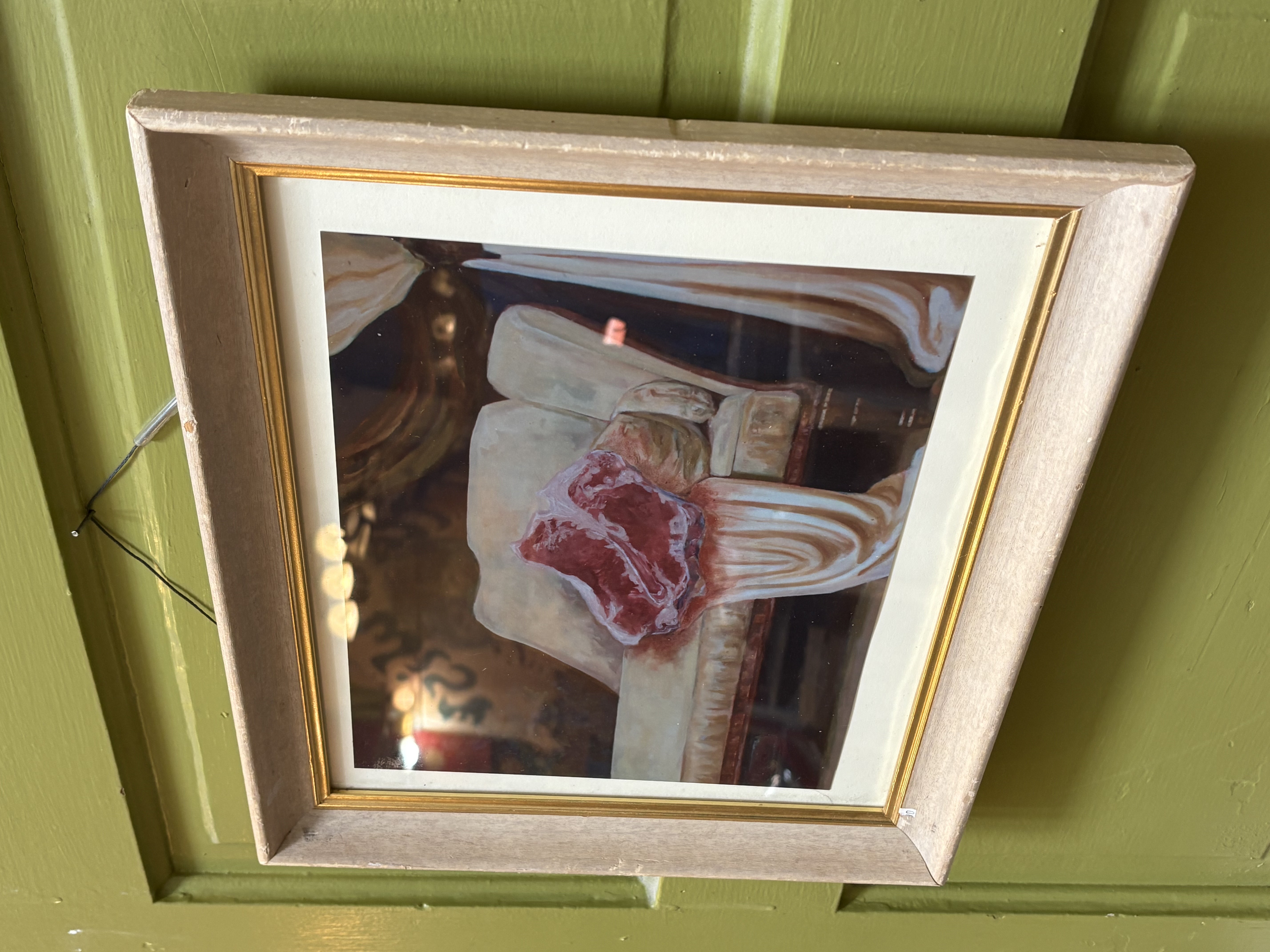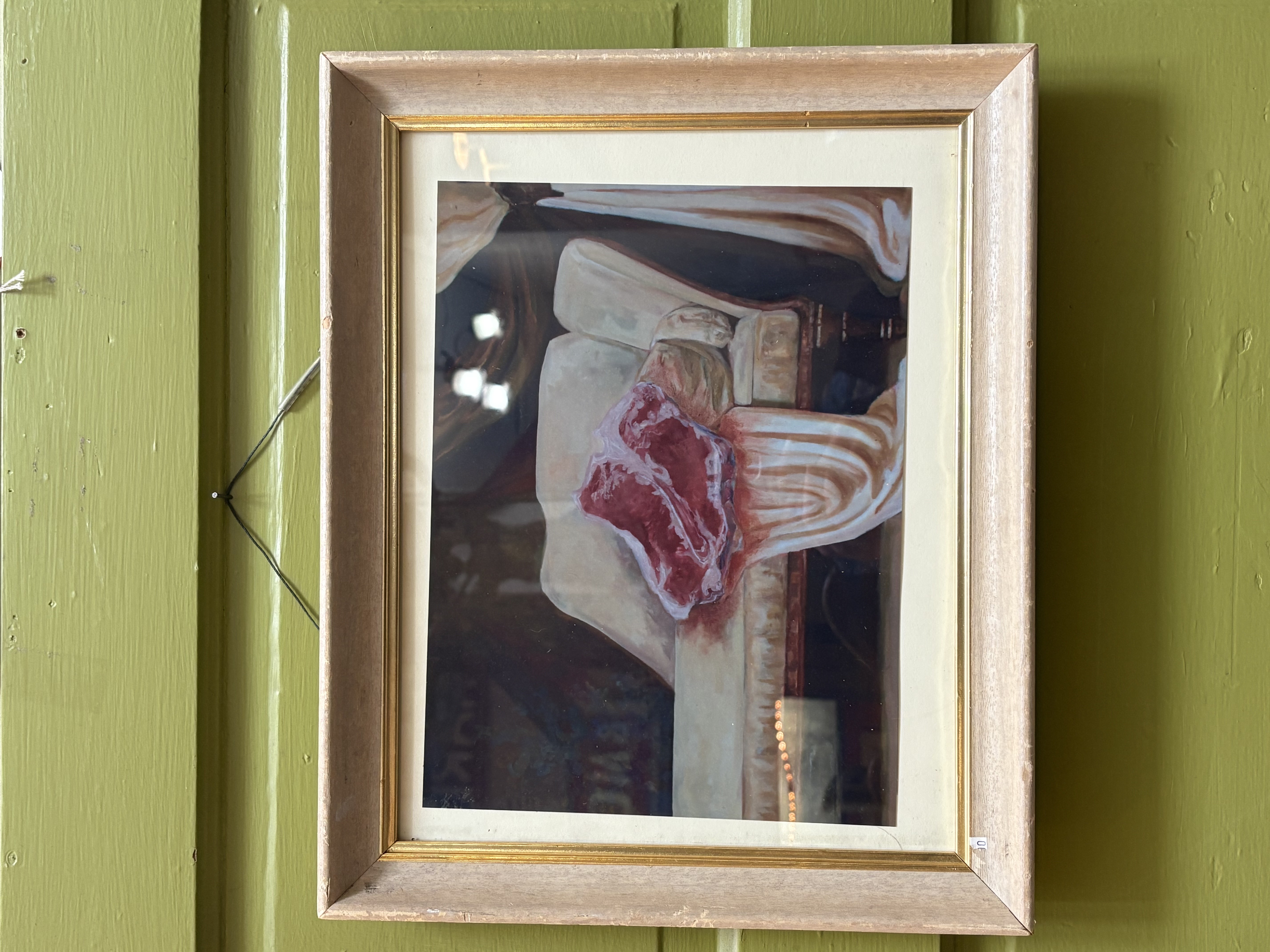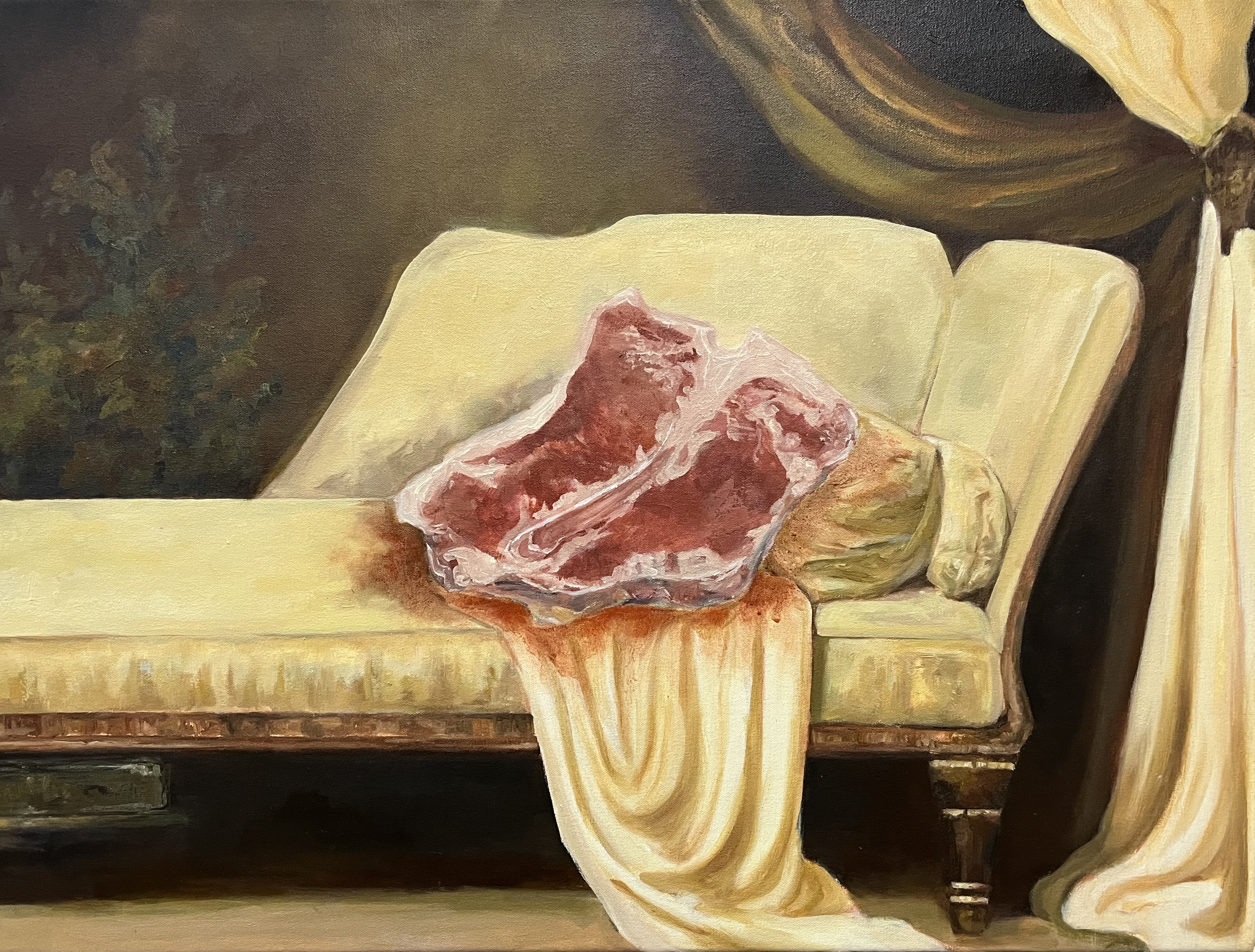 Print of an original oil painting featuring a slab of raw steak reclining luxuriously on a chaise lounge in a classical style.