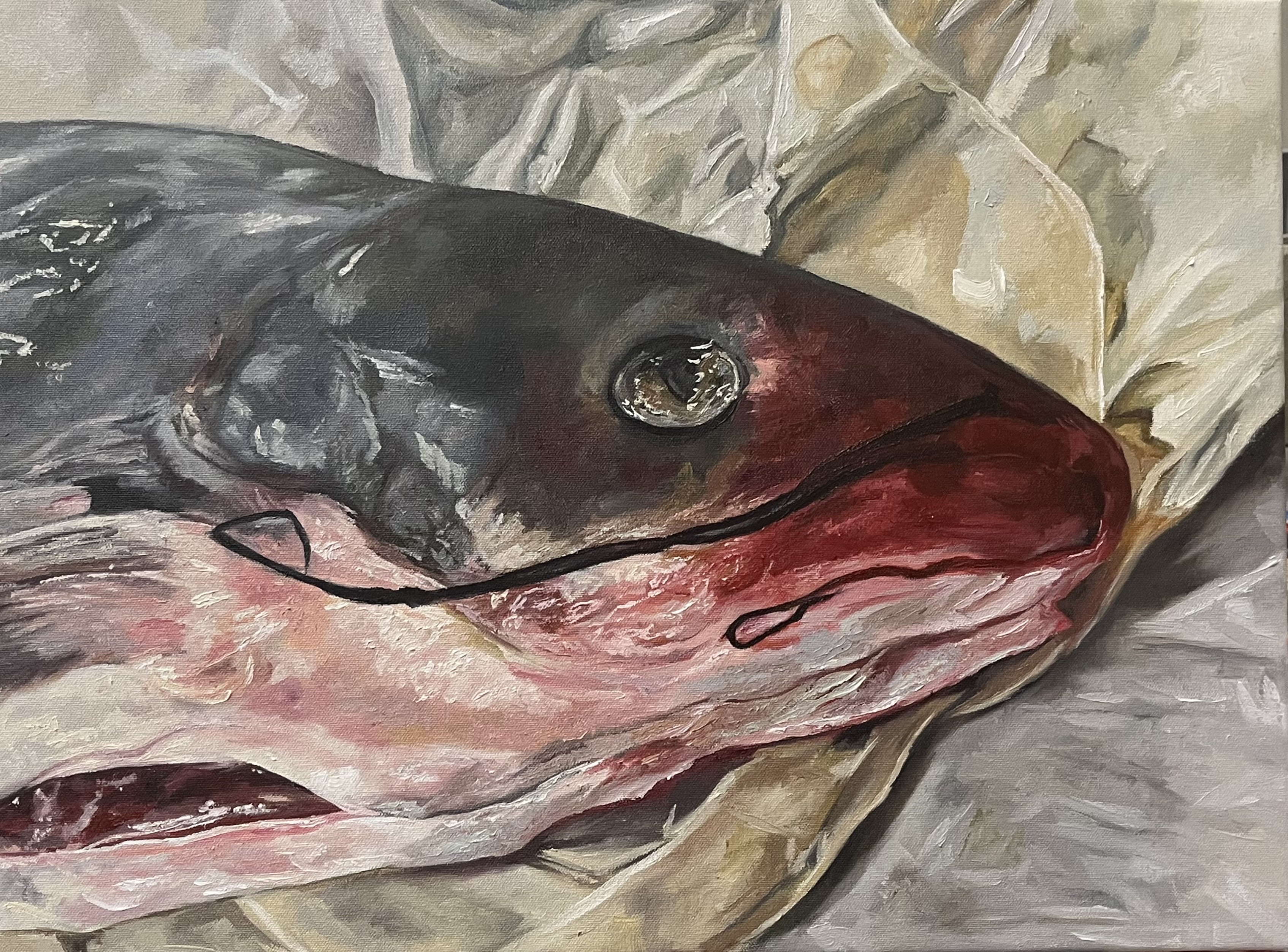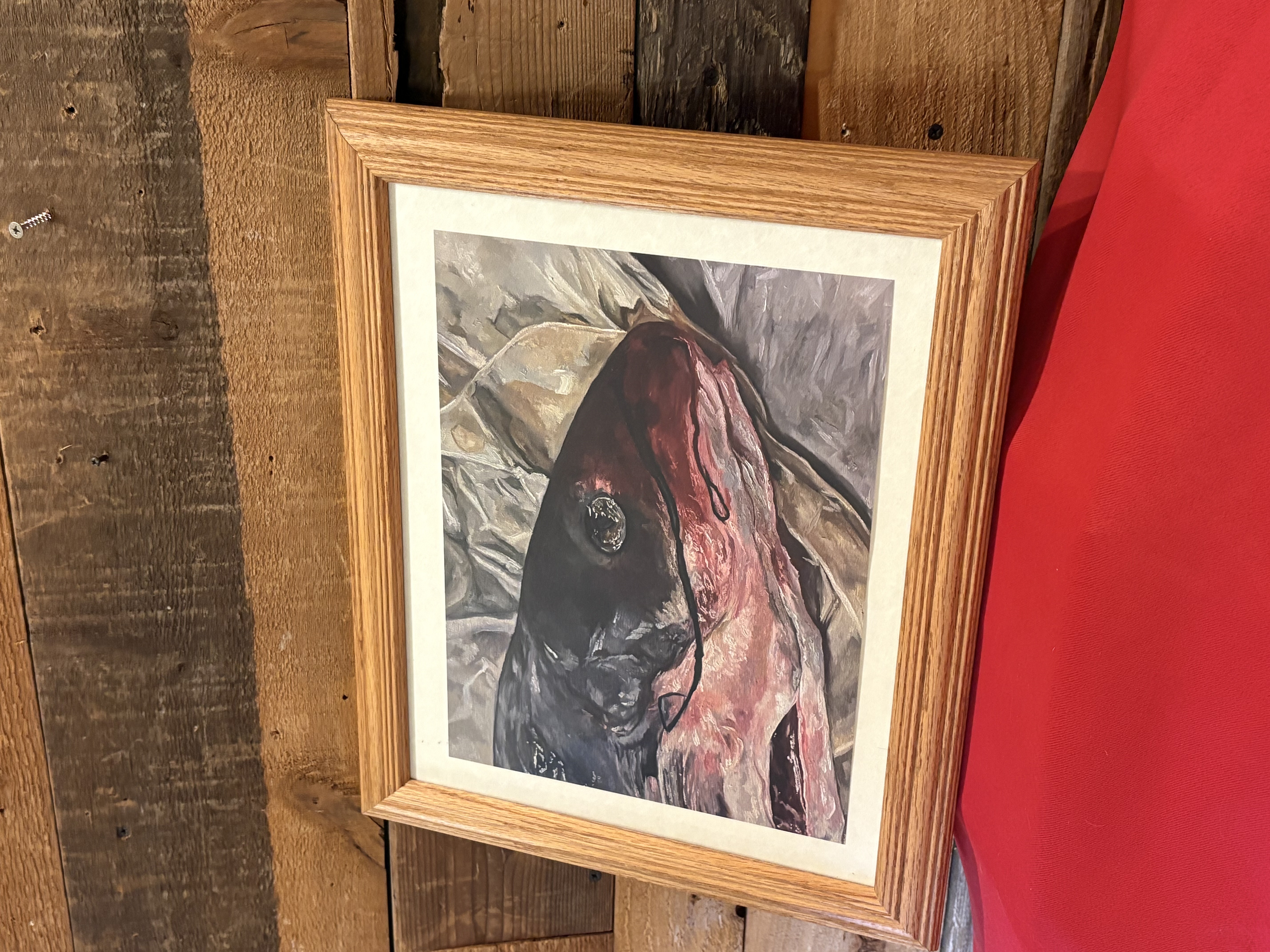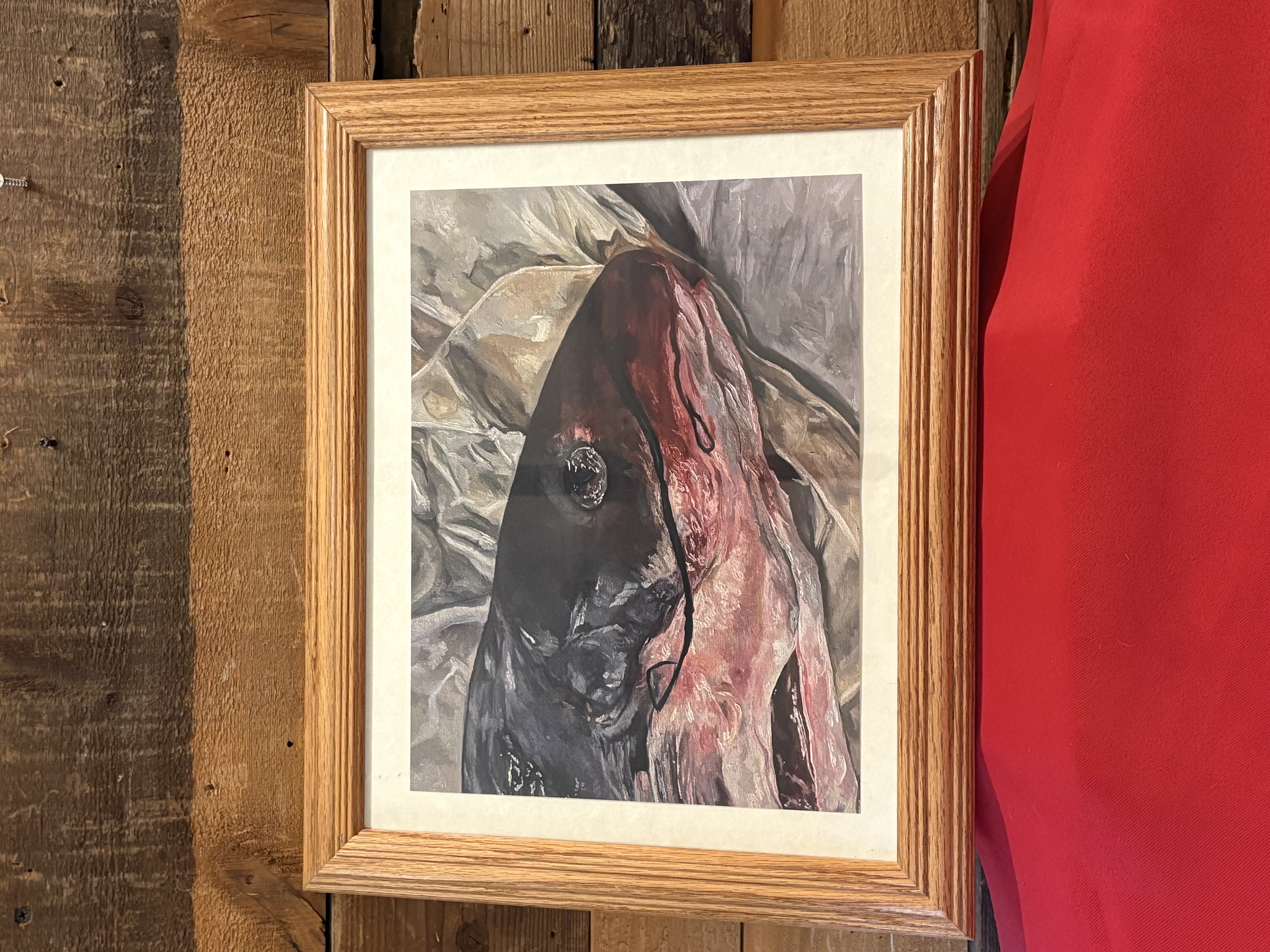 Print of an original oil painting picturing an alluring raw catfish purchased from Winco in Spokane, WA.