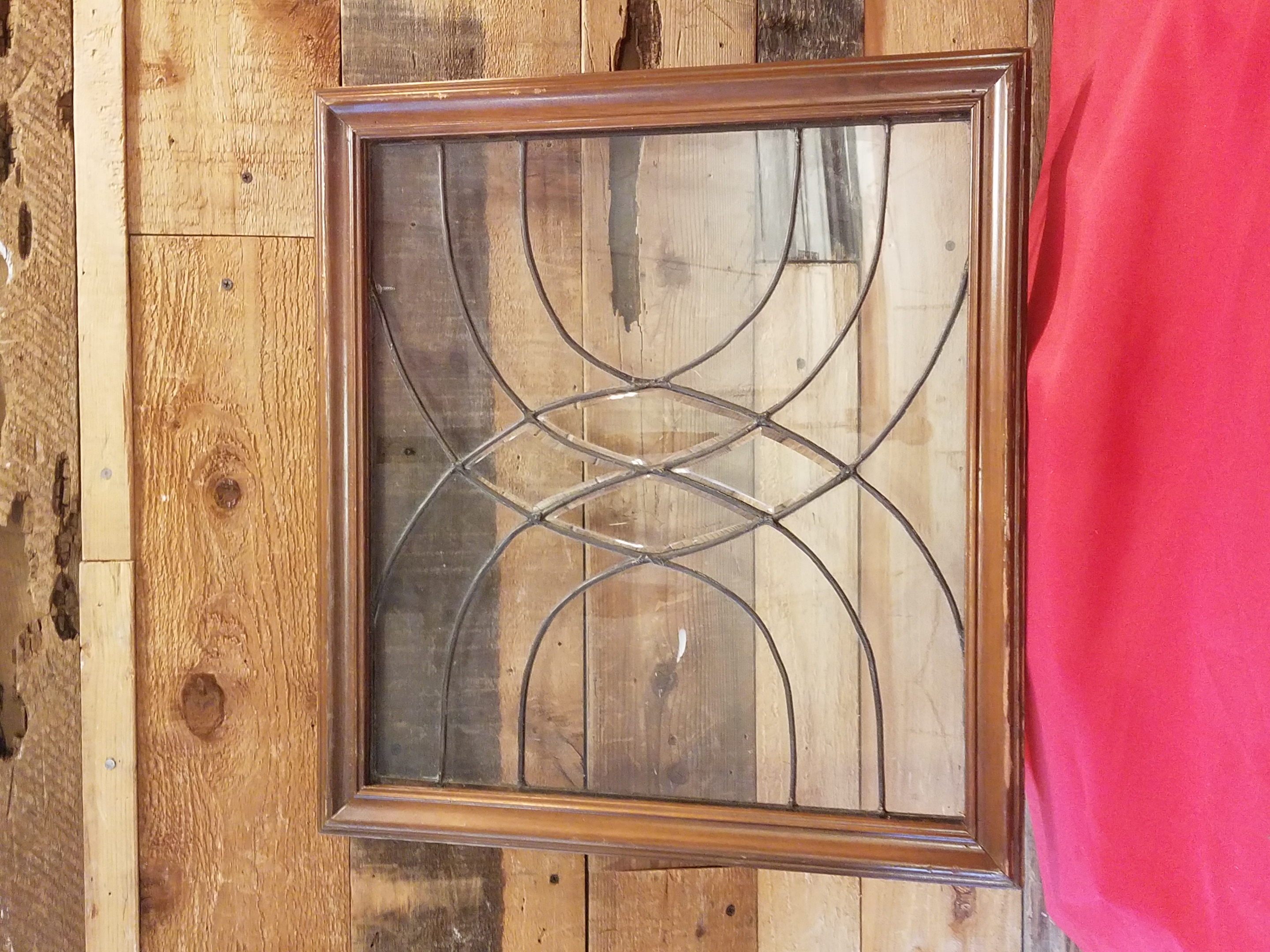 Lovely little beveled window with arching panels of leaded clear glass set in a square-ish wooden frame.
