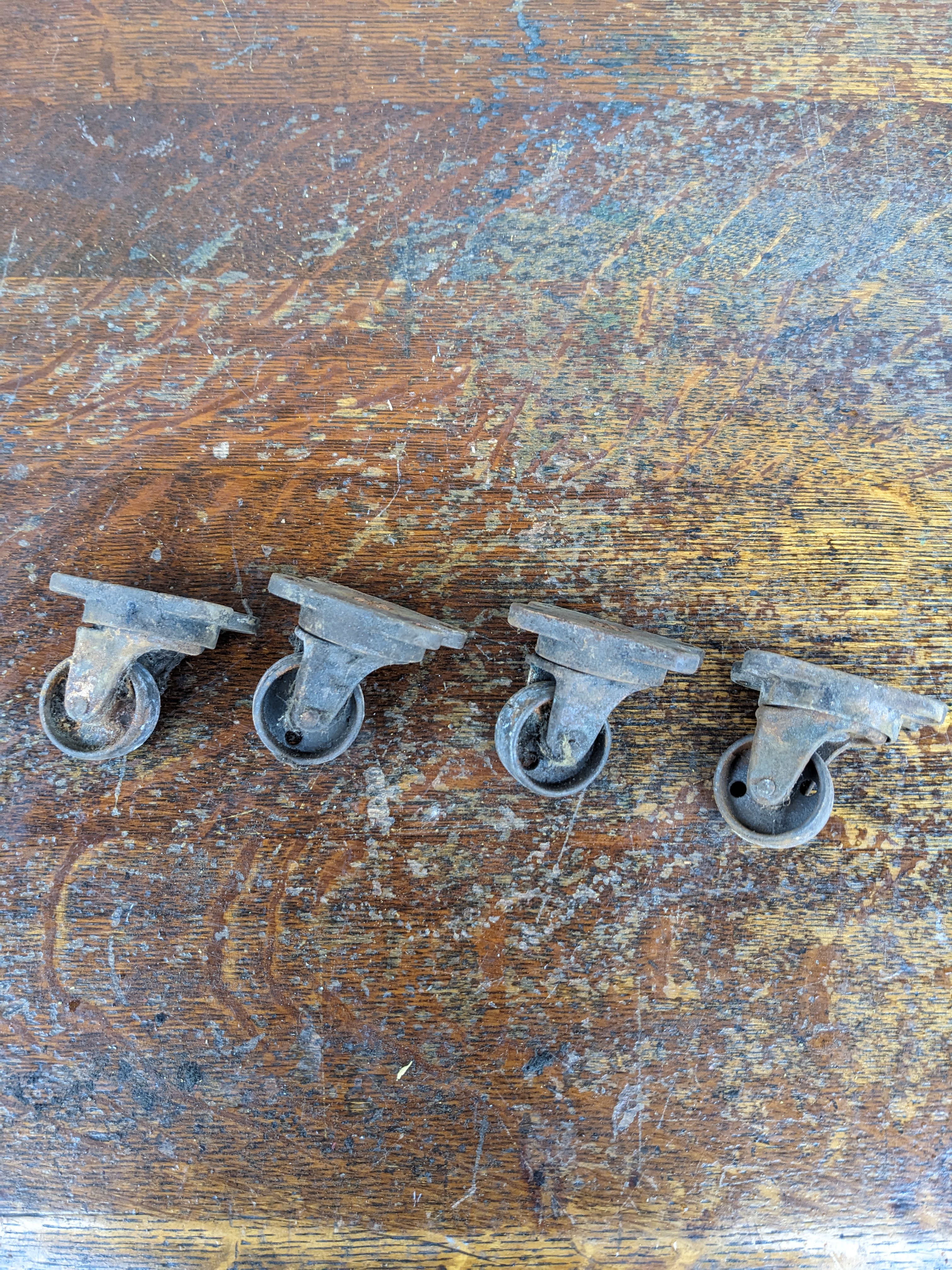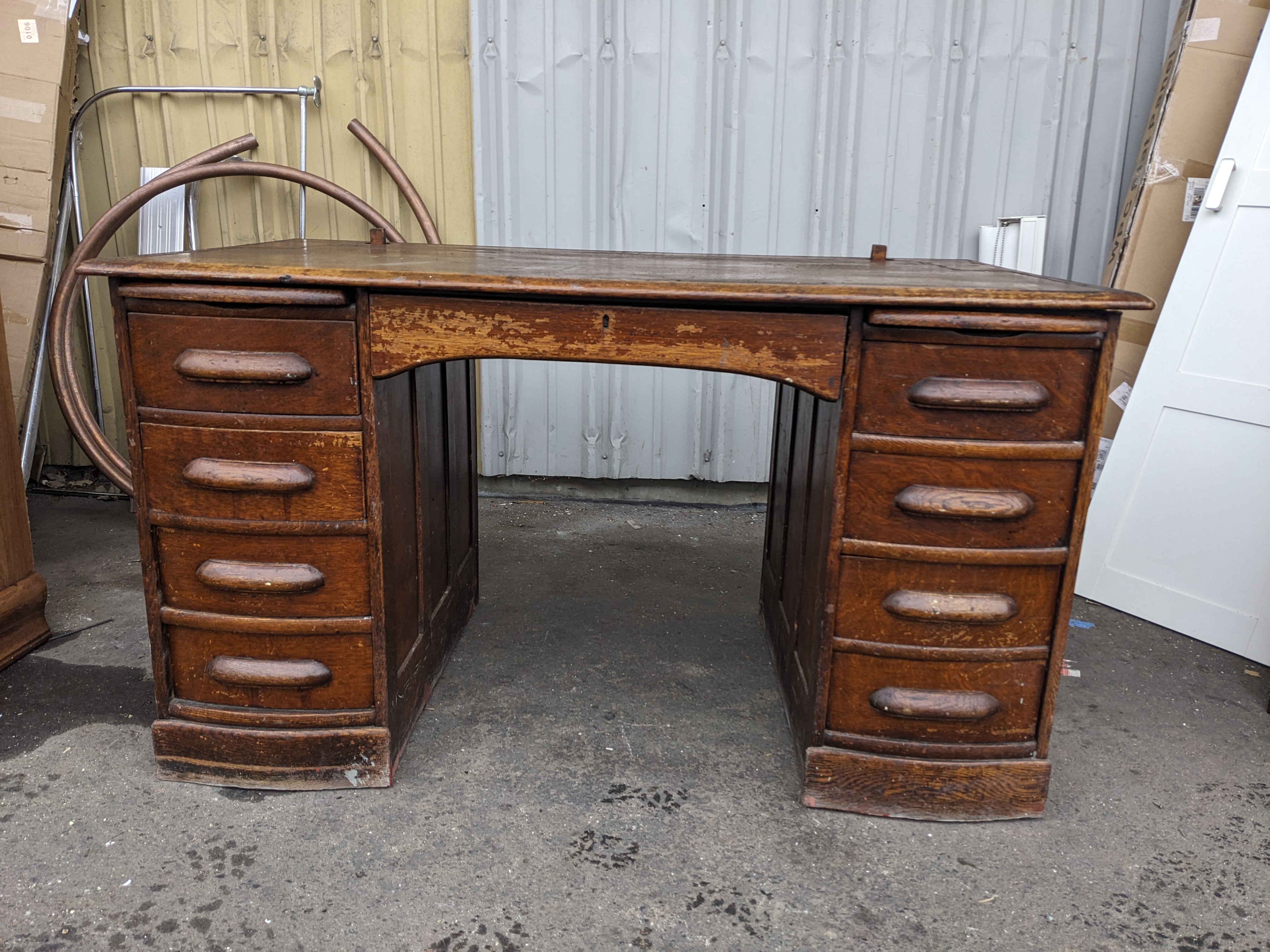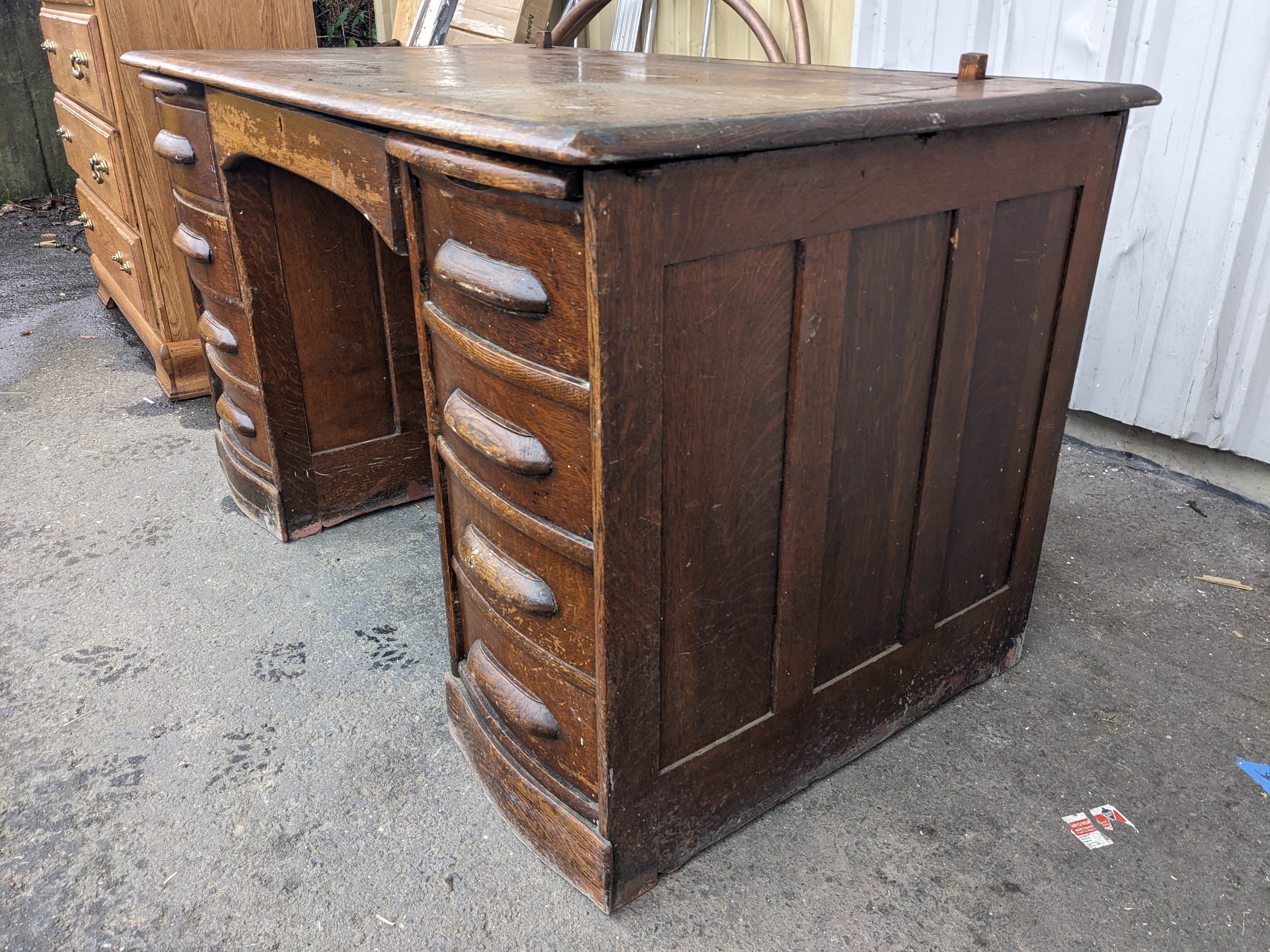 This antique oak desk shows wear from time in all the right places! This desk will need a bit of TLC to bring it back to it's former glory but this desk has great bones! The table top will need to be reattached. Priced as is. The desk features a locking mechanism (which releases at the top) for the drawers on each end of the desk. It includes a total of eight drawers and two pull out boards for extra space or an additional writing surface. It includes four casters that can be reinstalled easily if needed. Own a piece of history and take this item home today!