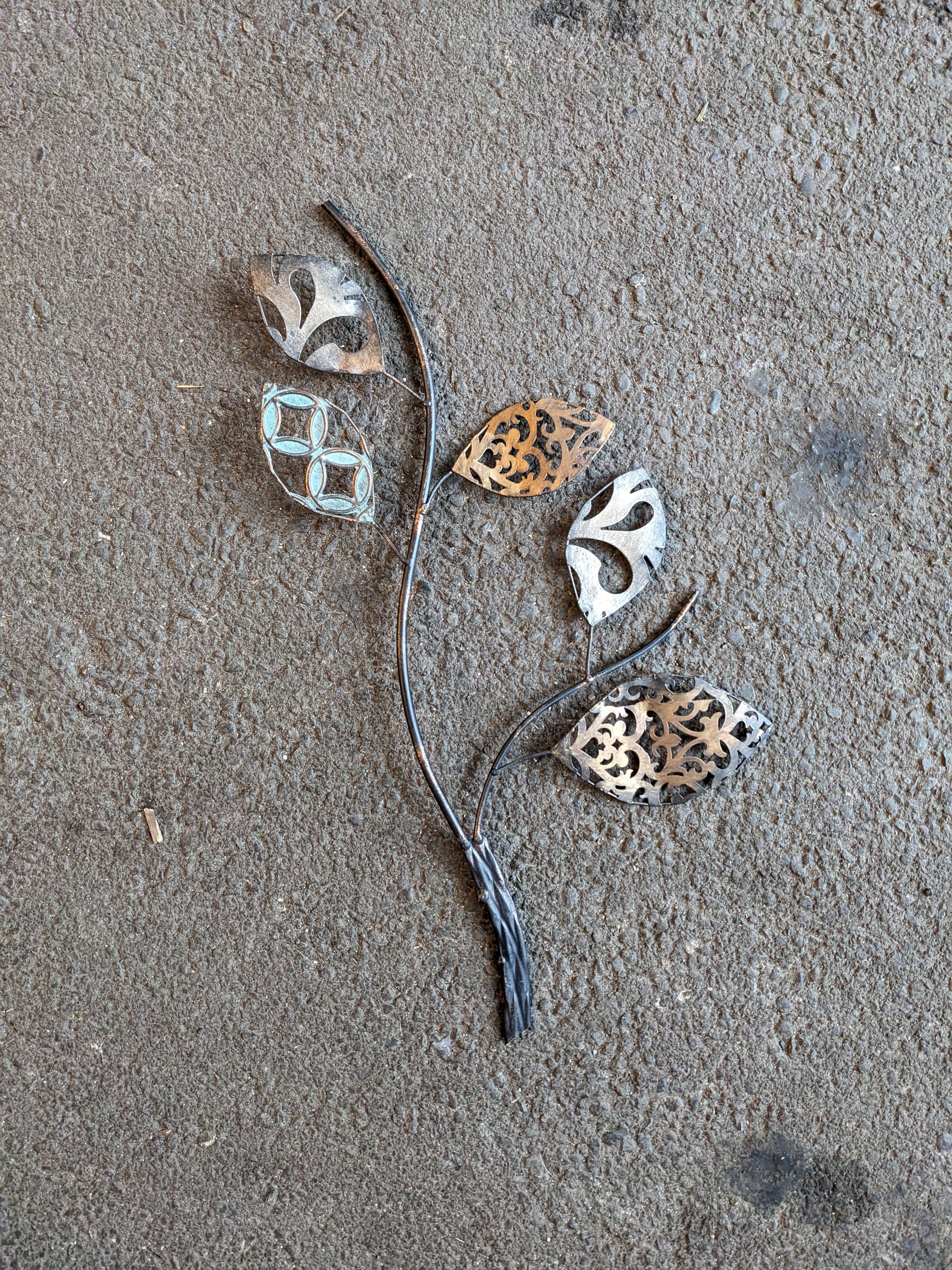 Choose your own adventure. Hang up this metal branch and leaf decor on your wall, or place it in your garden, or even just a pot for a plant needing a little extra vertical support. I had one once that I mounted to the wall and bent the wires to create a necklace holder. Super cute, super versatile. The possibilities are endless. At one point this piece was a part of a larger decoration, and seems to have been cut in a few places so there are a few sharp edges where it has been clipped. Approximately 20 x 10