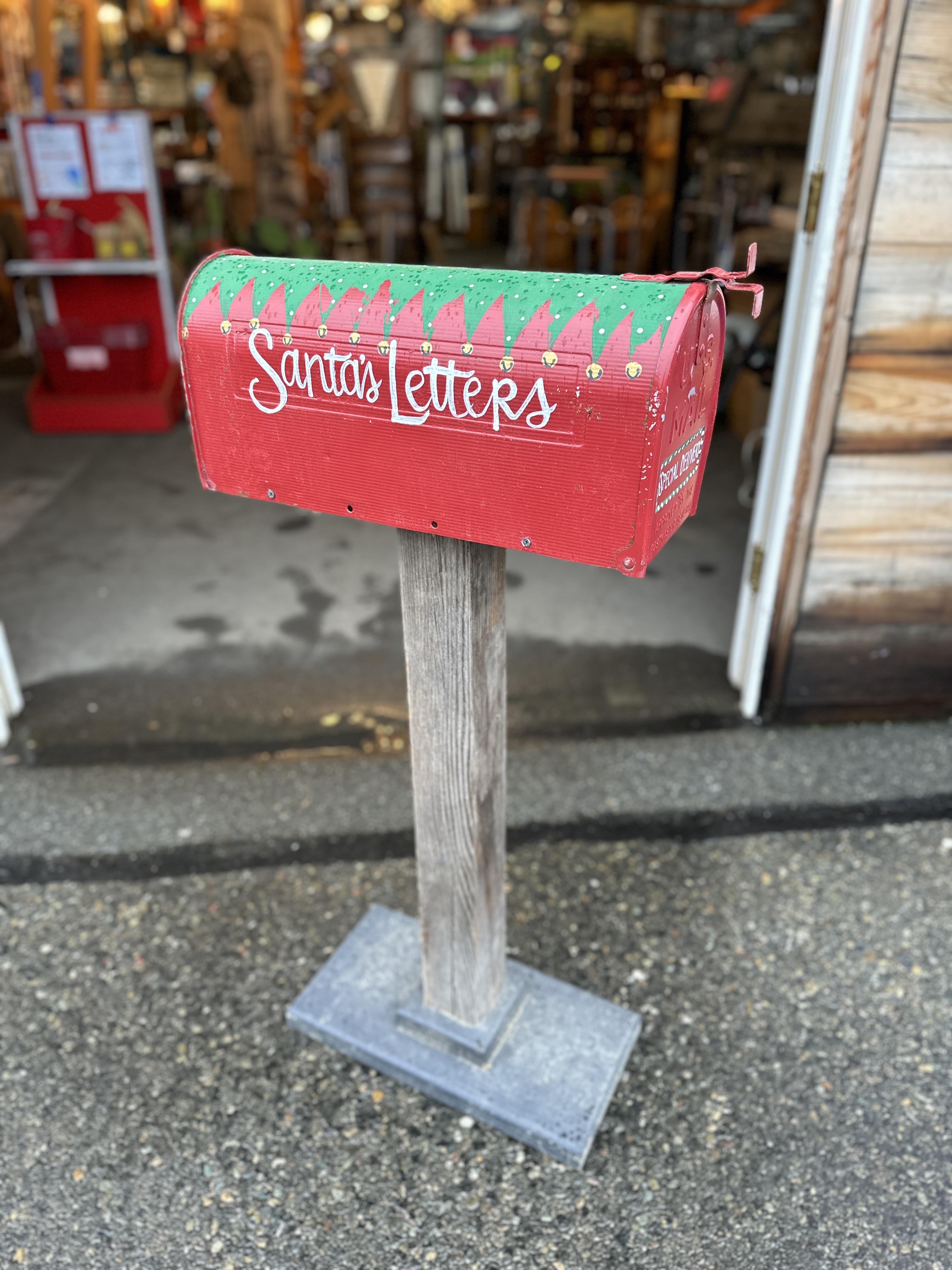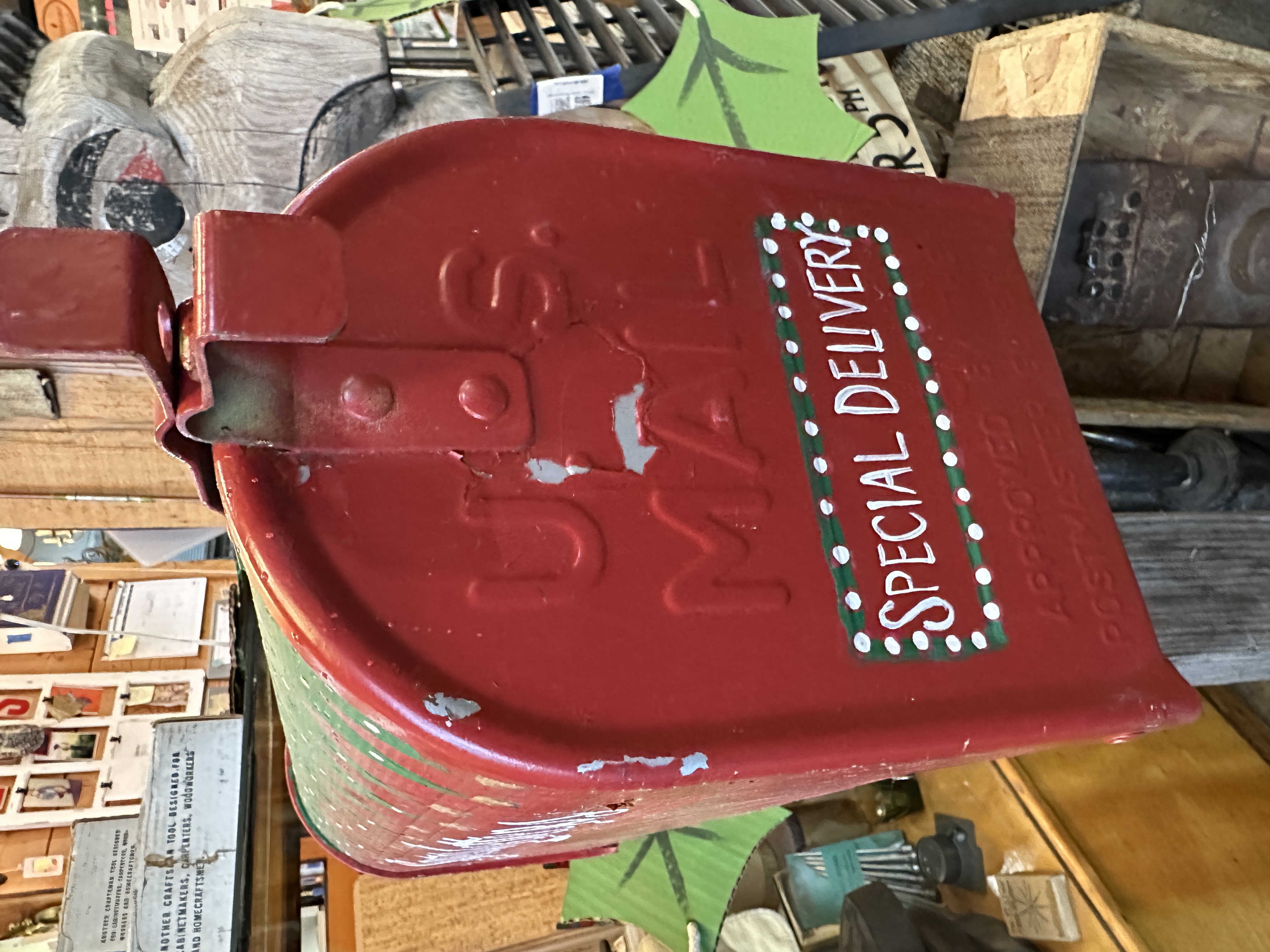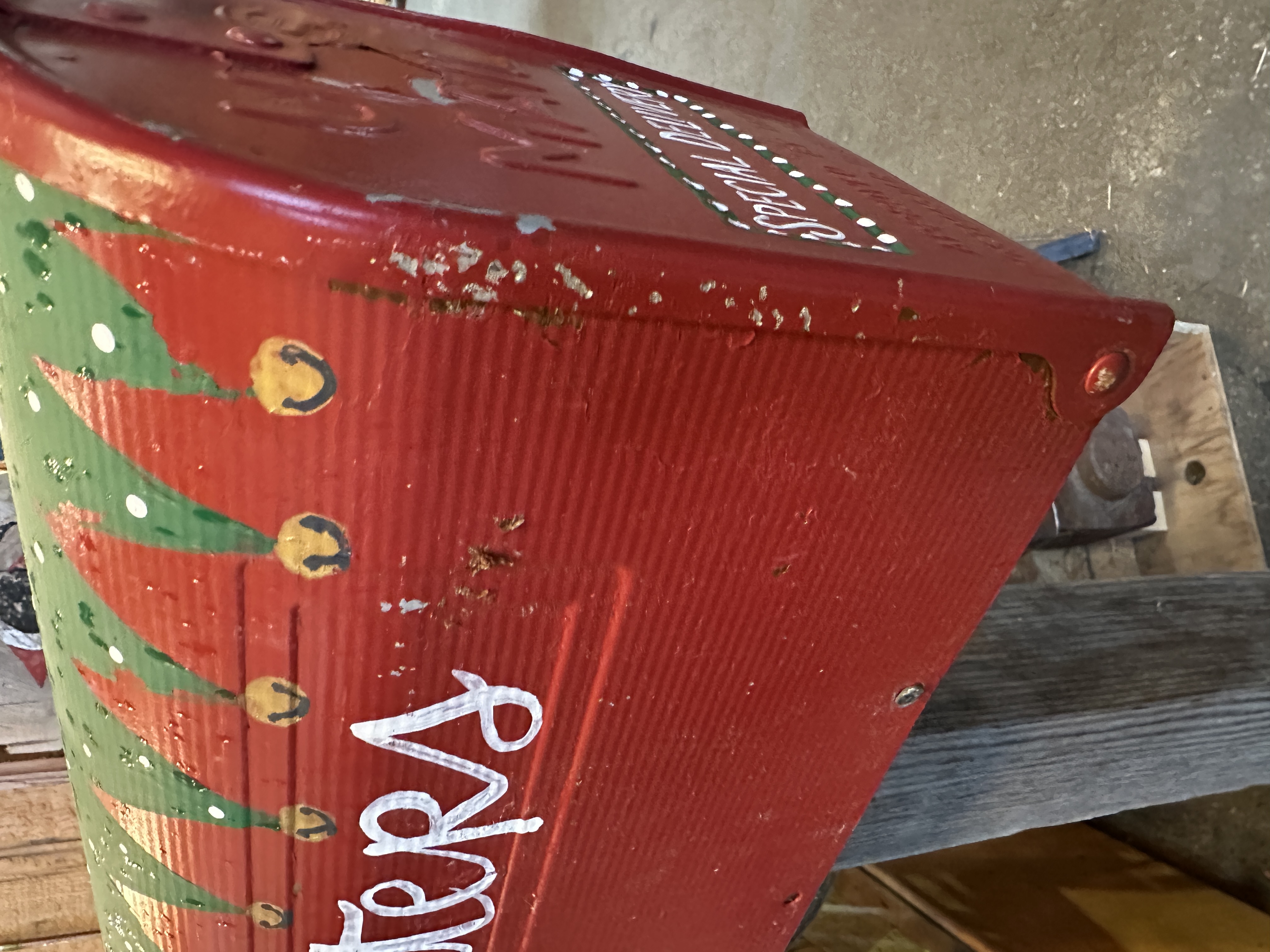 Freestanding hand painted Christmas themed mailbox. Base/stand is wood, and the mailbox is metal. It does have some chipping paint and a few dings, but who cares; it is still super-duper cute. Holiday decor to the max!