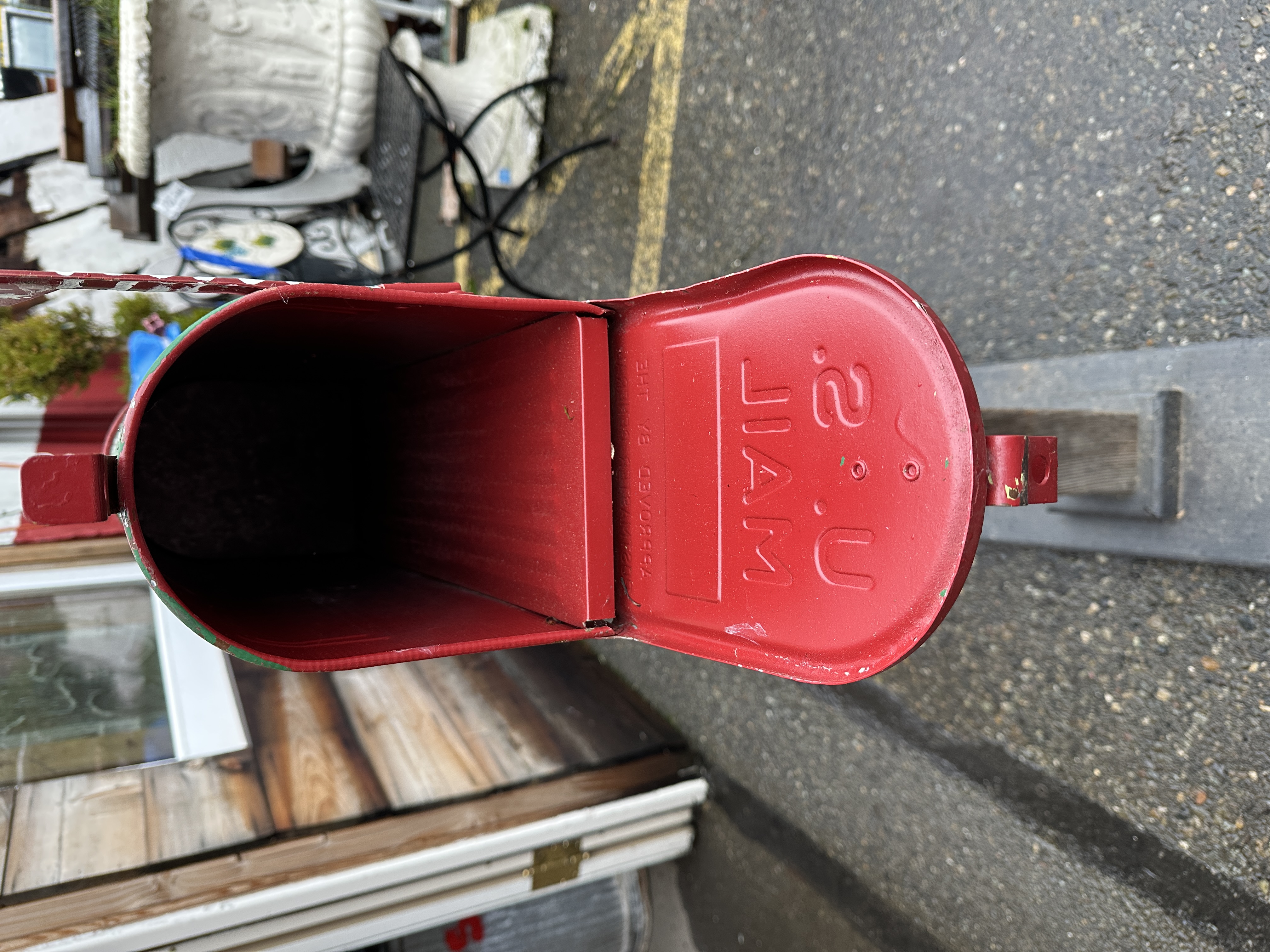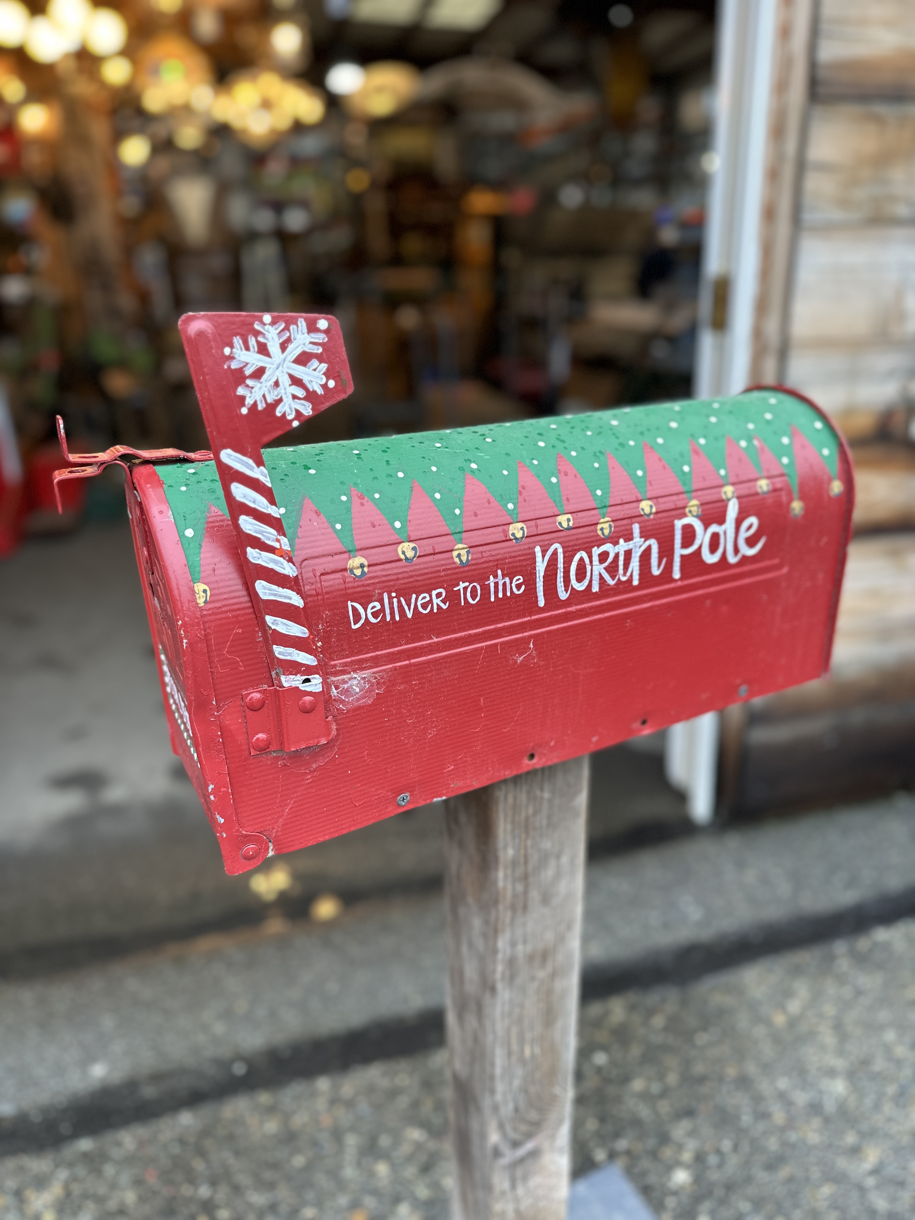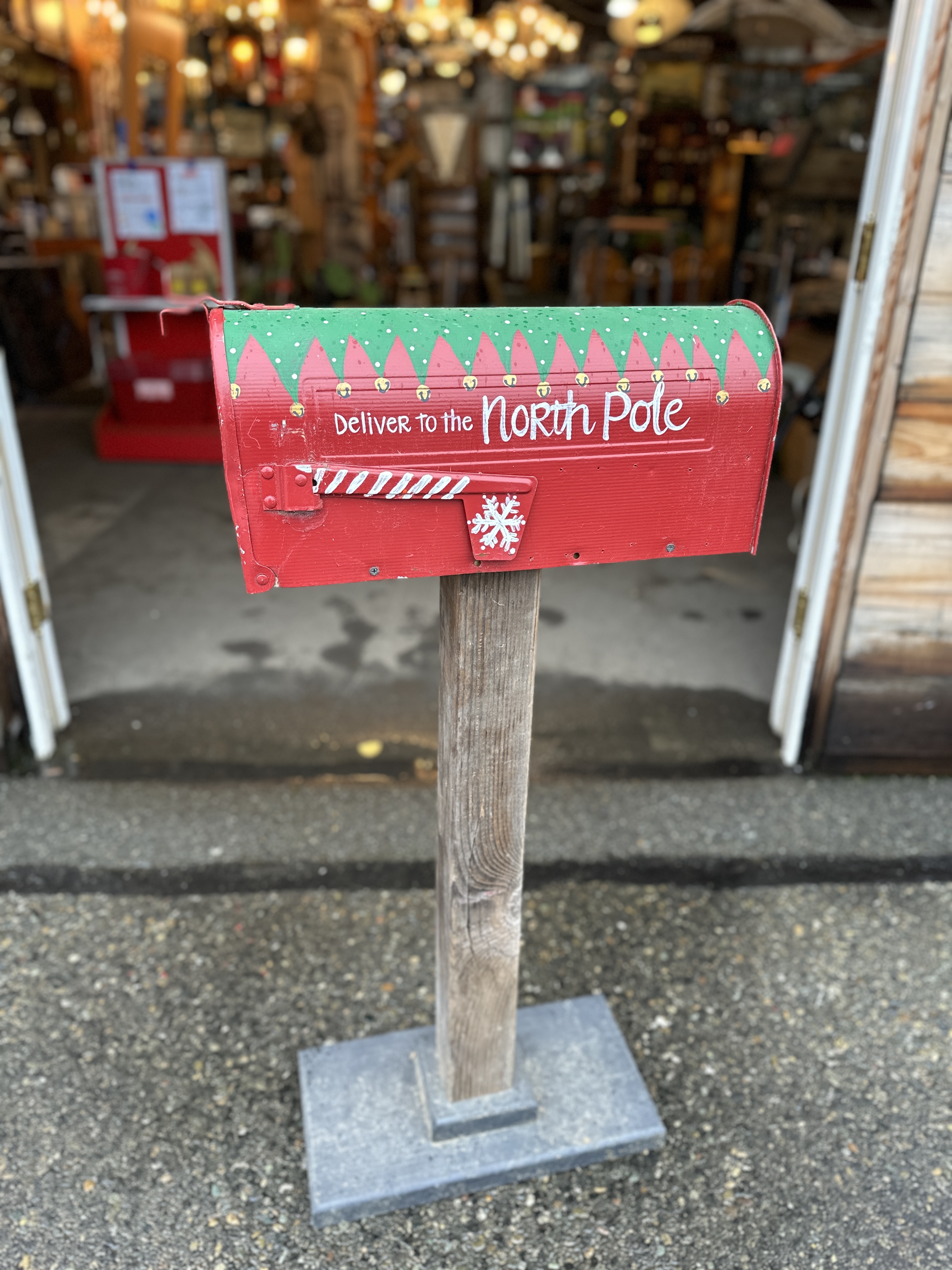 Freestanding hand painted Christmas themed mailbox. Base/stand is wood, and the mailbox is metal. It does have some chipping paint and a few dings, but who cares; it is still super-duper cute. Holiday decor to the max!