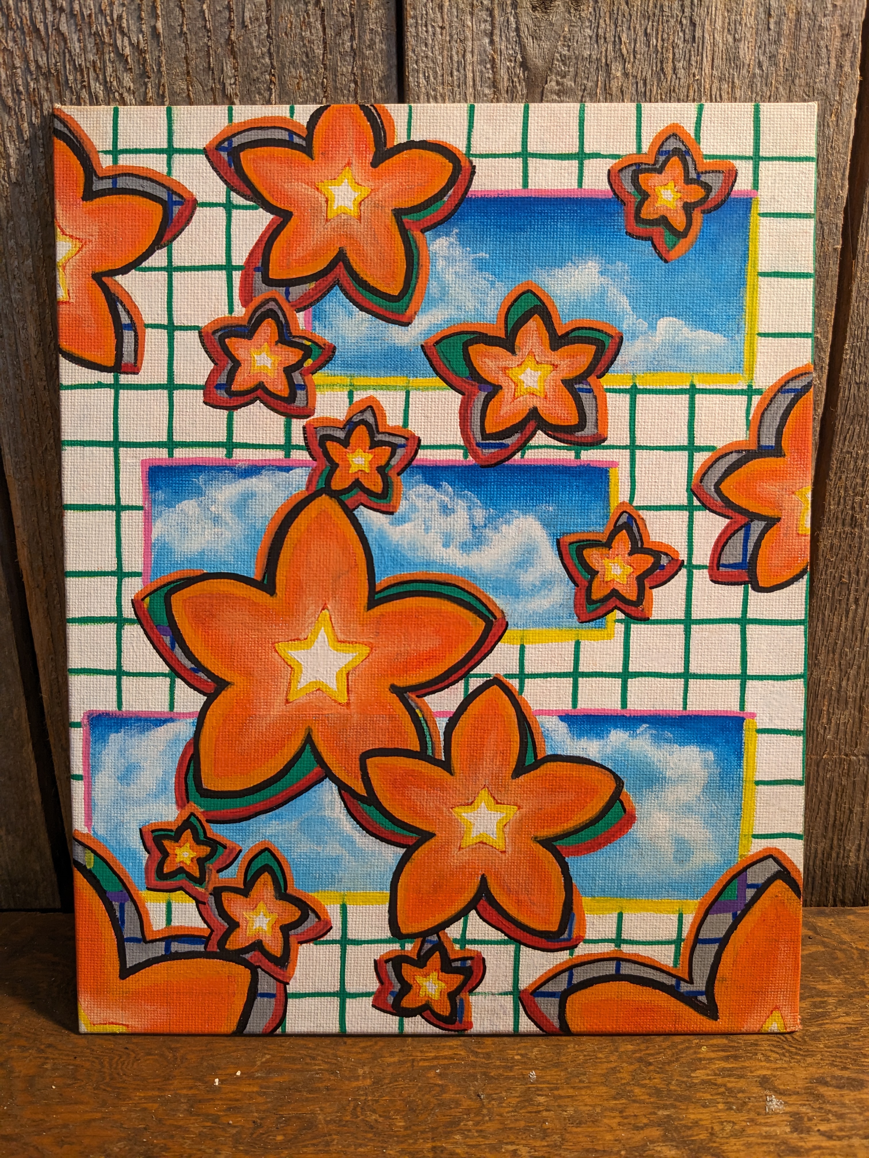 A painting featuring a grid pattern and some wacky flowers. This little piece has city pop style, and just needs a frame. It measures 8 x 10 inches.