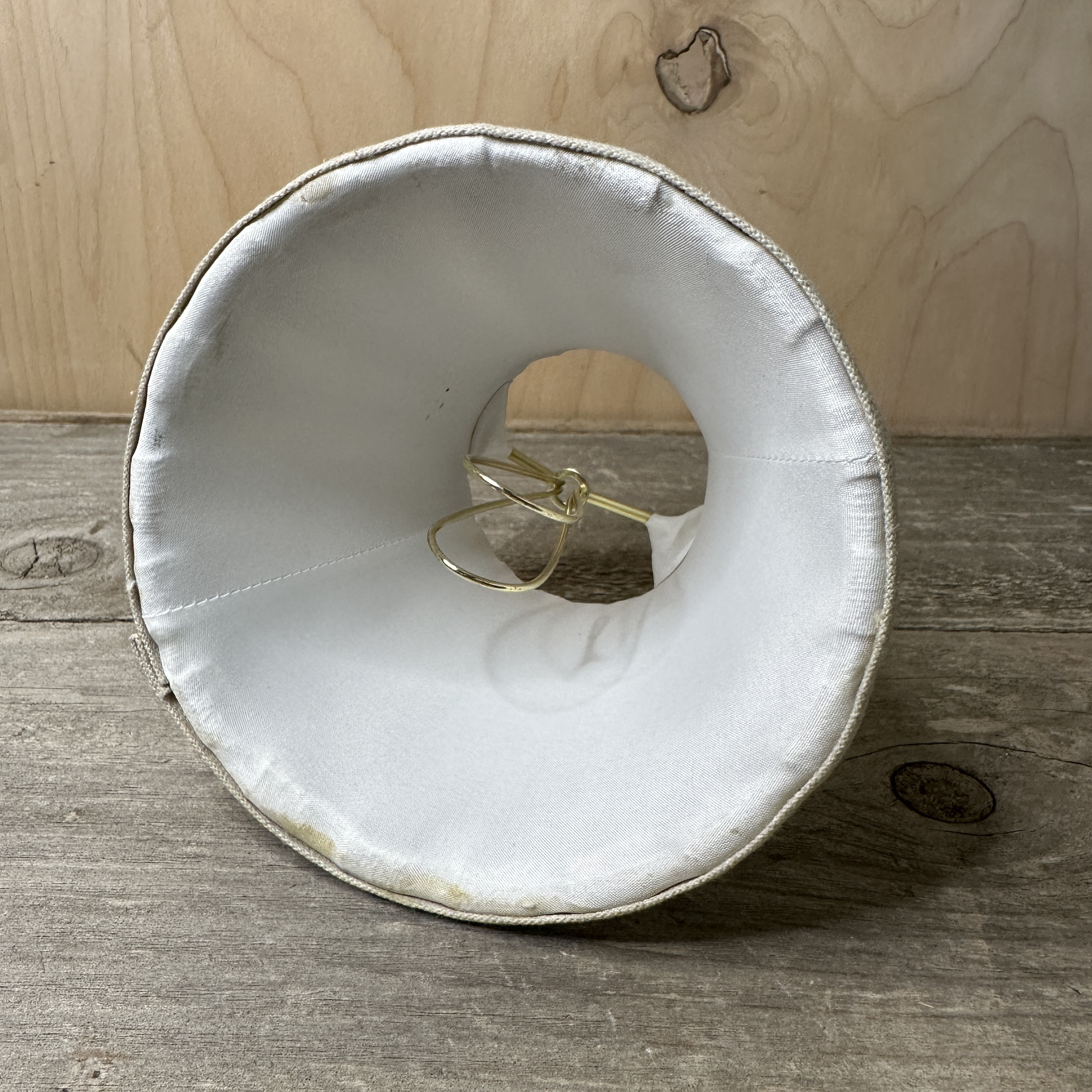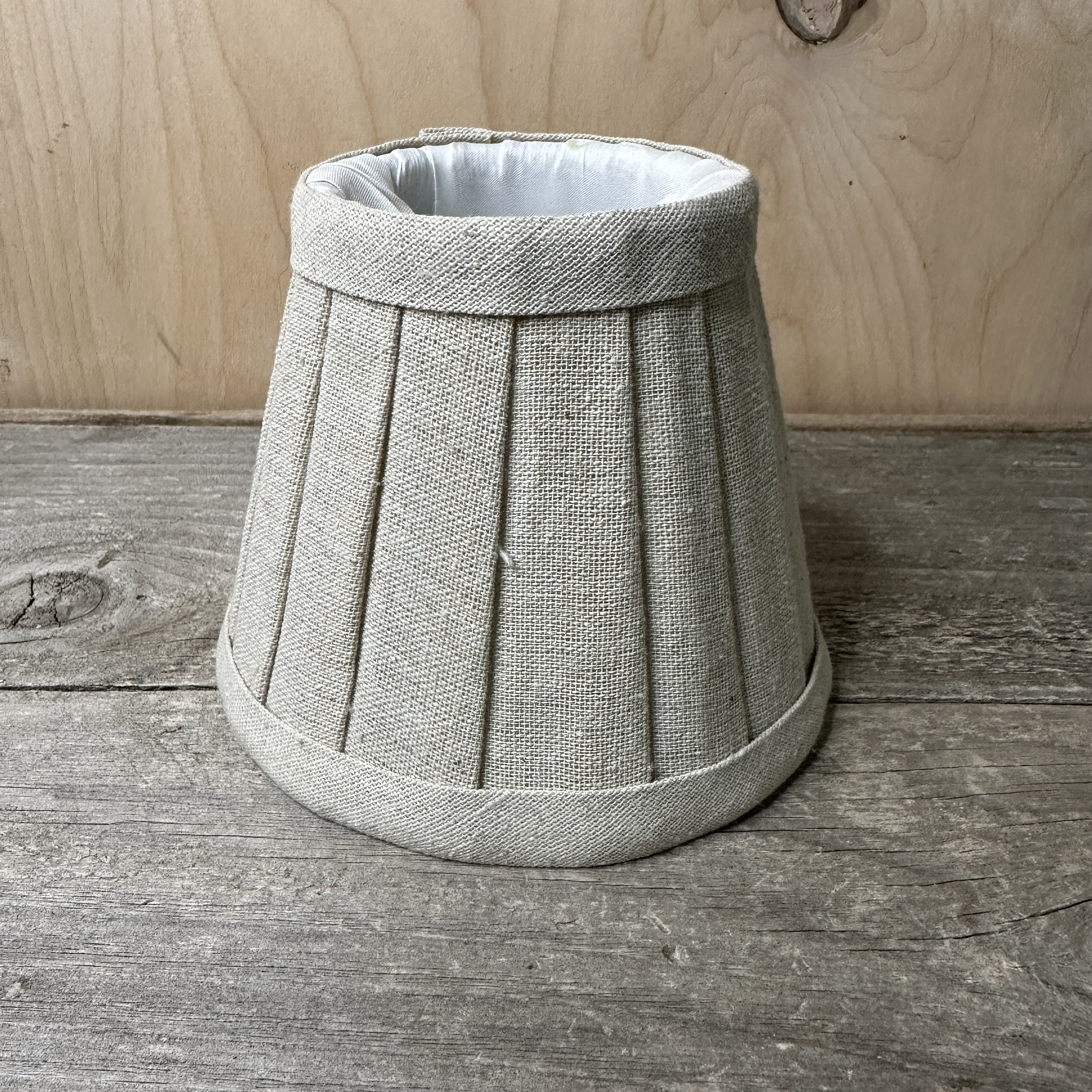 Pleated natural color linen and lined in silk (or silk-like fabric) candelabra sized clip-on shade.