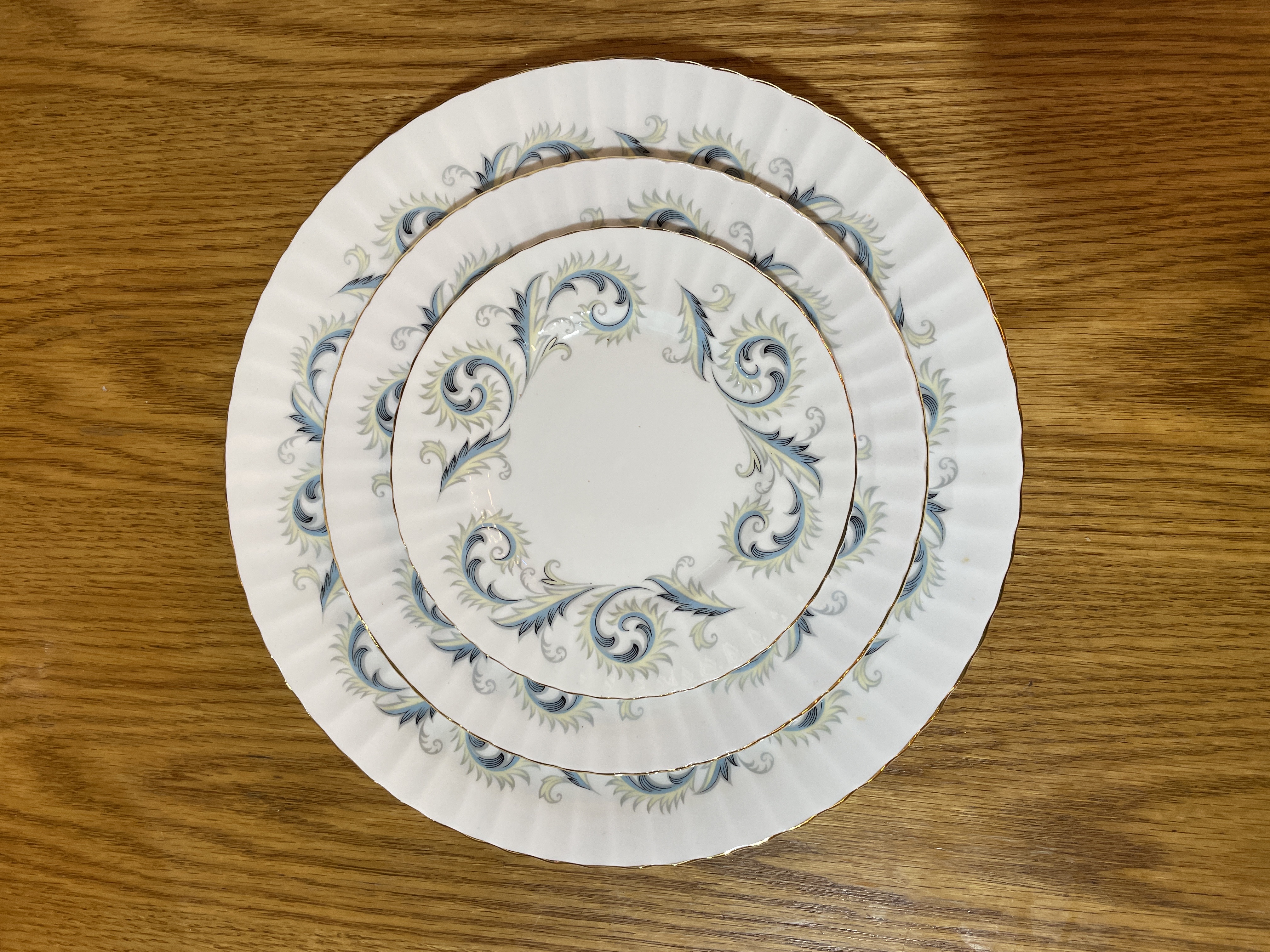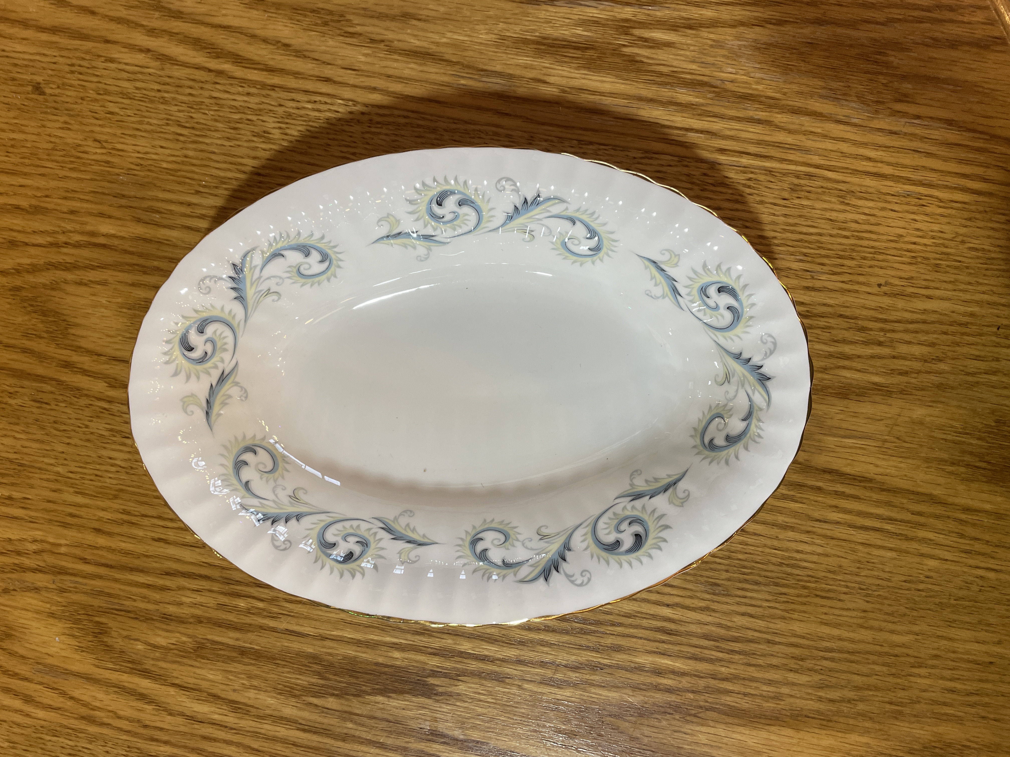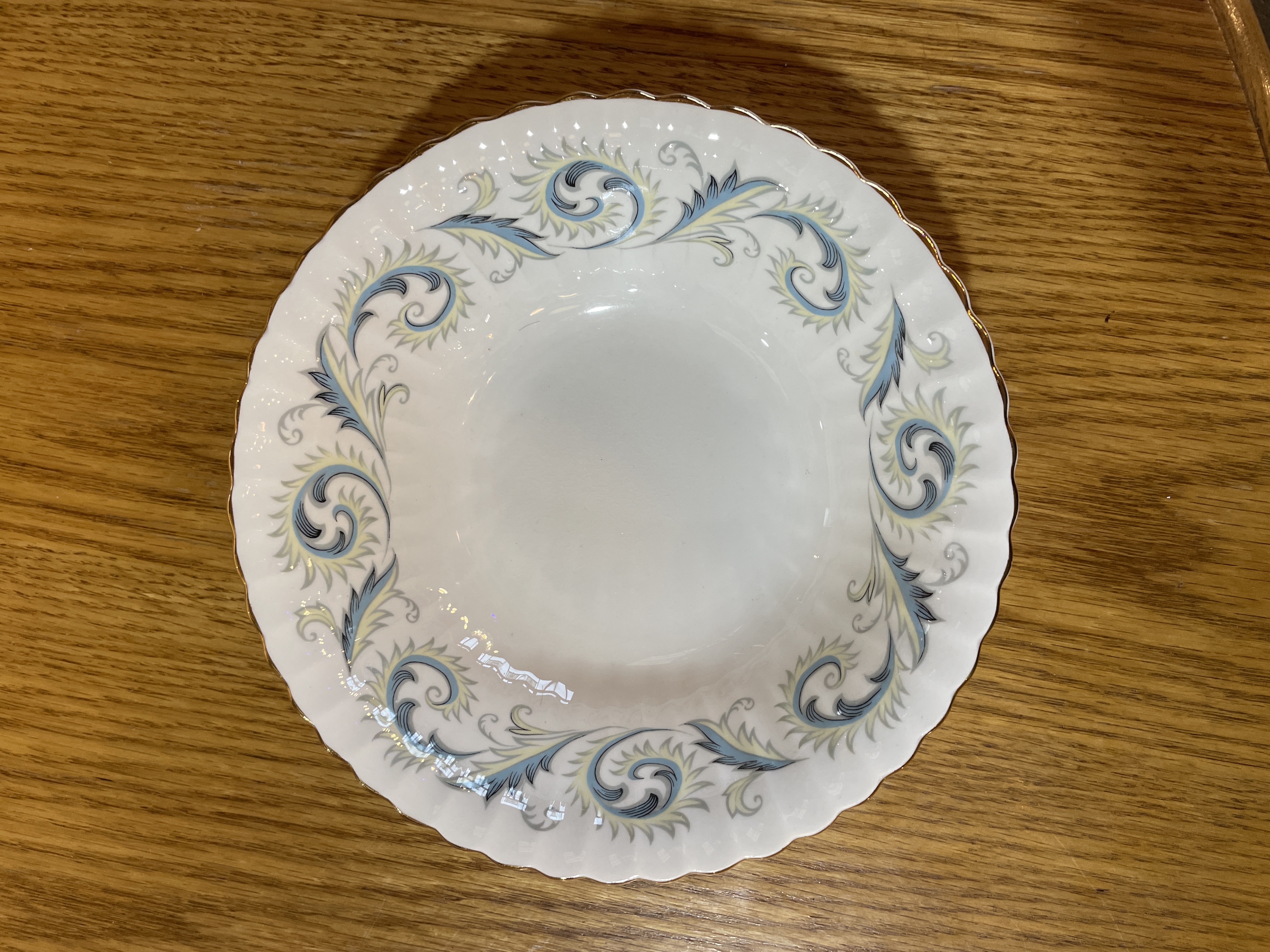Made in England. Features a border of blue scrolls with yellow leaves and gold edged trim.
