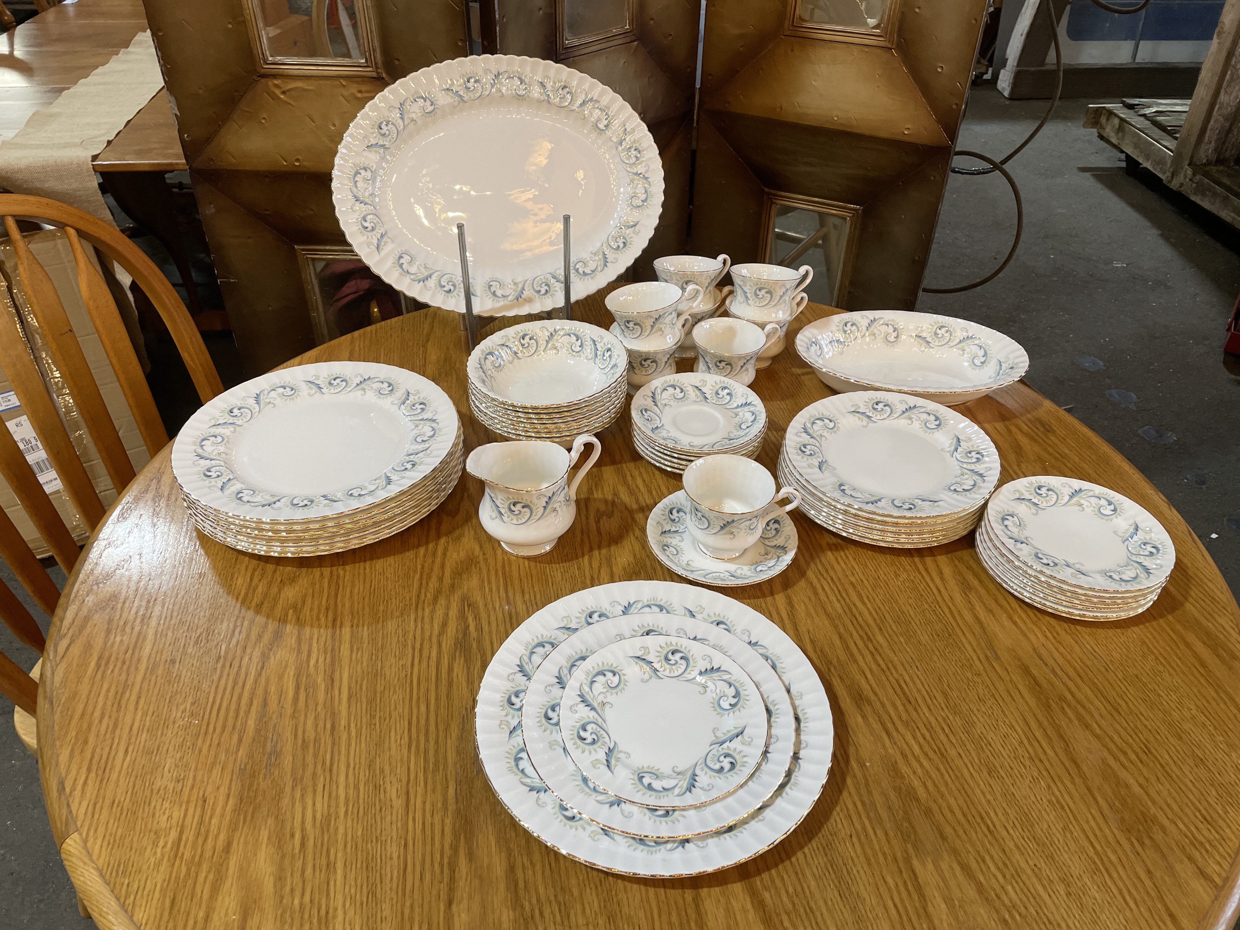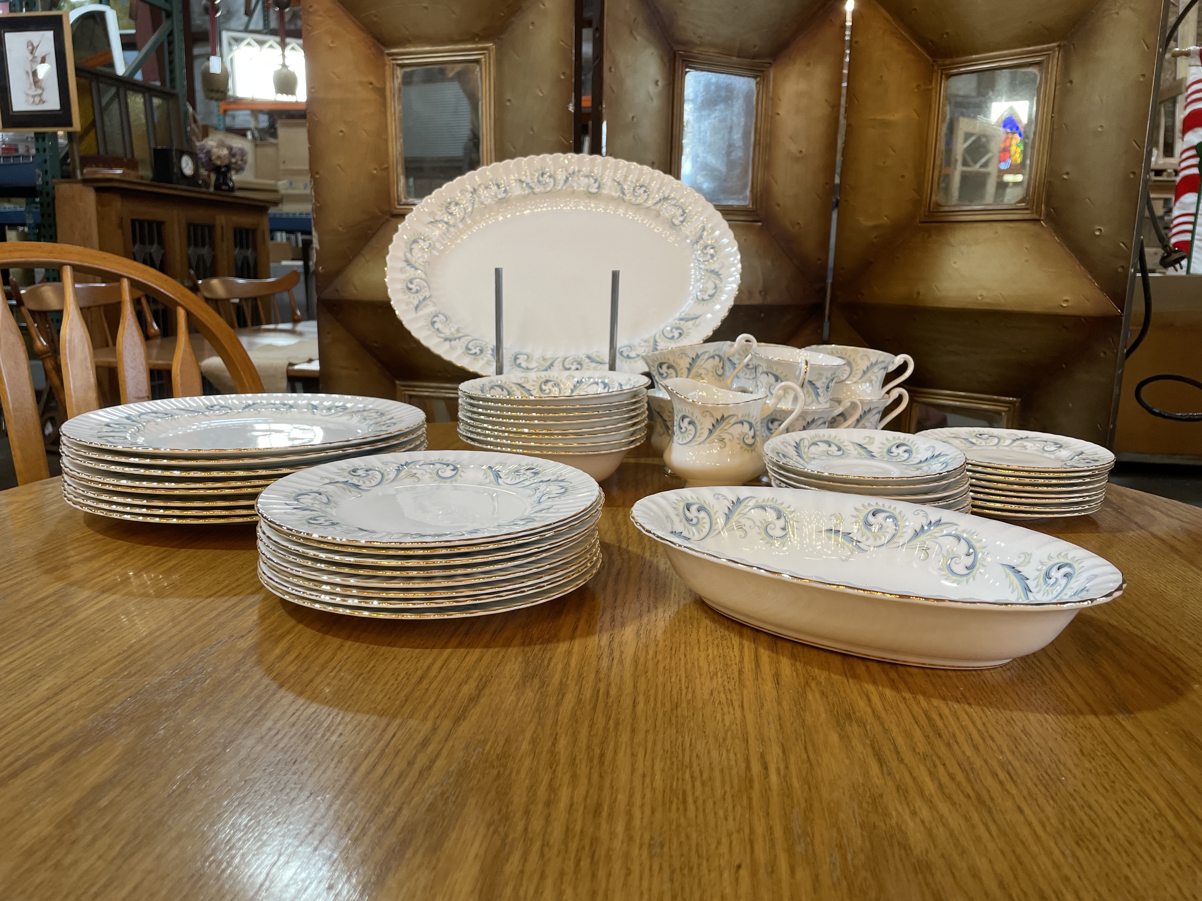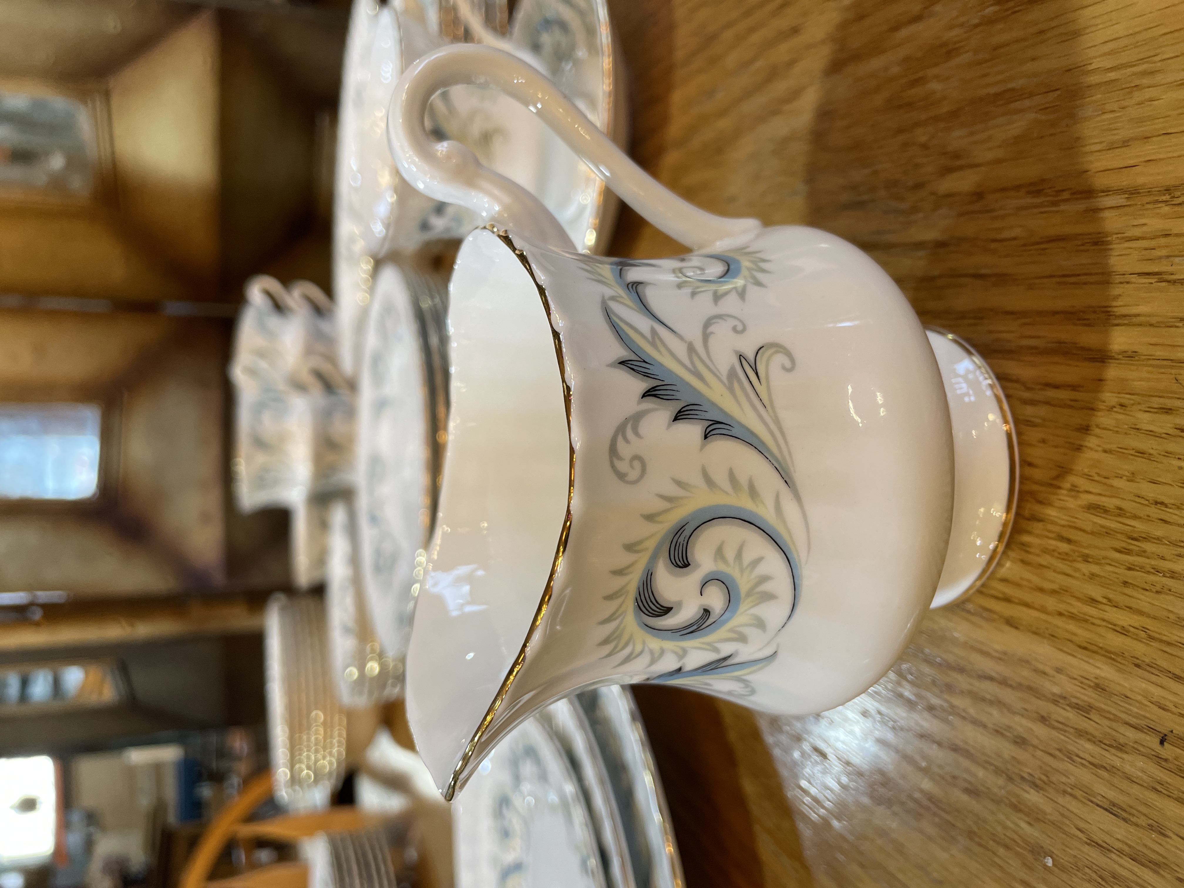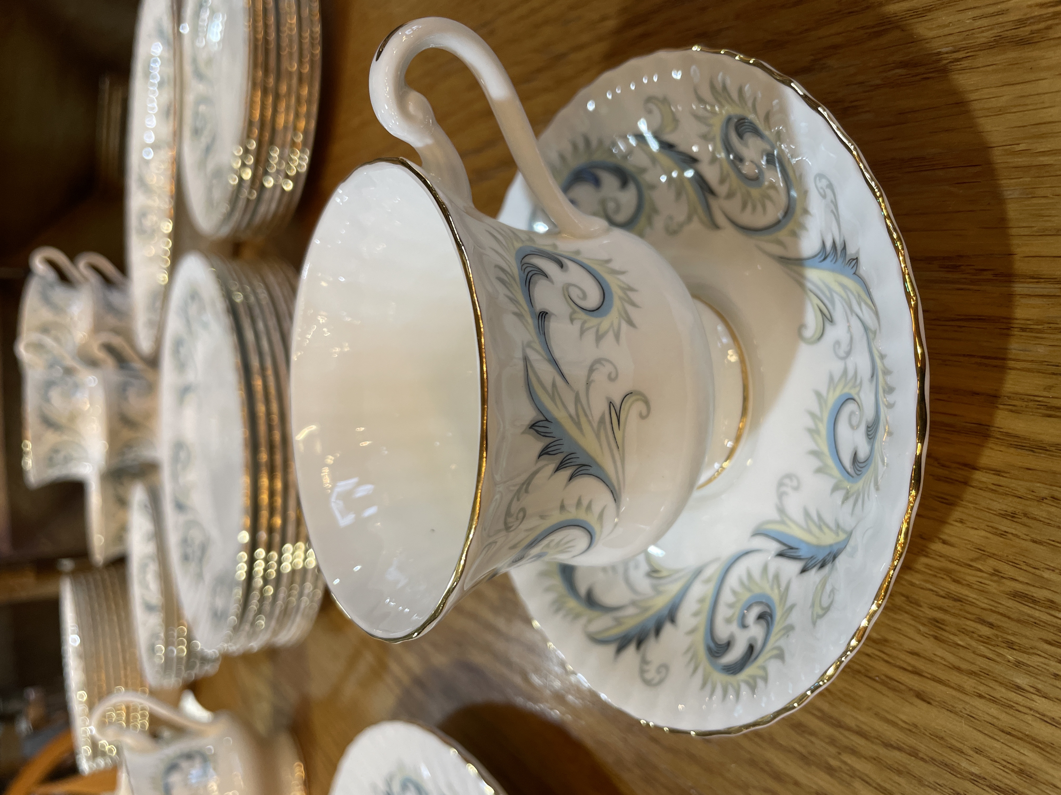 Made in England. Features a border of blue scrolls with yellow leaves and gold edged trim.