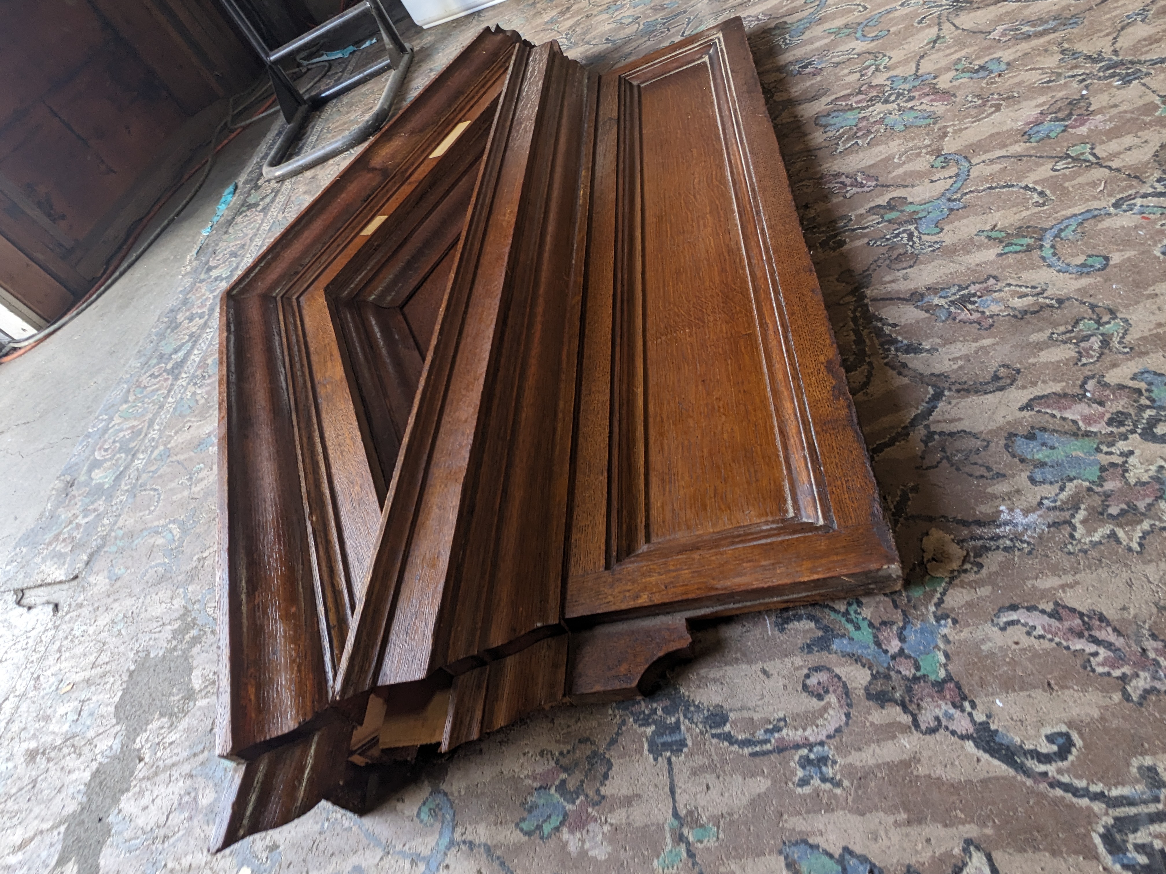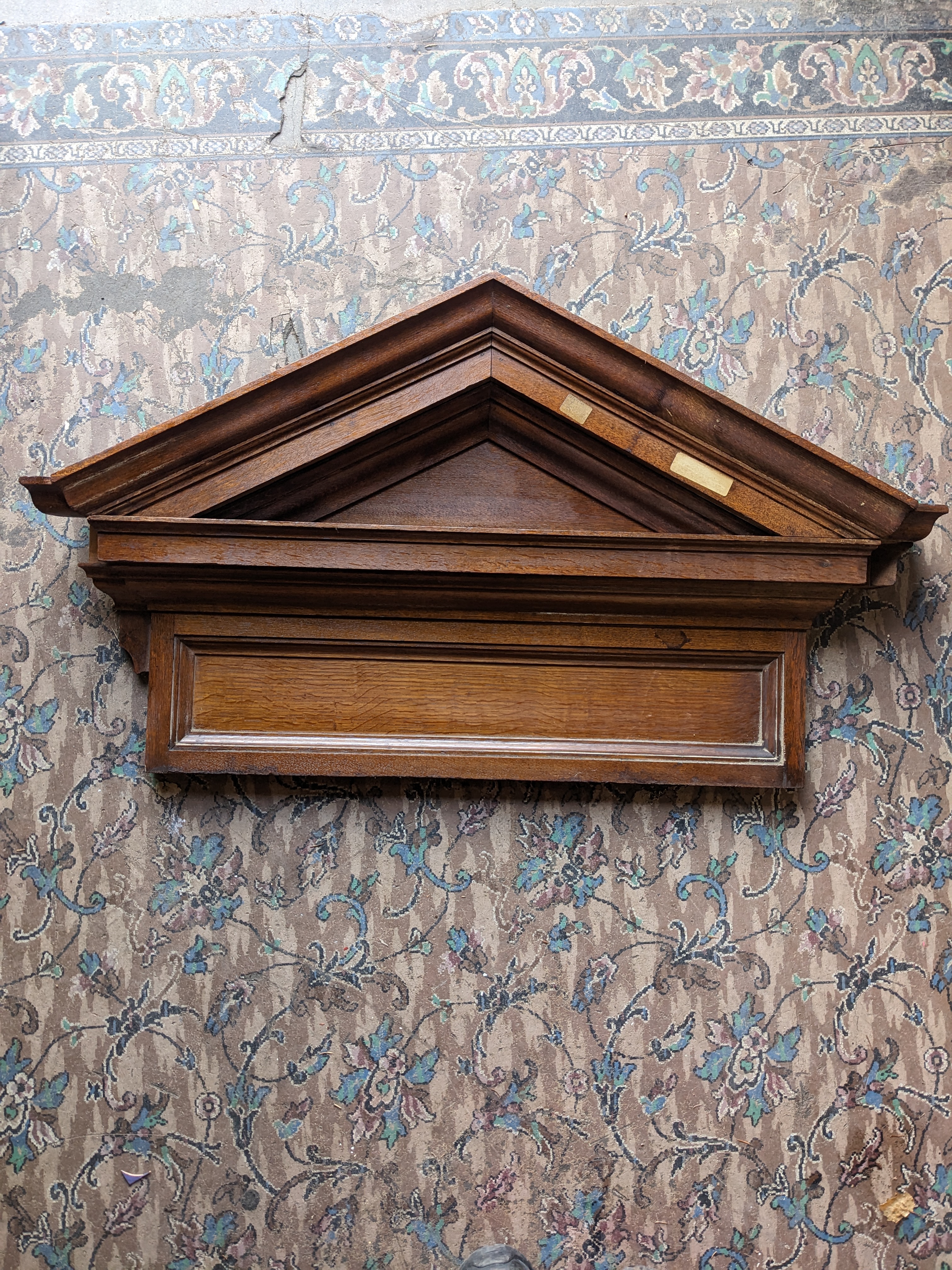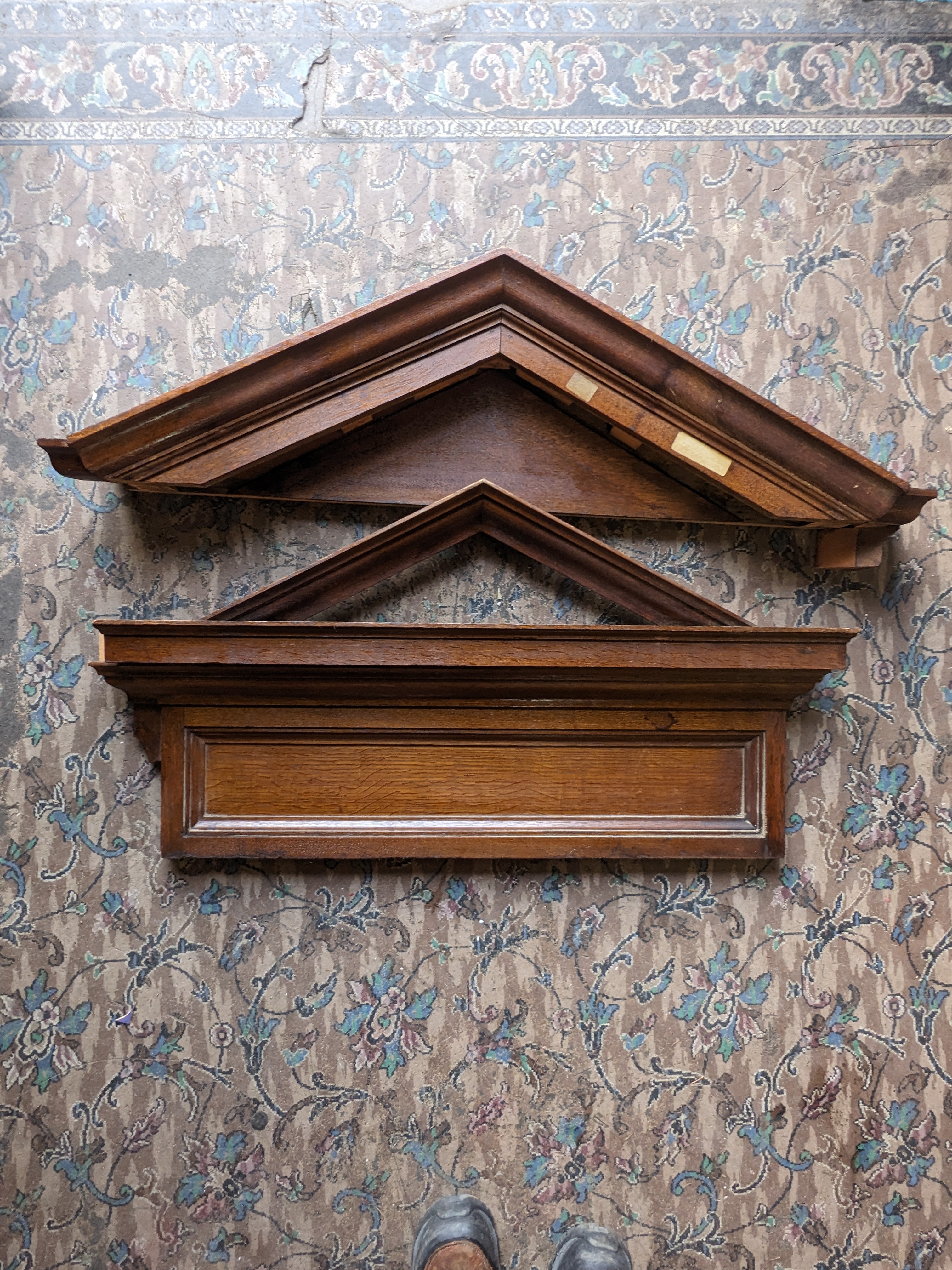This antique pointed Pediment likely dates to the late 1800s and would have adorned the top of a doorway. The style and material would be fitting of a turn of the century government office or other building of importance. This piece has some signs of wear reflective of its age. Please note that this item comes in two separate pieces that are not attached. The This includes a few nail holes on the top portion of the piece (pictured). Accommodates installation above a 30"-32" door.