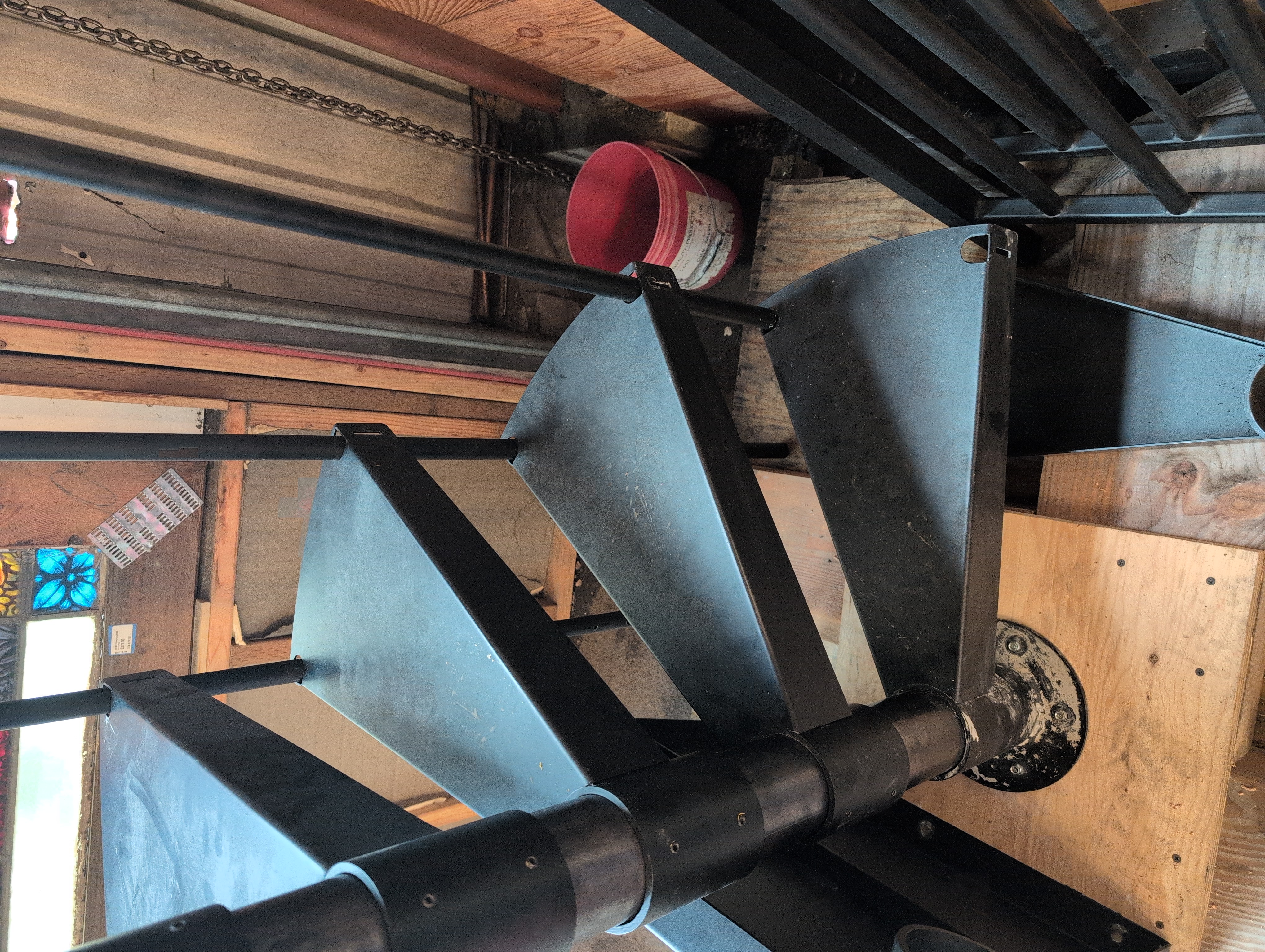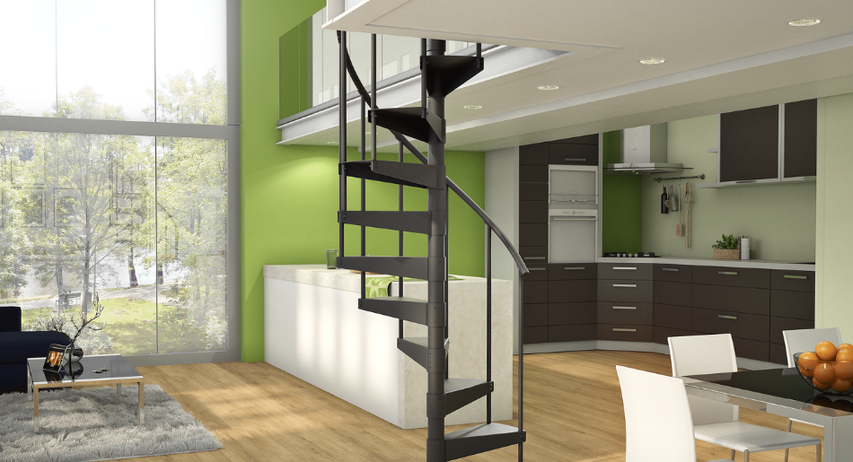 Incomplete salvaged "The Entryway" spiral staircase DIY kit from Paragon Stairs. Kit comes with four 47 inch center poles, 12 19 inch long steps, 12 handrail support poles, a curved vinyl handrail, a 22 inch square top step, two top support railings, and an incomplete hardware collection. You will need a quick trip to the hardware store (see below) but otherwise this kit is ready to be installed! Made of smooth finish black steel, this retails for over $1400. We've got it partially constructed here in the Kenmore store; come on in and take a look yourself as this is a non-refundable item. First two images are taken from source website, more info: https://www.paragonstairs.com/entryway-diy-kit/
