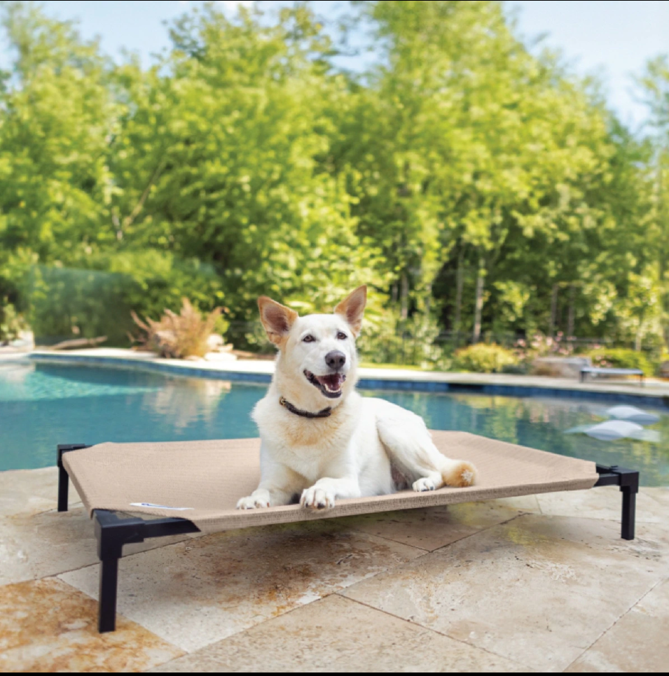 Steel framed elevated dog bed with nutmeg colored high density polyethylene cover from Coolaroo. Lightweight and durable, good for indoor and outdoor use. Has a few small wear and tear marks. Dog not included unfortunately.