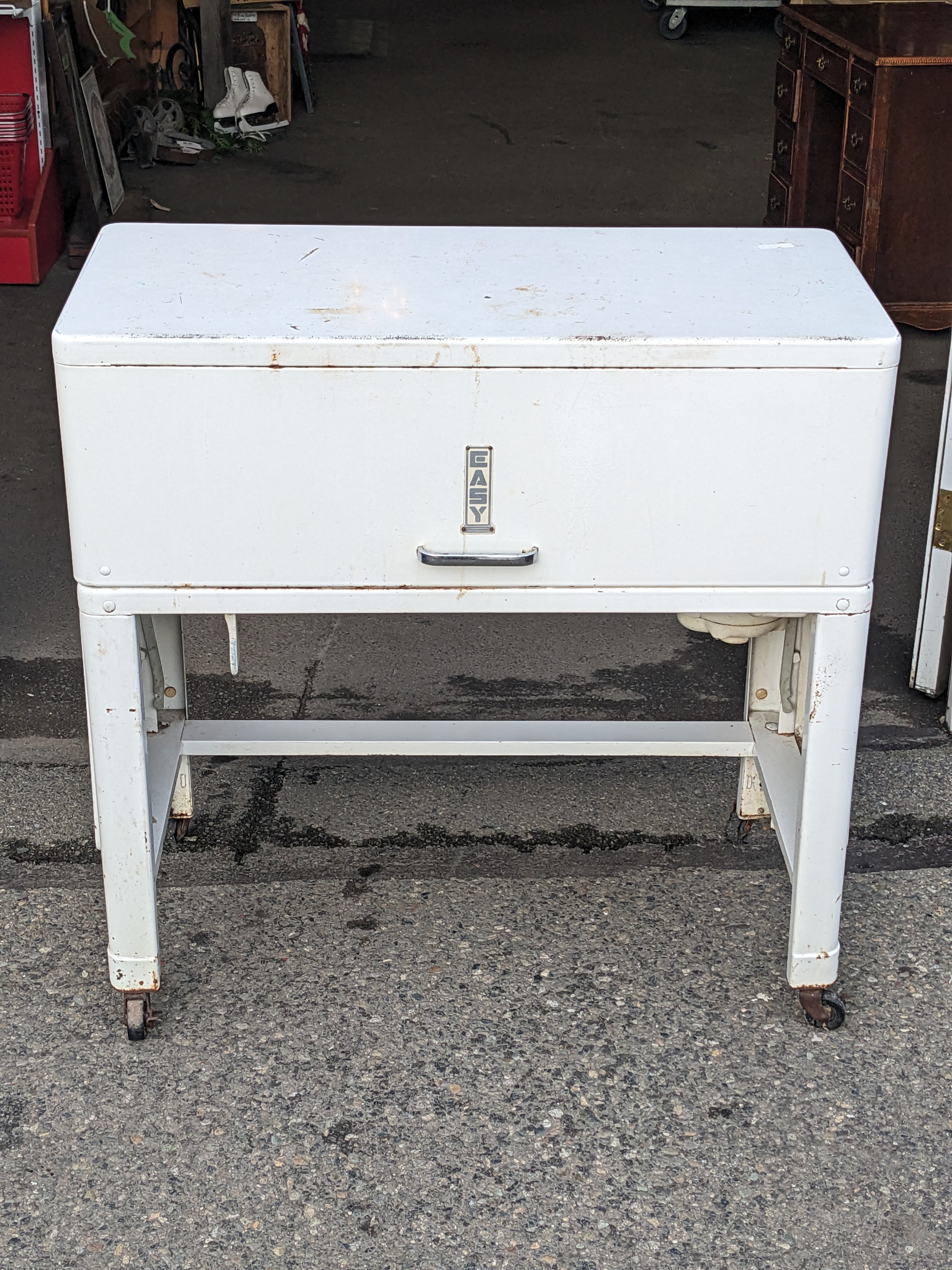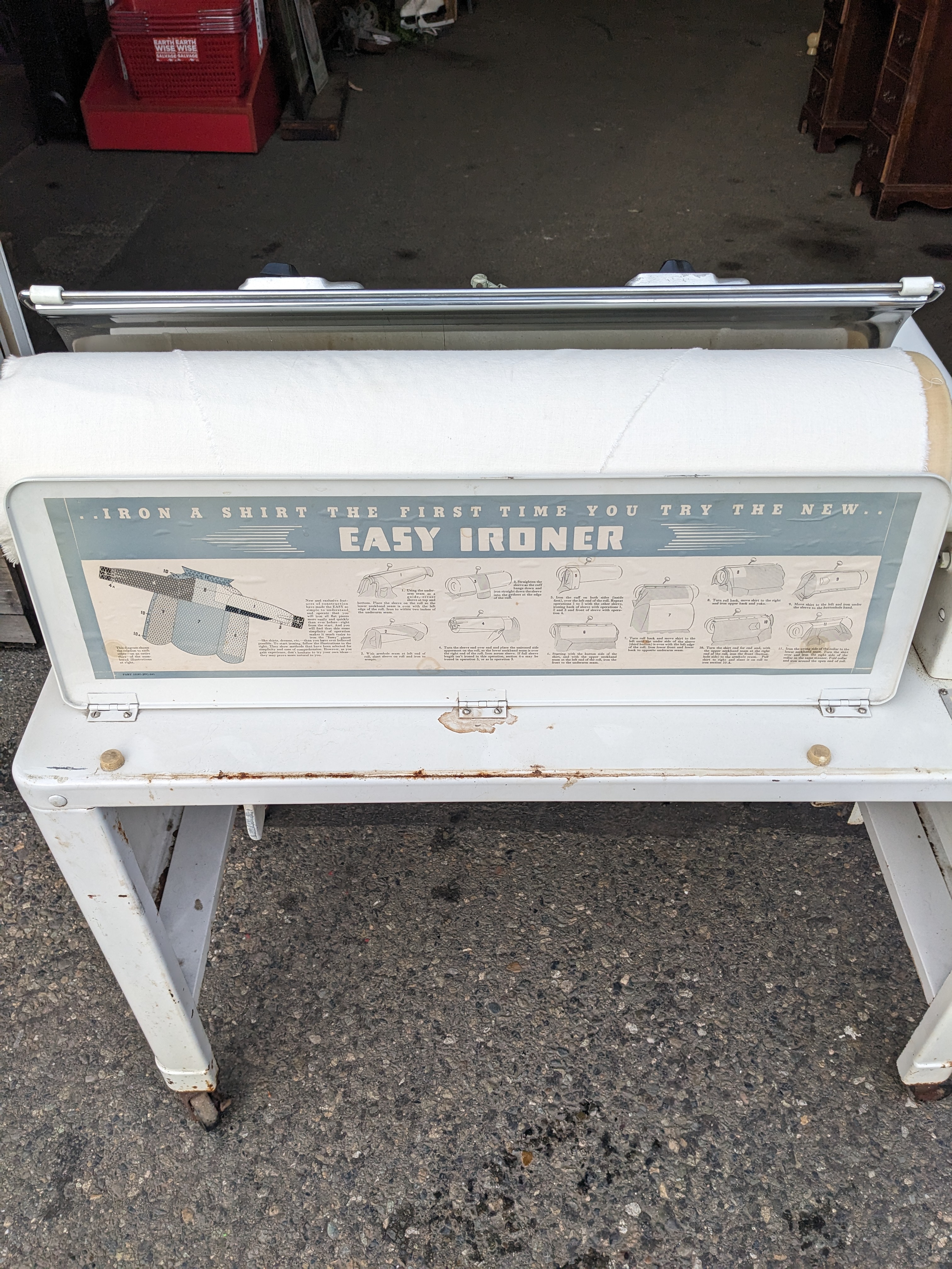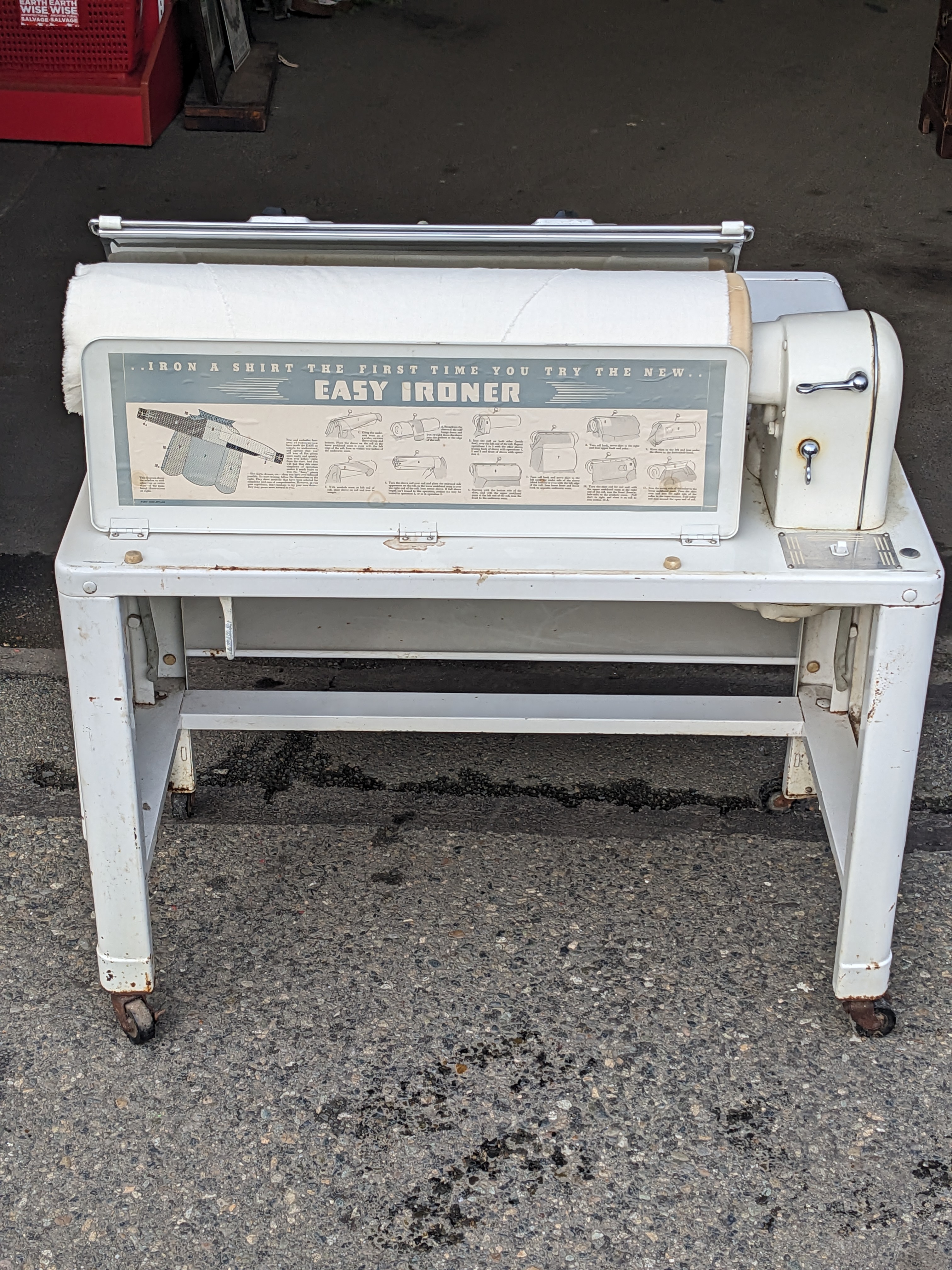 This thing is originally from the 40's. It was all the rage until luxury taxes drove up prices and innovation in new textile fabrics and the tumbler dryer became more popular. This thing still works to an extent. It spins, warms up and did get some wrinkles out of a rag. It did spark a little bit when it was plugged in, and probably isn't extremely practical.