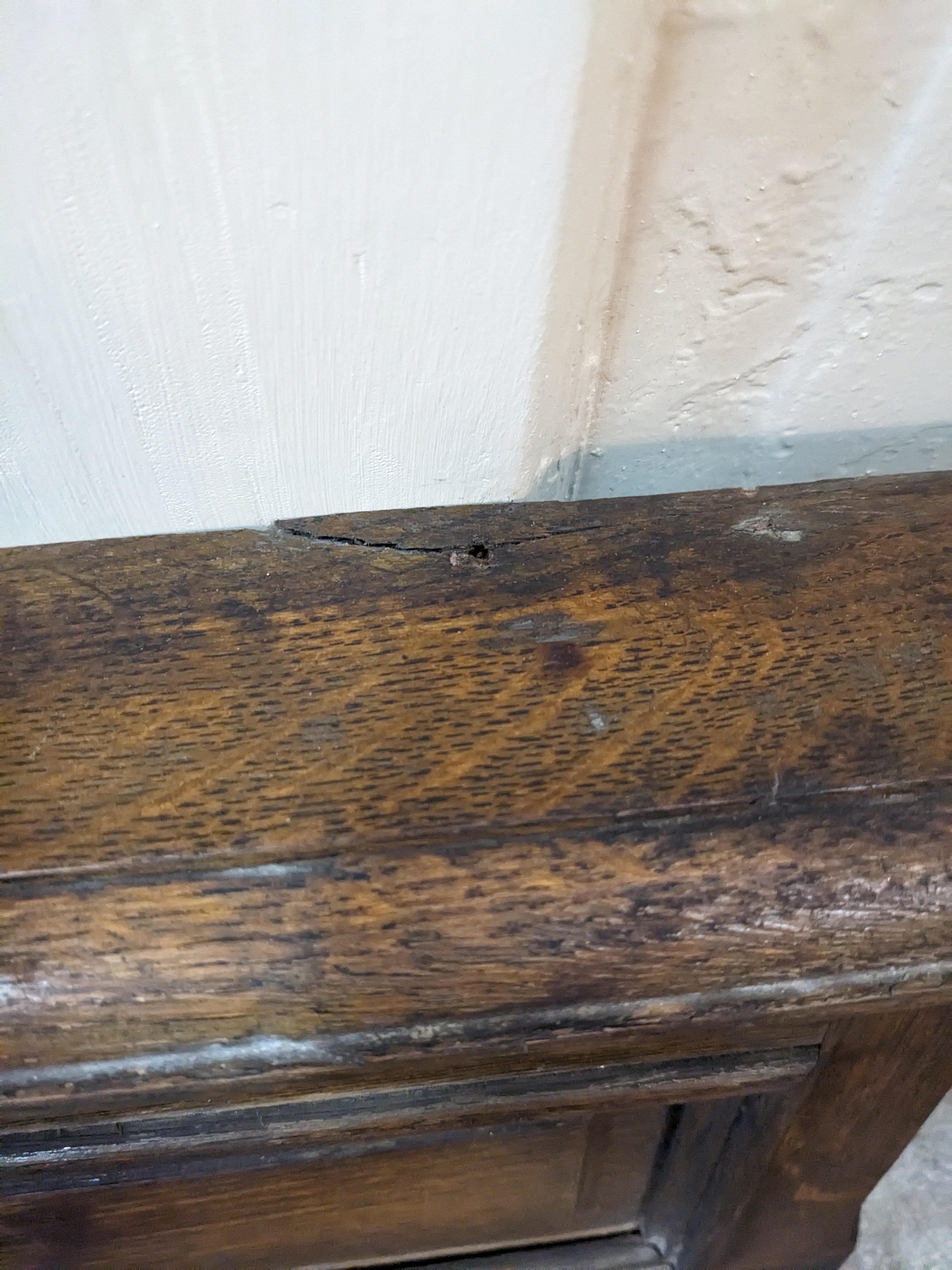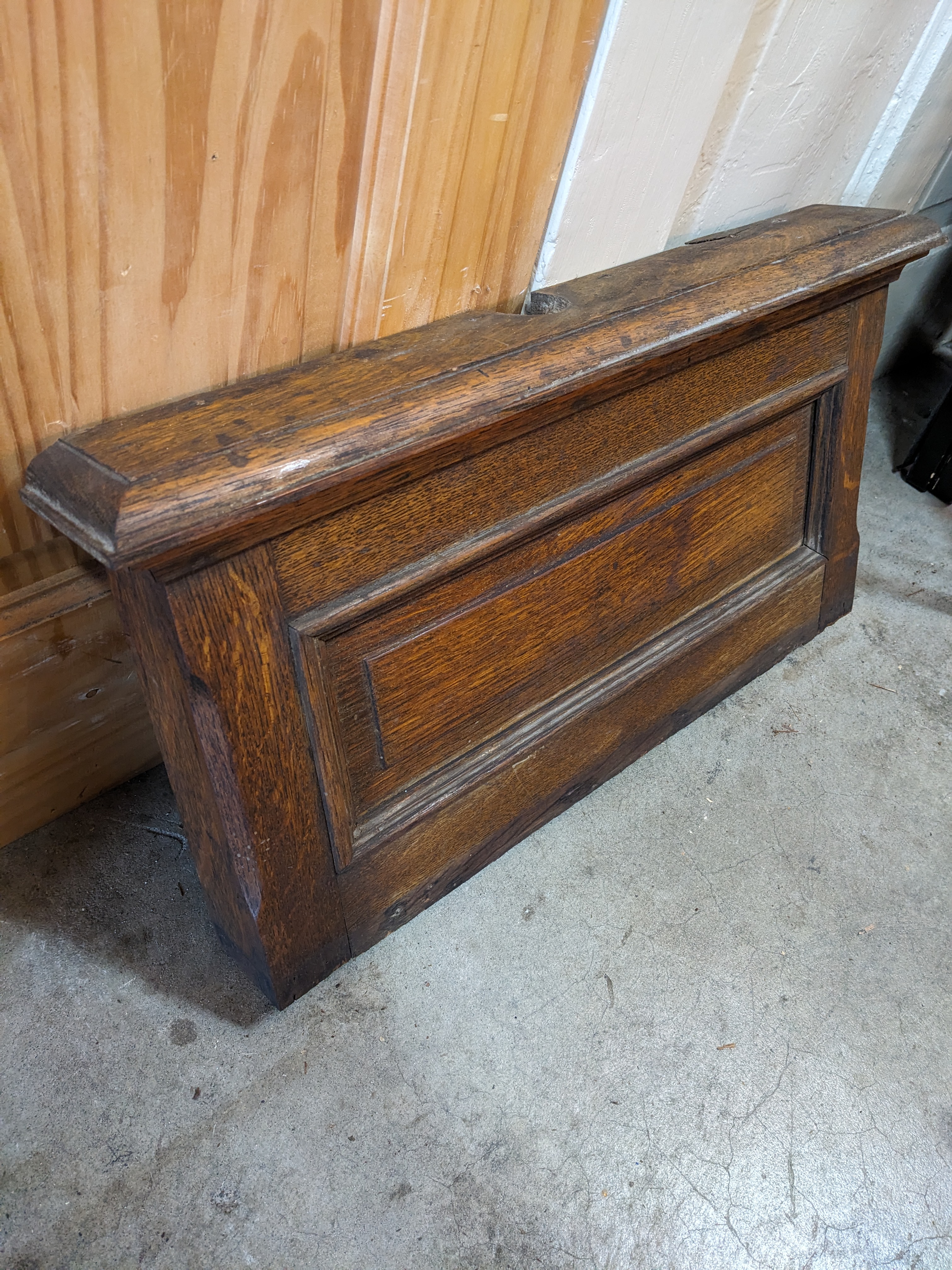 This antique rectangular Pediment likely dates back to the late 1800s. The style and material would be fitting of a turn of the century government office or other building of importance. This piece has some signs of wear reflective of its age. Please note the top and bottom of this item has been notched out for previous installation (pictured). It also has a crack in the wood on the top portion of this piece as well as a structural piece of wood on the backing (also pictured).