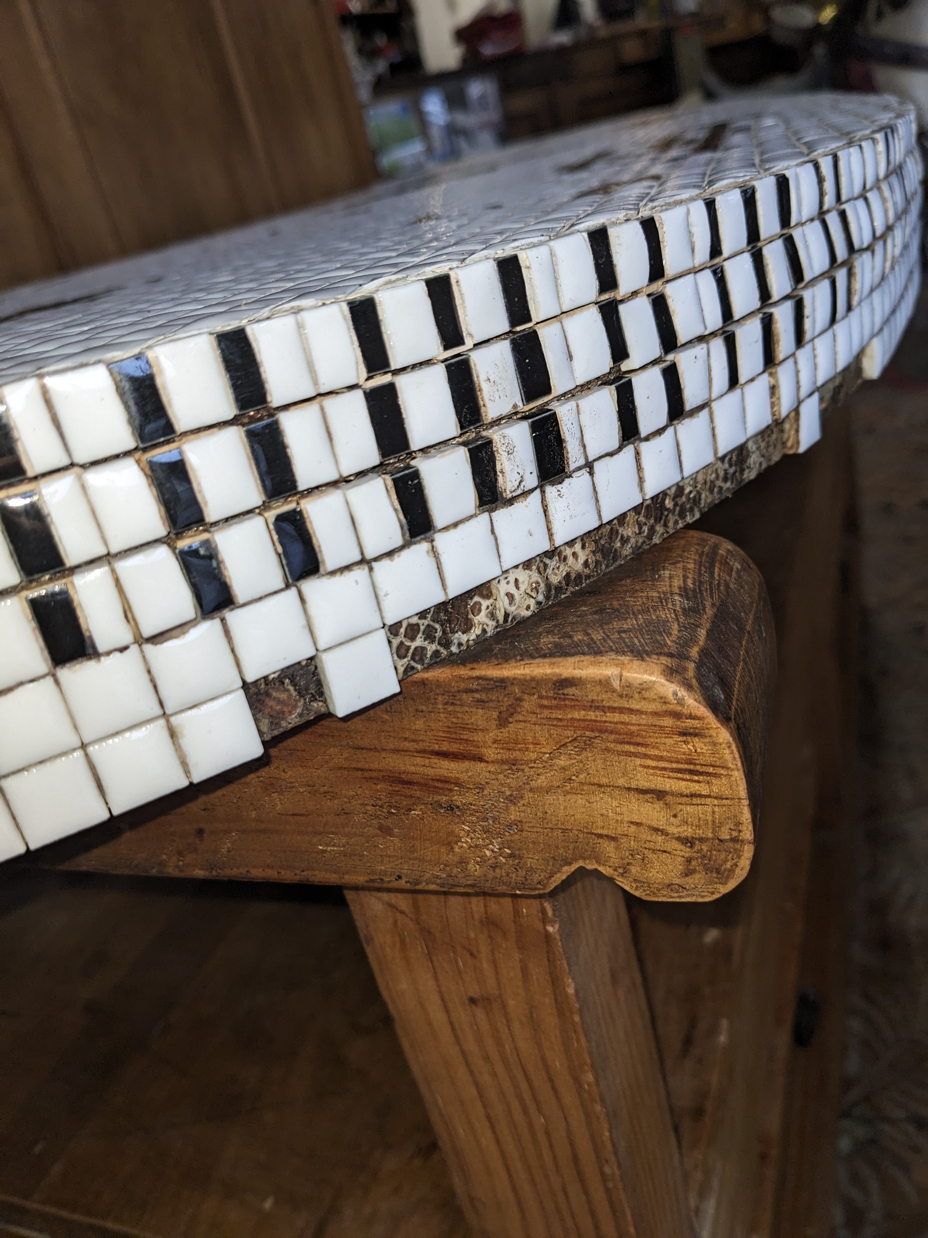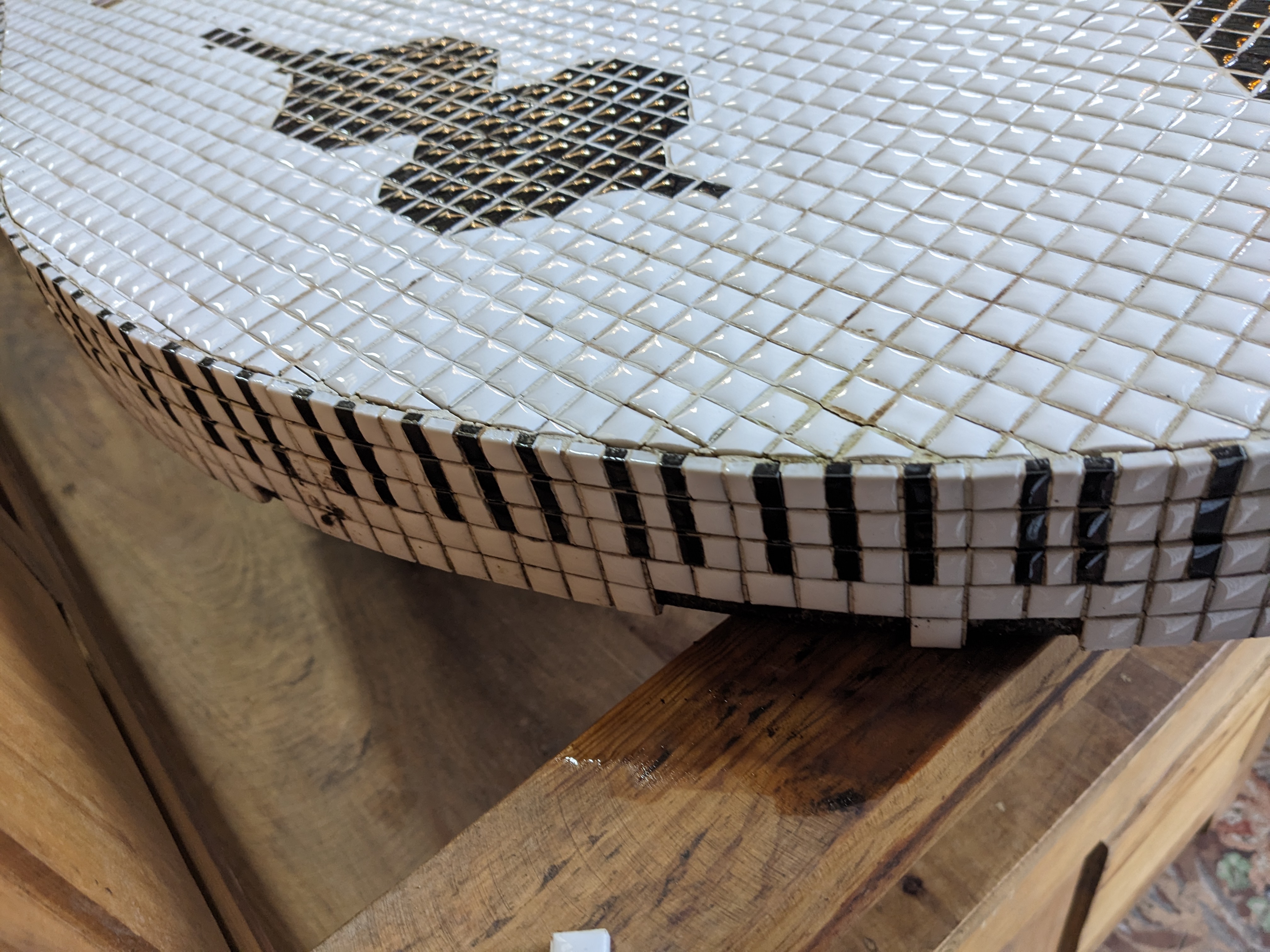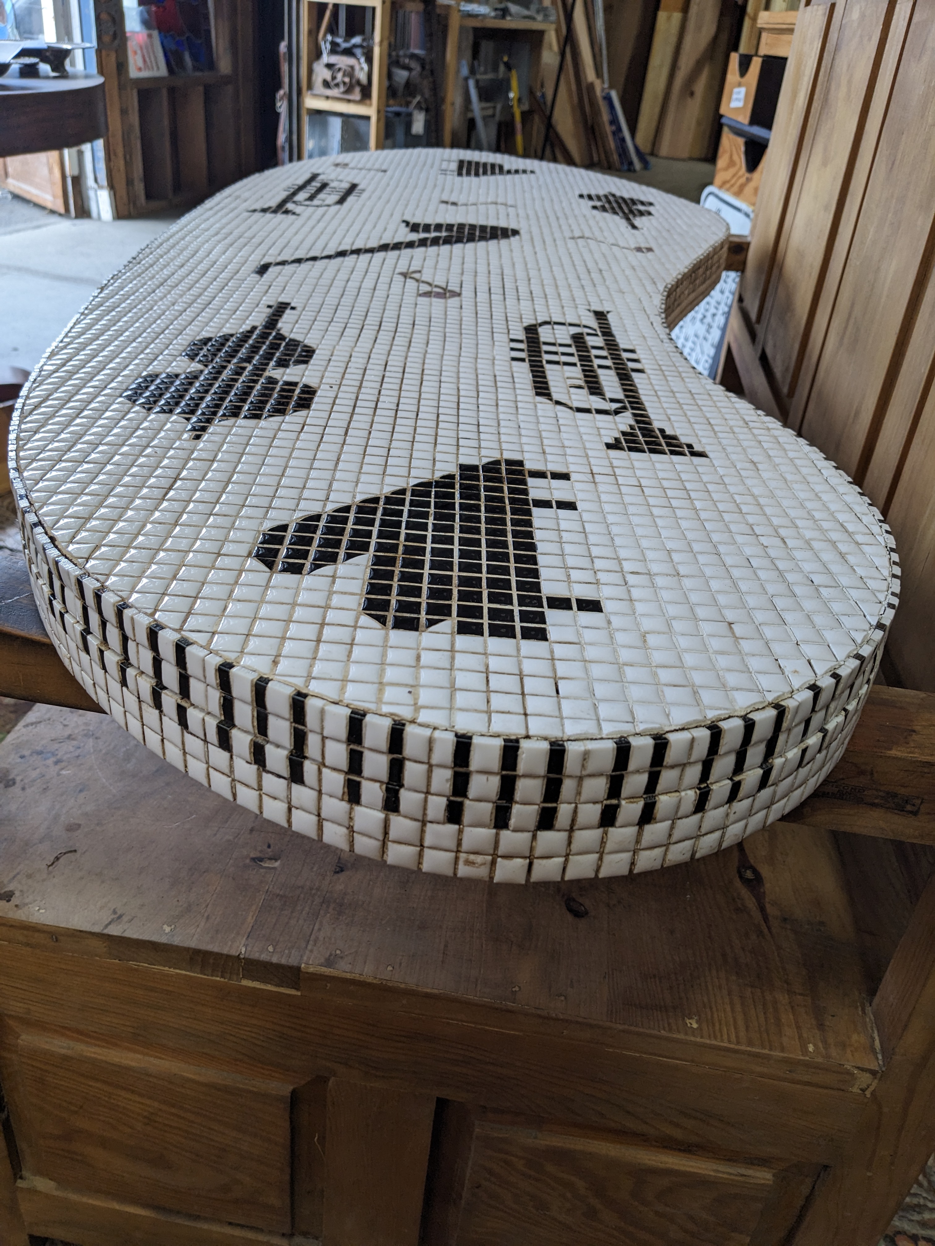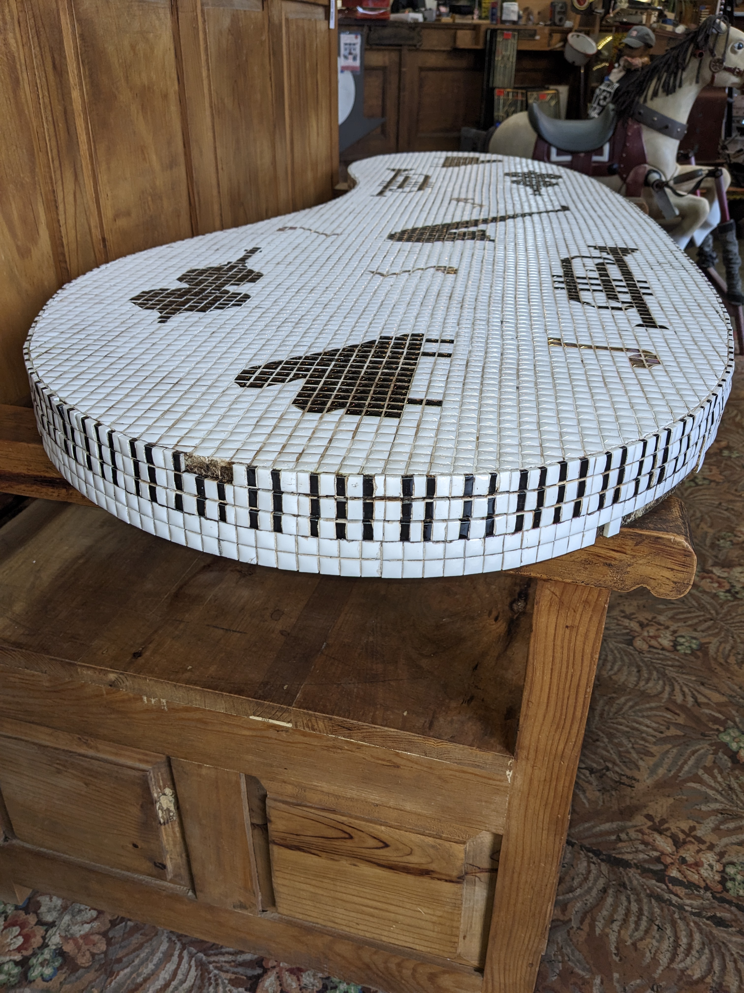 This music inspired table top appears to be hand made. It features fun imagery of piano keys, pianos, trumpets, violins, music notes and a saxophone.