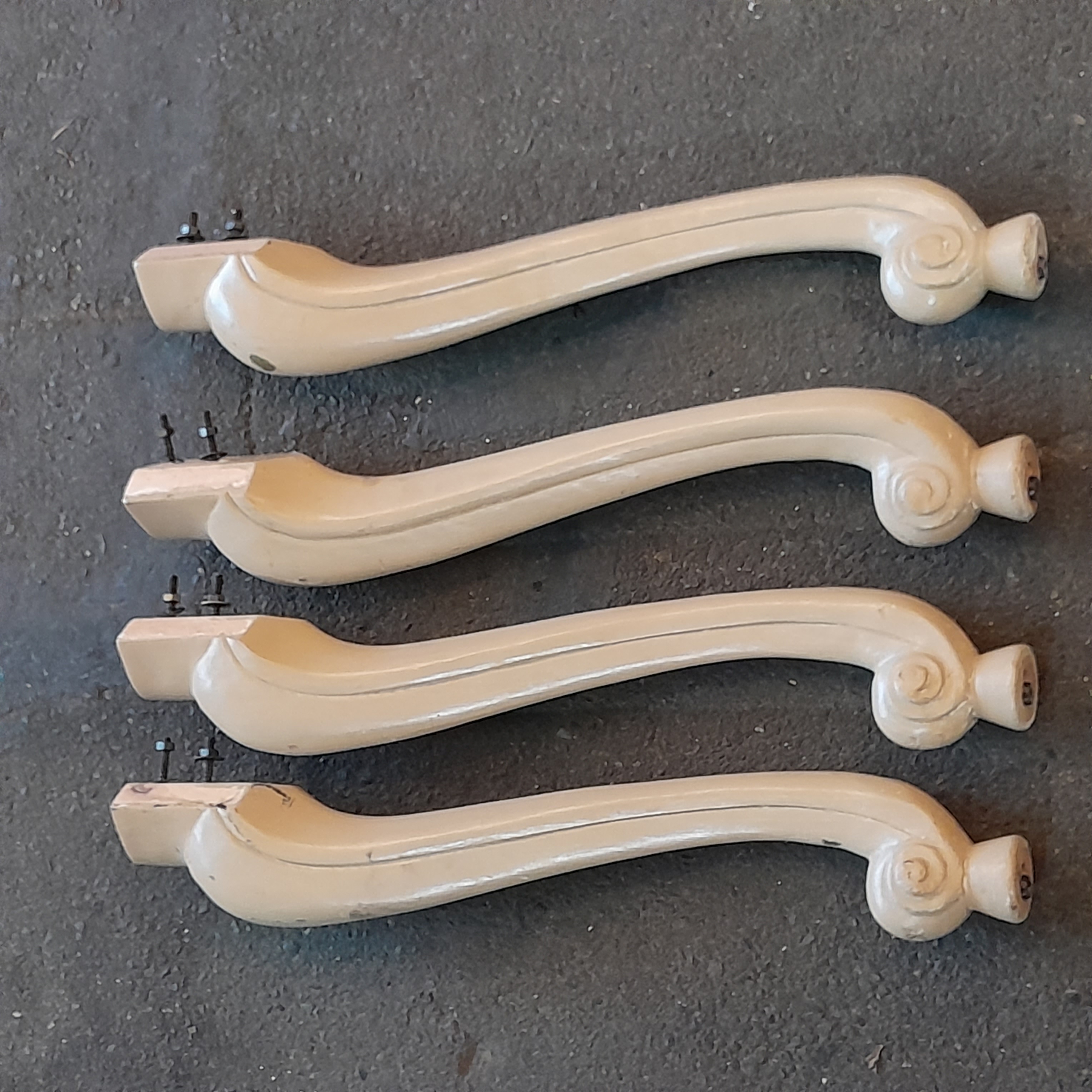 These originally came off a small table that had a damaged top. They are heavily painted. Some bumps scrapes and paint missing in places.