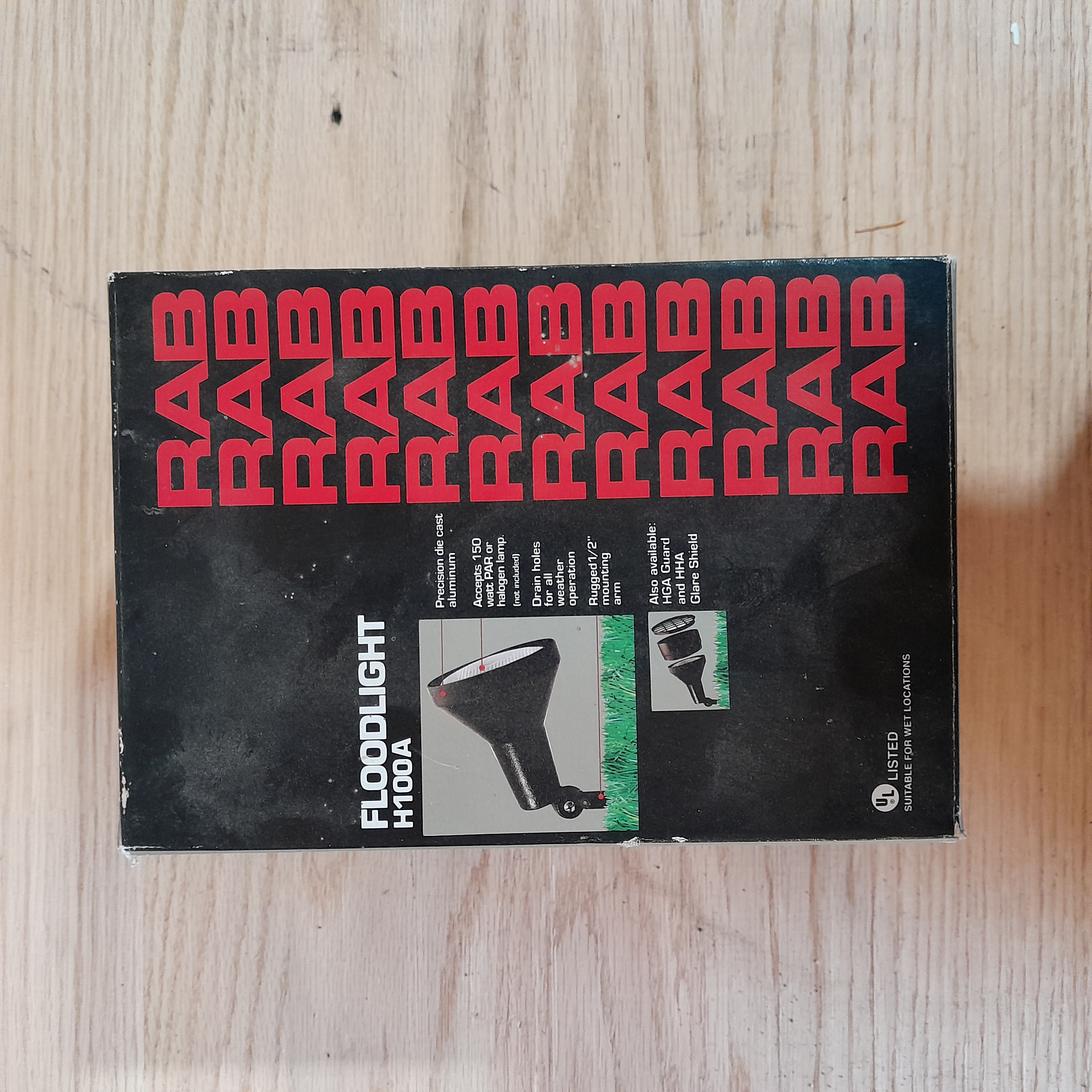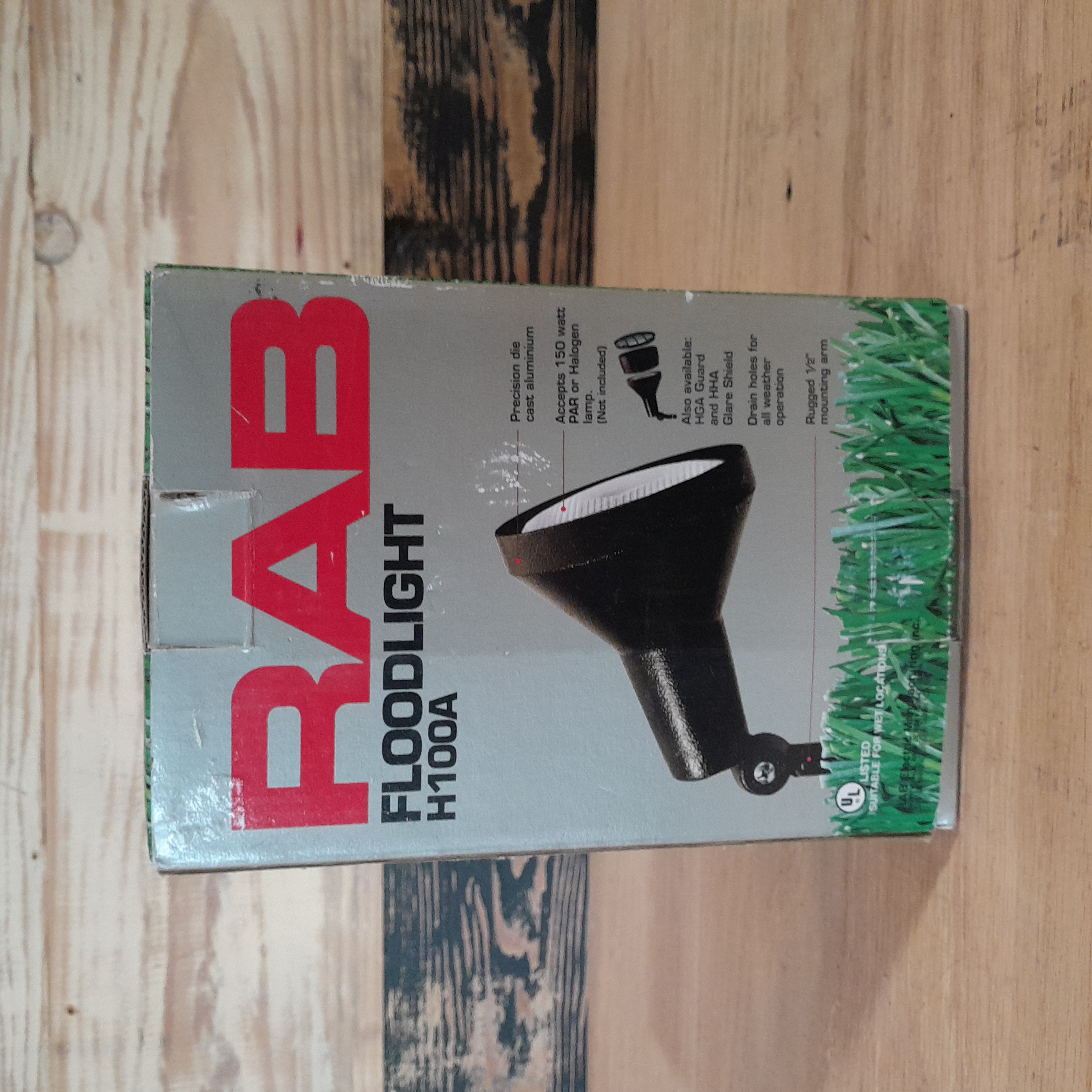 Let there be light. This RAB floodlight H100A is a cast aluminum composition with a half inch mounting arm. Accepts 150 Watt Par or Halogen Lamp. It even includes drainage holes for weather operations so that it is suitable to endure long times in wet locations. 5.5 inch diameter x 7.25 long.