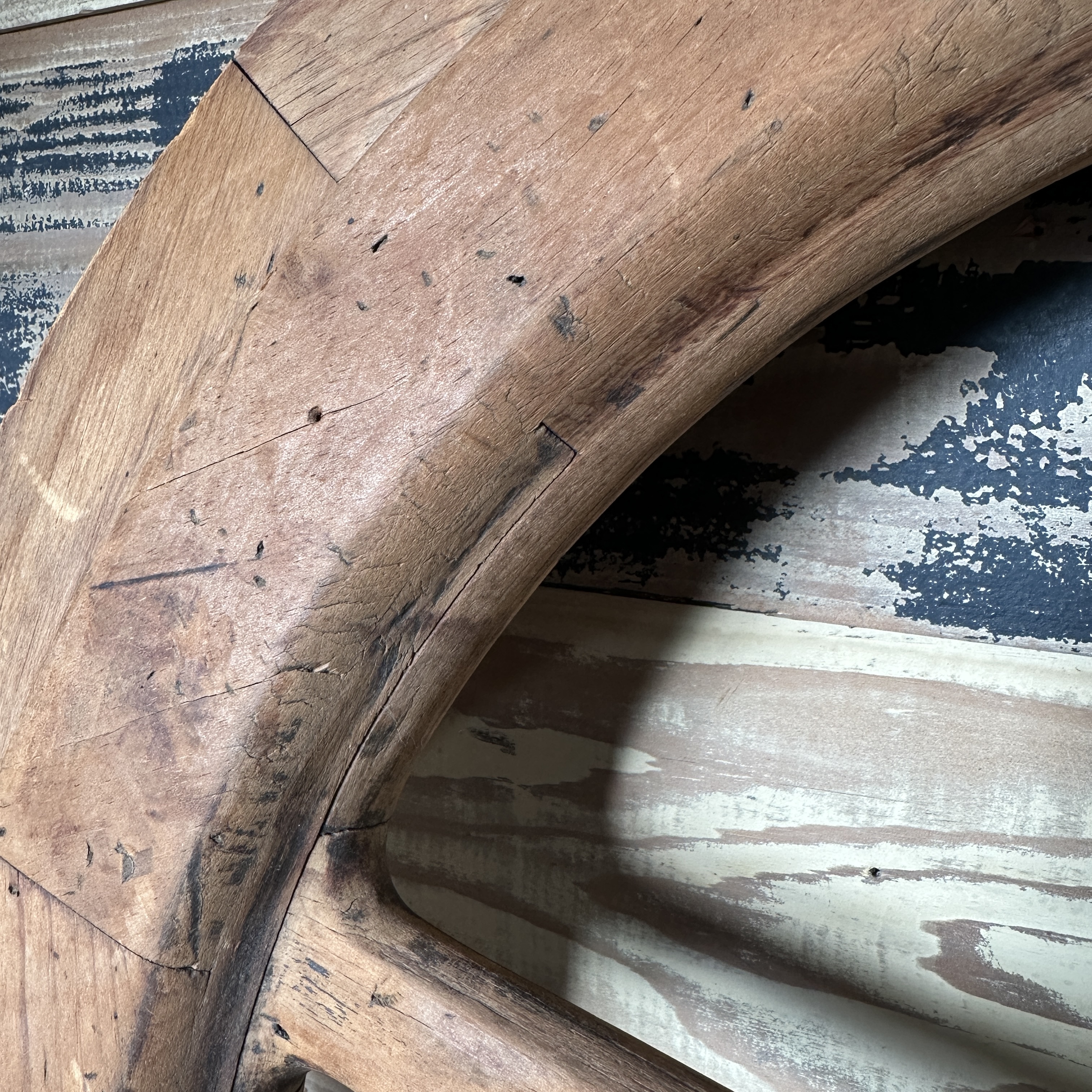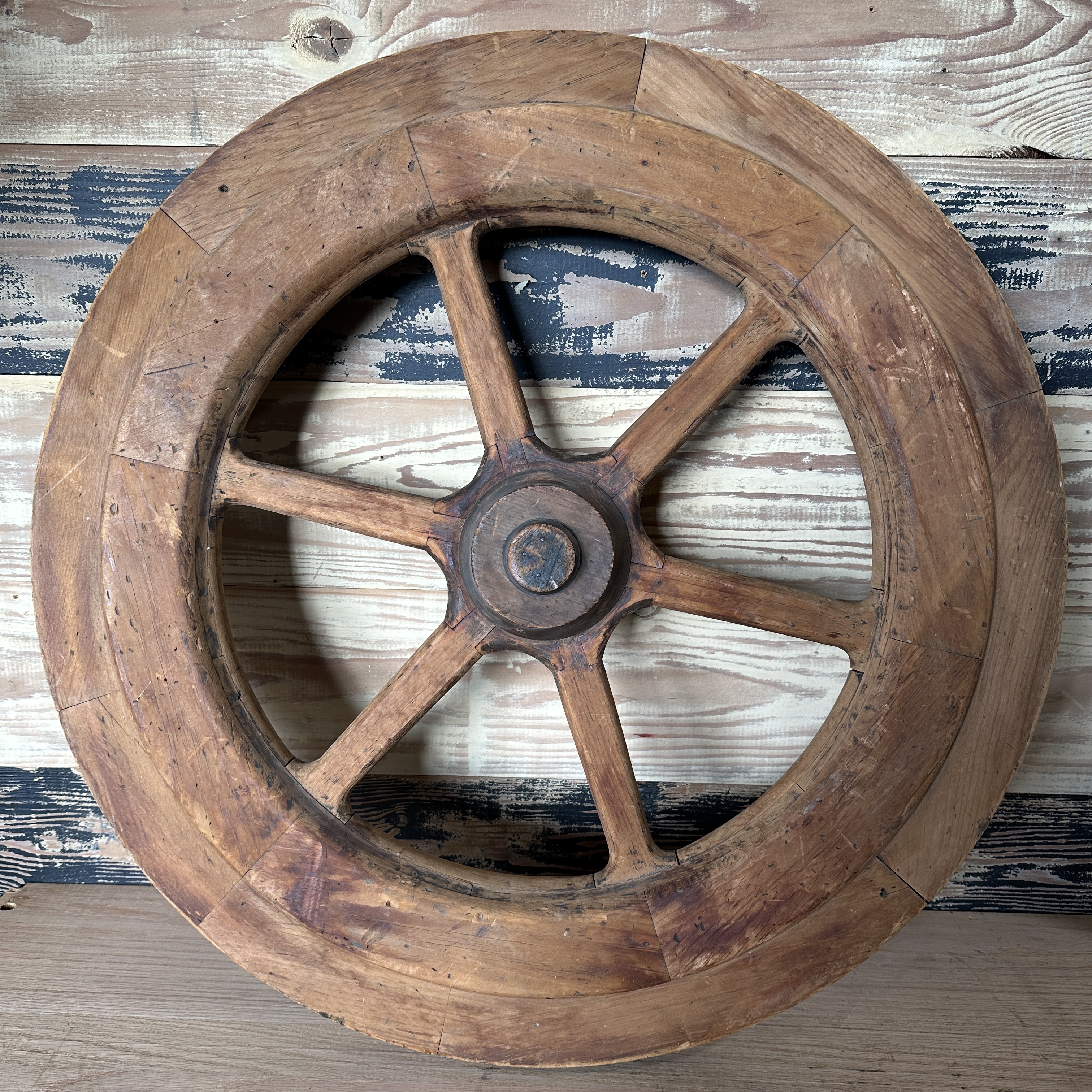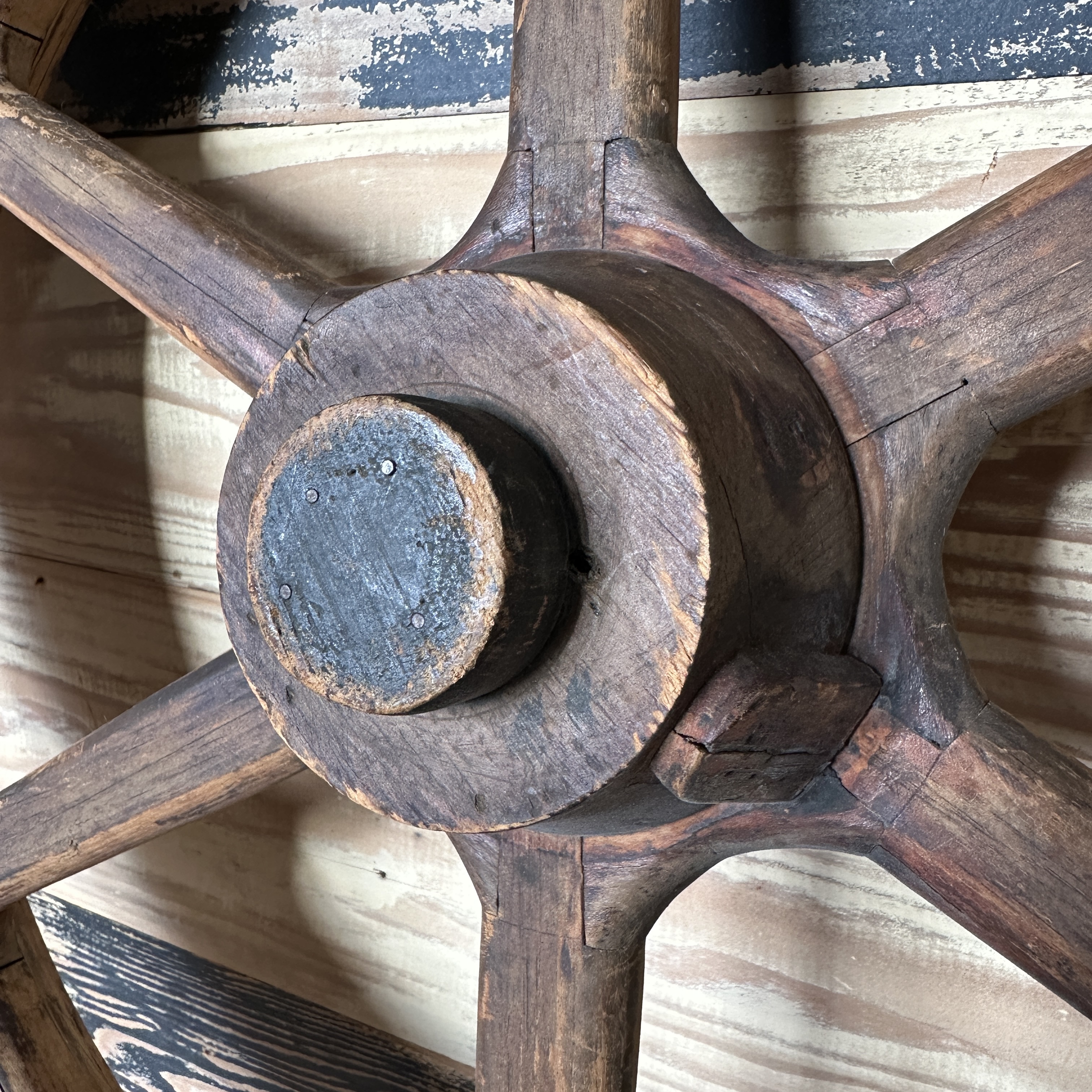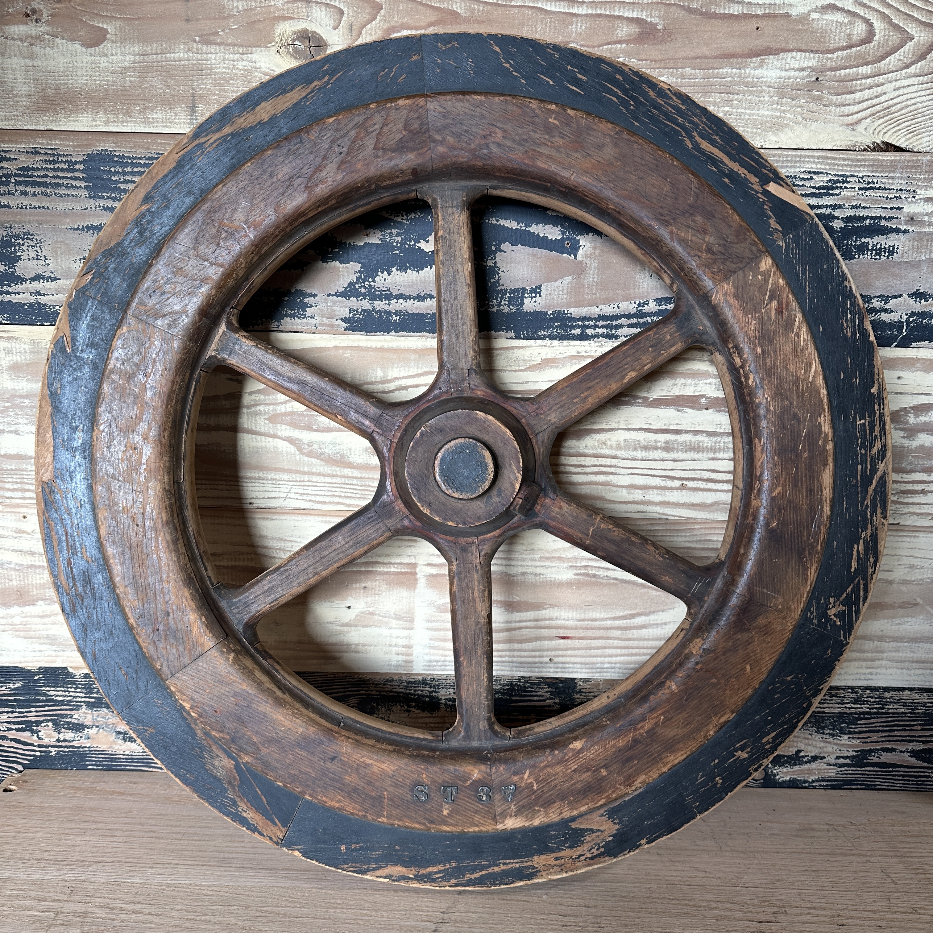 Antique decorative wagon wheel with ST37 in small metal letters/numbers on the edge.